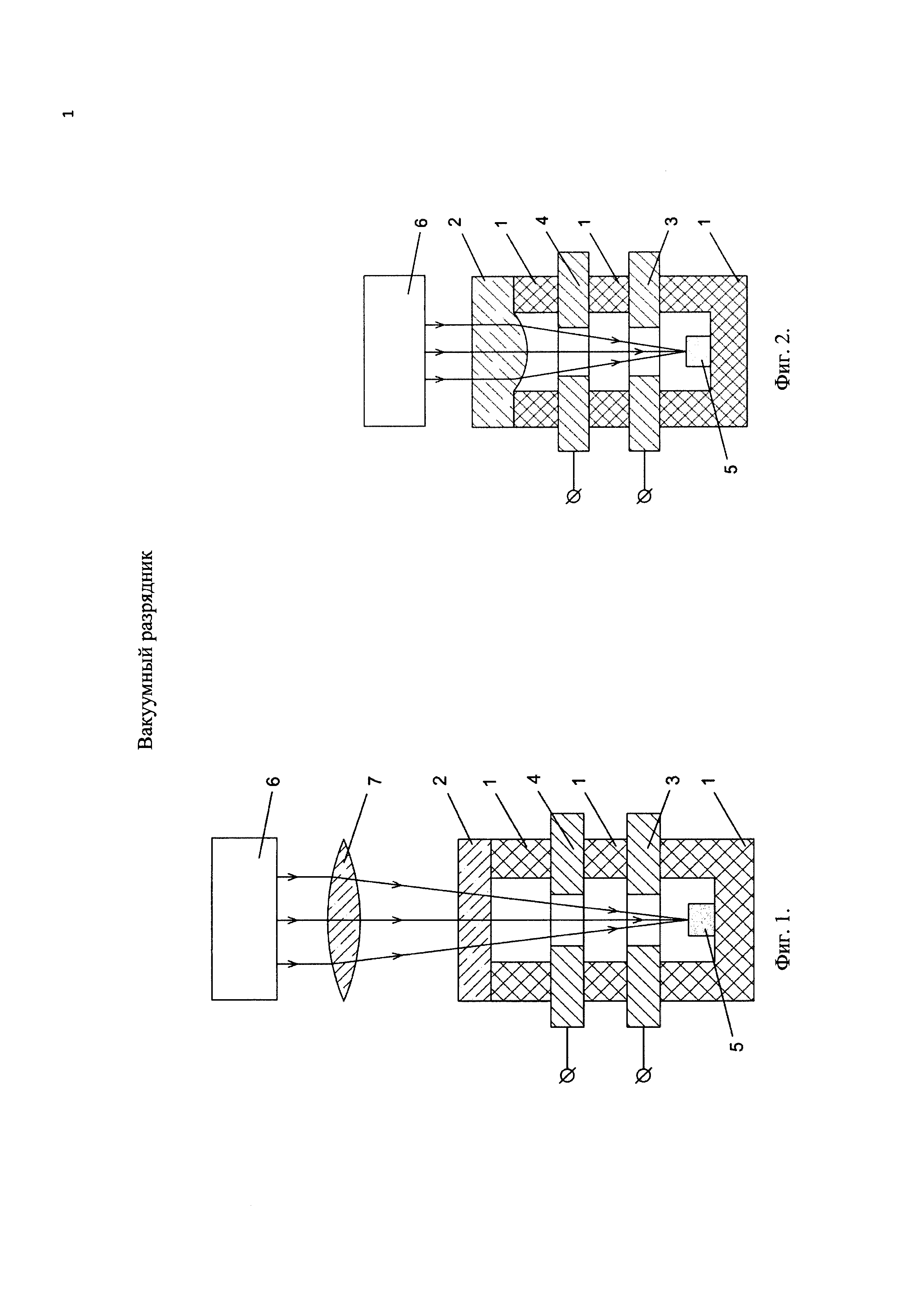 1. Вакуумный разрядник, включающий герметичную диэлектрическую оболочку, содержащую коаксиальную электродную систему из двух электродов и включающую оптически прозрачное окно для ввода управляющего сфокусированного импульсного оптического излучения по оси симметрии разрядника, отличающийся тем, что внутри оболочки на оси симметрии разрядника за пределами межэлектродного промежутка в точке фокуса расположена мишень из тугоплавкого материала, электроды имеют идентичную форму, каждый из электродов выполнен со сквозным отверстием для пропуска управляющего излучения в направлении мишени, отверстия расположены на оси симметрии разрядника, давление внутри герметичной оболочки разрядника составляет 10-2-100 Па. 2. Вакуумный разрядник по п. 1, отличающийся тем, что оптический элемент, фокусирующий управляющее излучение на мишени, расположен за пределами герметичной оболочки. 3. Вакуумный разрядник по п. 1, отличающийся тем, что окно выполнено в виде оптического элемента, фокусирующего управляющее излучение на мишени. 4. Вакуумный разрядник по п. 3, отличающийся тем, что окно выполнено в виде плоско-выпуклой линзы, выпуклая сторона которой находится на внешней поверхности оболочки.