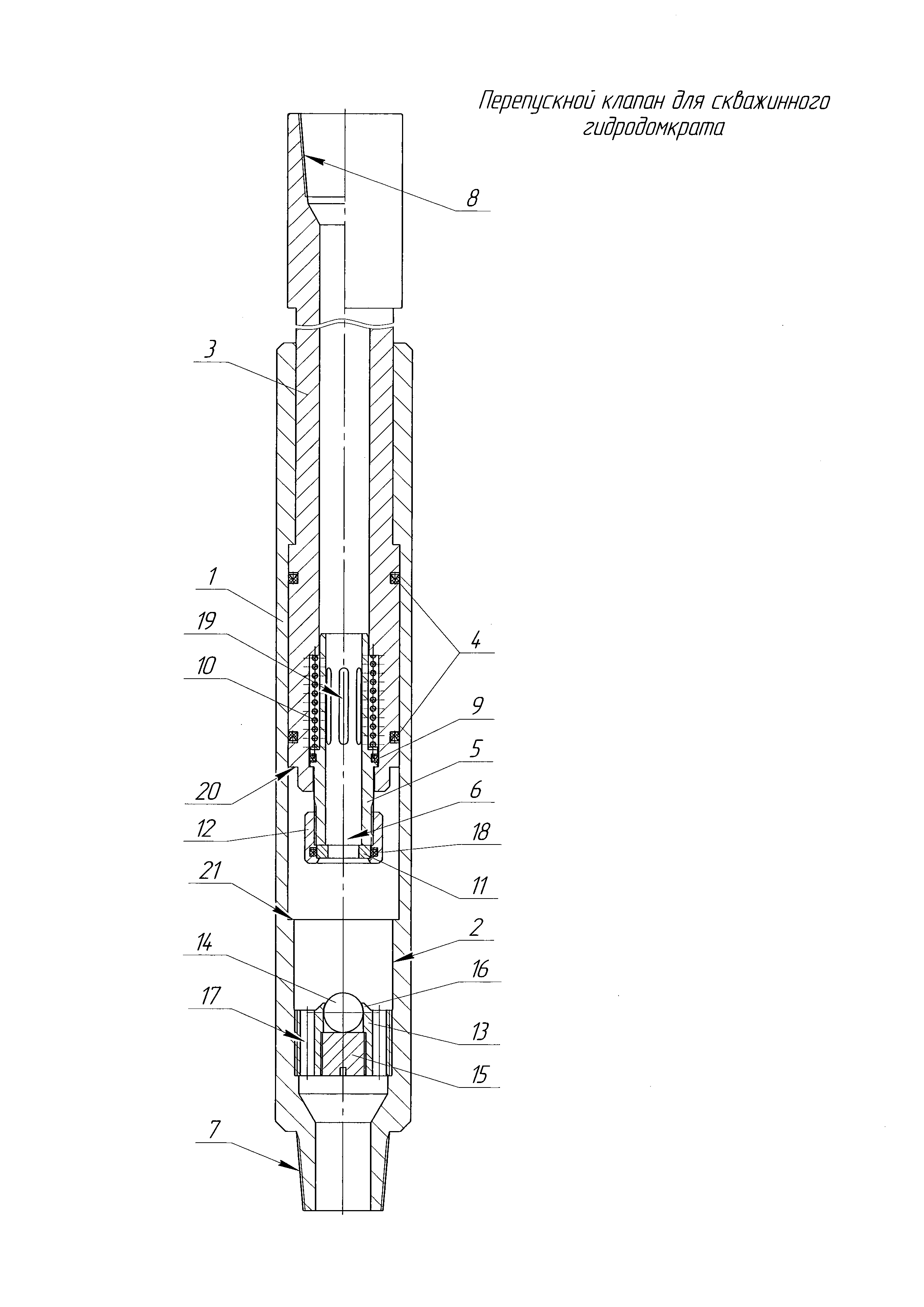 Перепускной клапан для скважинного гидродомкрата, расположенный выше расширяющей головки и ниже гидродомкрата, содержащий полую корпусную втулку с цилиндрическим сужением и полый шток, вставленный телескопически с возможностью ограниченного перемещения в корпусную втулку и оснащенный снизу ниппелем с наружным уплотнением, причем ниппель выполнен с возможностью герметичного перекрытия перепускного отверстия при перемещении штока вниз относительно корпусной втулки, а корпусная втулка и шток соединены соответственно с расширяющей головкой и гидравлическим домкратом, отличающийся тем, что ниппель вставлен герметично за счет наружного уплотнения в полый шток с возможностью ограниченного перемещения вверх и поджат пружиной вниз относительно штока, а перепускное отверстие выполнено снизу ниппеля и снабжено седлом клапана, при этом внутри цилиндрического сужения установлена вставка с клапаном сверху, вокруг которого выполнены перепускные каналы, причем клапан выполнен с возможностью герметичного взаимодействия с седлом и перекрытием перепускного отверстия при перемещении штока вниз относительно корпусной втулки, а ниппель в районе установки пружины оснащен радиальными технологическими отверстиями.
