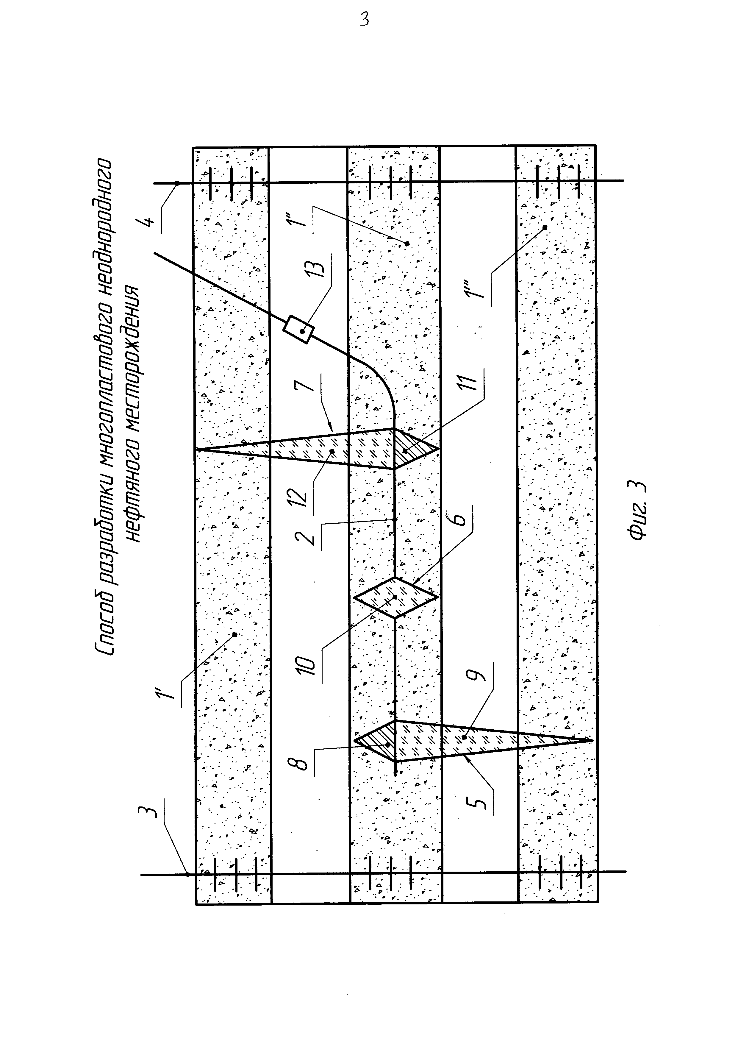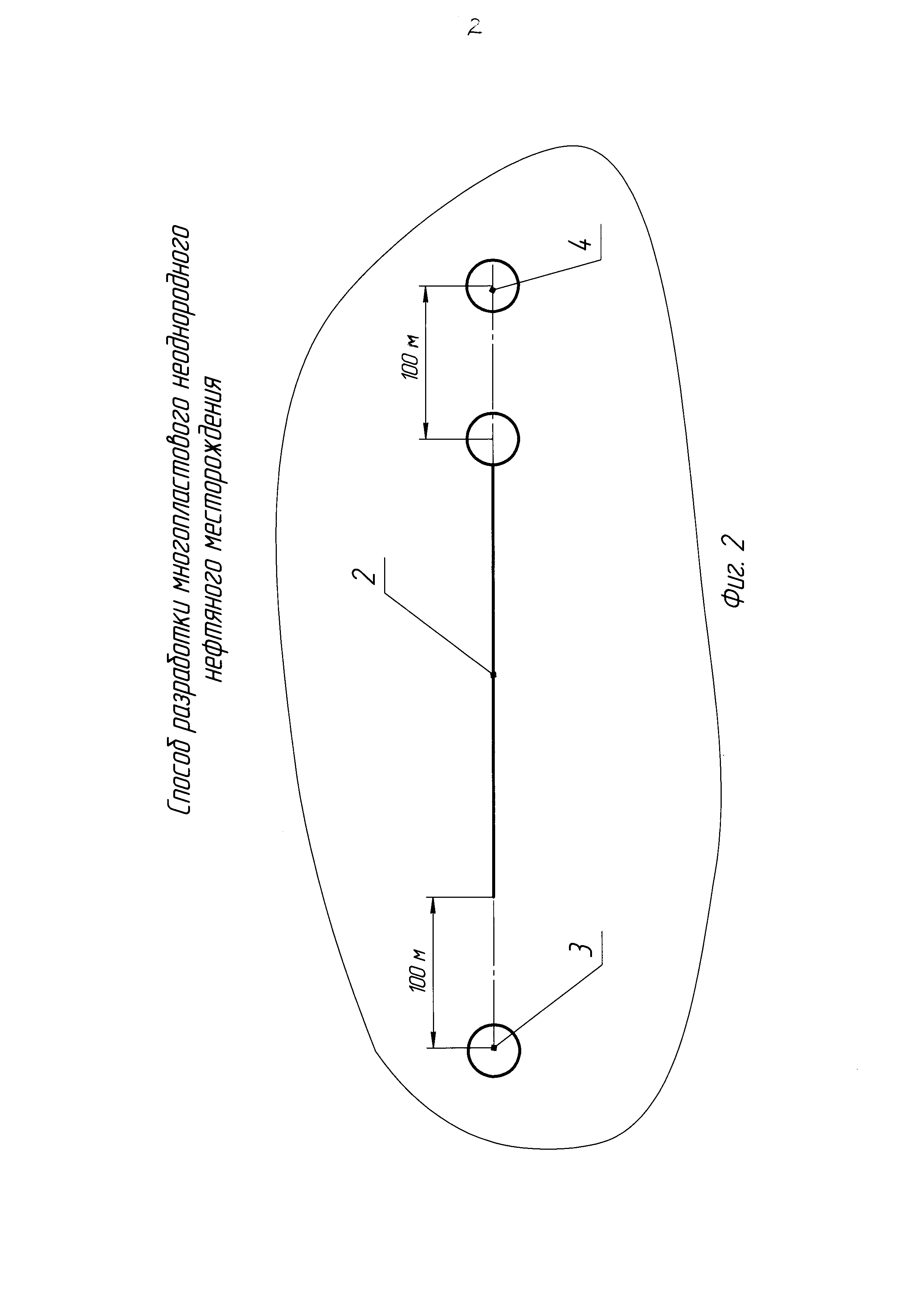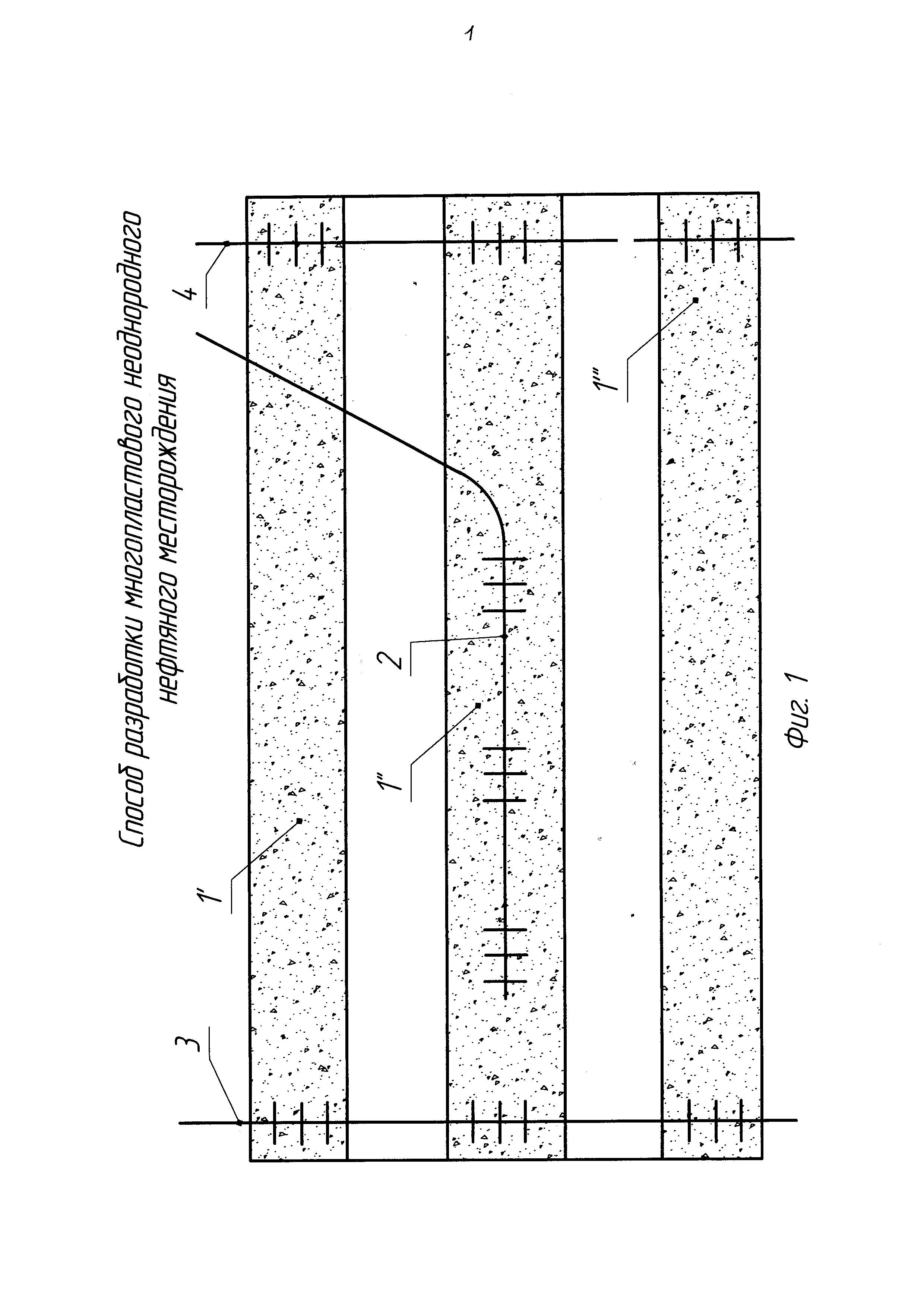 Изобретение относится к области разработки нефтяных месторождений, представленных многопластовыми неоднородными по проницаемости коллекторами. Известен способ разработки многопластового неоднородного нефтяного месторождения разветвленными горизонтальными скважинами (патент RU №2339801, МПК Е21В 43/20, опубл. 27.11.2008 г., бюл. №33), включающий бурение нагнетательных и добывающих скважин с вертикальными и горизонтальными и/или субгоризонтальными стволами при определенном размещении в каждом продуктивном пласте, бурение из горизонтальных и/или субгоризонтальных стволов горизонтальных, и/или субгоризонтальных, и/или вертикальных разветвлений с пересечением непроницаемых пропластков, крепление обсадной колонны, закачку вытесняющей жидкости и добычу продукции скважины. Причем при бурении горизонтальных и/или субгоризонтальных стволов определяют границы зон с различной проницаемостью, пересекаемых этими стволами. Количество разветвлений определяют в зависимости, прямо пропорциональной запасам нефти, обратно пропорциональной проницаемости зон коллектора, и из условия обеспечения равномерной выработки запасов месторождения. Затем в горизонтальных и/или субгоризонтальных скважинах устанавливают пакер на границе зон коллекторов, отличающихся проницаемостями в 1,5 и более раз в зоне непроницаемого пропластка, а отбор продукции осуществляют при поддержании забойного давления для каждой выбранной зоны. Недостатками способа являются: - во-первых, сложный технологический цикл осуществления способа, связанный с зарезкой из одной зоны коллектора горизонтальной скважины нескольких разветвлений и ее проводкой ограниченной мощностью самого коллектора; - во-вторых, дороговизна осуществления способа, что связано с большими финансовыми и материальными затратами, так как в коллекторах (зонах с различной проницаемостью) из горизонтальных и/или субгоризонтальных стволов бурят разветвления, причем количество разветвлений определяют в зависимости, прямо пропорциональной запасам нефти, обратно пропорциональной проницаемости зон; - в-третьих, в процессе длительной разработки многопластового неоднородного нефтяного месторождения происходят снижение продуктивности или обводнение одного или нескольких коллекторов с зонами различной проницаемости, при этом не предусмотрены работы по интенсификации, и/или водоизоляции, или отключению обводнившихся коллекторов. Наиболее близким по технической сущности и достигаемому результату является способ разработки многопластового неоднородного нефтяного месторождения (патент RU №2459934, МПК Е21В 43/14, опубл. 27.08.12 г., бюл. №24), включающий бурение нагнетательных и добывающих скважин с вертикальными и горизонтальными стволами при определенном размещении в каждом продуктивном пласте, выделение продуктивных пластов с различной проницаемостью, разделенных непроницаемыми пропластками, крепление обсадных колонн и их перфорацию, а также установку пакеров на границе продуктивных пластов, закачку вытесняющей жидкости и отбор продукции скважин, при этом стволы добывающих скважин выполняют наклонно направленными под углом 45-87°. Напротив всех продуктивных пластов с различной проницаемостью производят разнонаправленное вскрытие суммарным сечением перфорационных каналов не менее 3⋅104 мм2. По