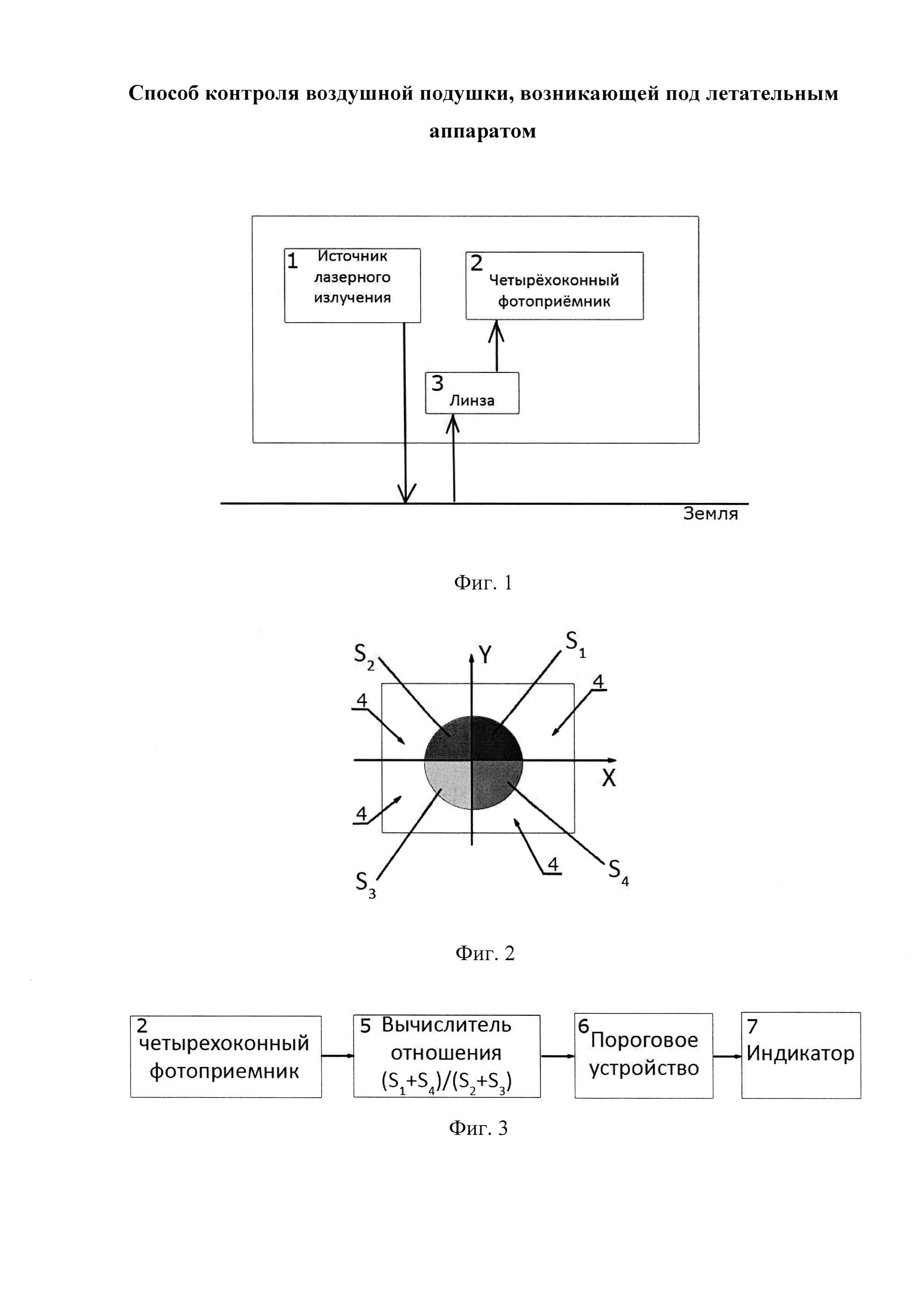 Способ относится к средствам повышения безопасности полета летательных аппаратов на малых высотах. Одной из вероятных причин катастрофы АН-12 в Иркутске является отсутствие возможности у пилота учитывать влияние воздушной подушки на величину подъемной силы при полете на малой высоте. После пролета над лесным массивом плотность воздушной среды резко понизилась, воздушная подушка исчезла и самолет резко потерял высоту. Известен метод контроля метеотурбулентности и метеообразований, основанный на отражении радиосигнала от неоднородностей атмосферы, реализованный в аппаратуре «РЛС Контур-10Ц», разработки ООО «Контур-НИИРС» (Россия, г. С-Петербург) [http://www.kontur-niirs.ru/items/6/#tab1]. Недостатки метода: 1) Не обеспечивает контроль среды под поверхностью самолета. 2) Высокое энергопотребление. 3) Большие габариты и масса. Наиболее близким аналогом является способ контроля метеообразований, турбулентности и сдвига ветра по курсу полета самолета, реализованный в системе «WXR-2100» (США) [https://www.rockwellcollins.com/Data/Products/Radar_and_Surveillance/Weather_Radar/WXR-2100_Weather_Radar_System.aspx]. Недостатки метода: 1) Метод не работает на малых высотах полета (порядка 10 метров). 2) Метод не измеряет параметры воздушной подушки под поверхностью самолета. 3) Высокие энергопотребление и массогабаритные размеры. Техническим результатом заявляемого способа является возможность регистрации воздушной подушки, возникающей под самолетом при малых высотах полета. Заявленный технический результат достигается тем, что на борту летательного аппарата устанавливают лазерный излучатель, направляют лазерный луч под углом к вертикали в сторону поверхности земли, регистрируют угол прихода луча, отраженного от поверхности земли, по изменению угла прихода отраженного луча определяют изменения плотности воздушной среды и судят о наличии воздушной подушки под летательным аппаратом. Изменение угла прихода отраженного луча происходит вследствие явления рефракции излучения в неоднородной воздушной среде. Соответственно, при изменении плотности воздушной среды будет меняться угол прихода отраженного луча. Заявленное изобретение поясняется фигурами. На фиг. 1 показана схема устройства, реализующего данный способ. На фиг. 2 показан четырехоконный фотоприемник. На фиг. 3 показана схема обработки сигала фотоприемника. На борту самолета устанавливается единый блок устройства, состоящий из источника лазерного излучения 1 с длиной волны 0.4 мкм, четырехоконного фотоприемника 2 на фотодиоде ФД-19КК, имеющем четыре фоточувствительные площадки 4 [Меркишин Г.В. Многооконные оптико-электронные датчики линейных размеров. - М.: Радио и связь, 1986. - 168 с., ил., с. 16] и линзы 3. Выходные сигналы фотоприемных площадок 4 пропорциональны засвеченной поверхности S1, S2, S3, S4 (Фиг. 2). Смещение луча в направлении оси X определяют по величине отношения На выходе четырехоконного фотоприемника установлен вычислитель 5, реализующий вычисление отношения Превышение сигнала на выходе вычислителя 5 уровня порога свидетельствует об изменении плотности воздушной среды. Индикатор 7 создает сигнал оповещения пилота о необходимости контроля рельефа поверхности под самолетом. Для надежной работы уровень порога выбирают из условия превышения сигнала над шумом в 10 раз.