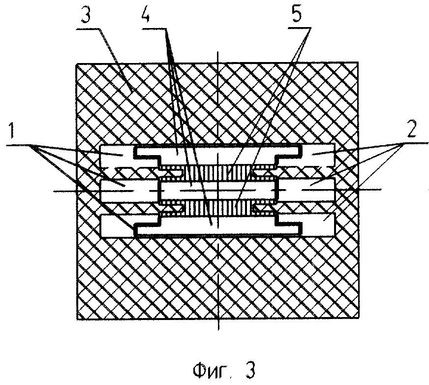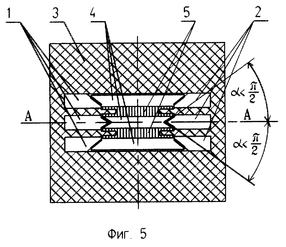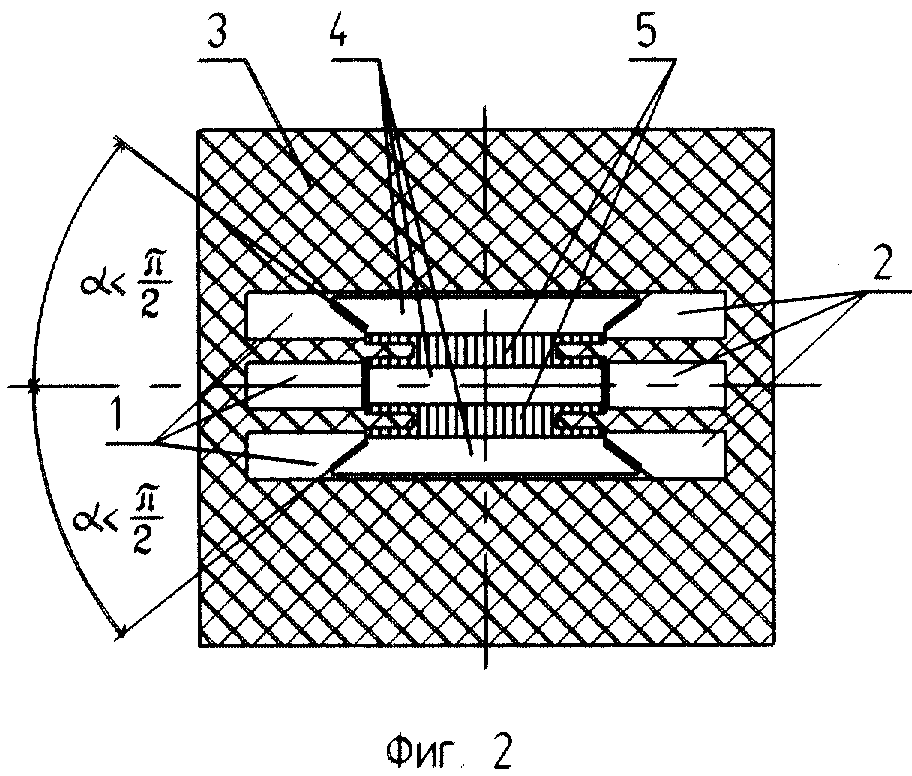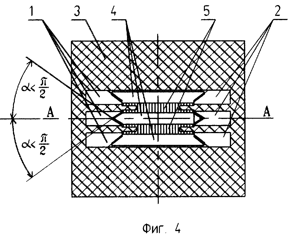 варианта исполнения с наклонной контактной поверхностью рельсов и перемычек к плоскости продольного сечения пары рельсов. На фиг.3 показан чертеж поперечного сечения канала рельсотронного ускорителя