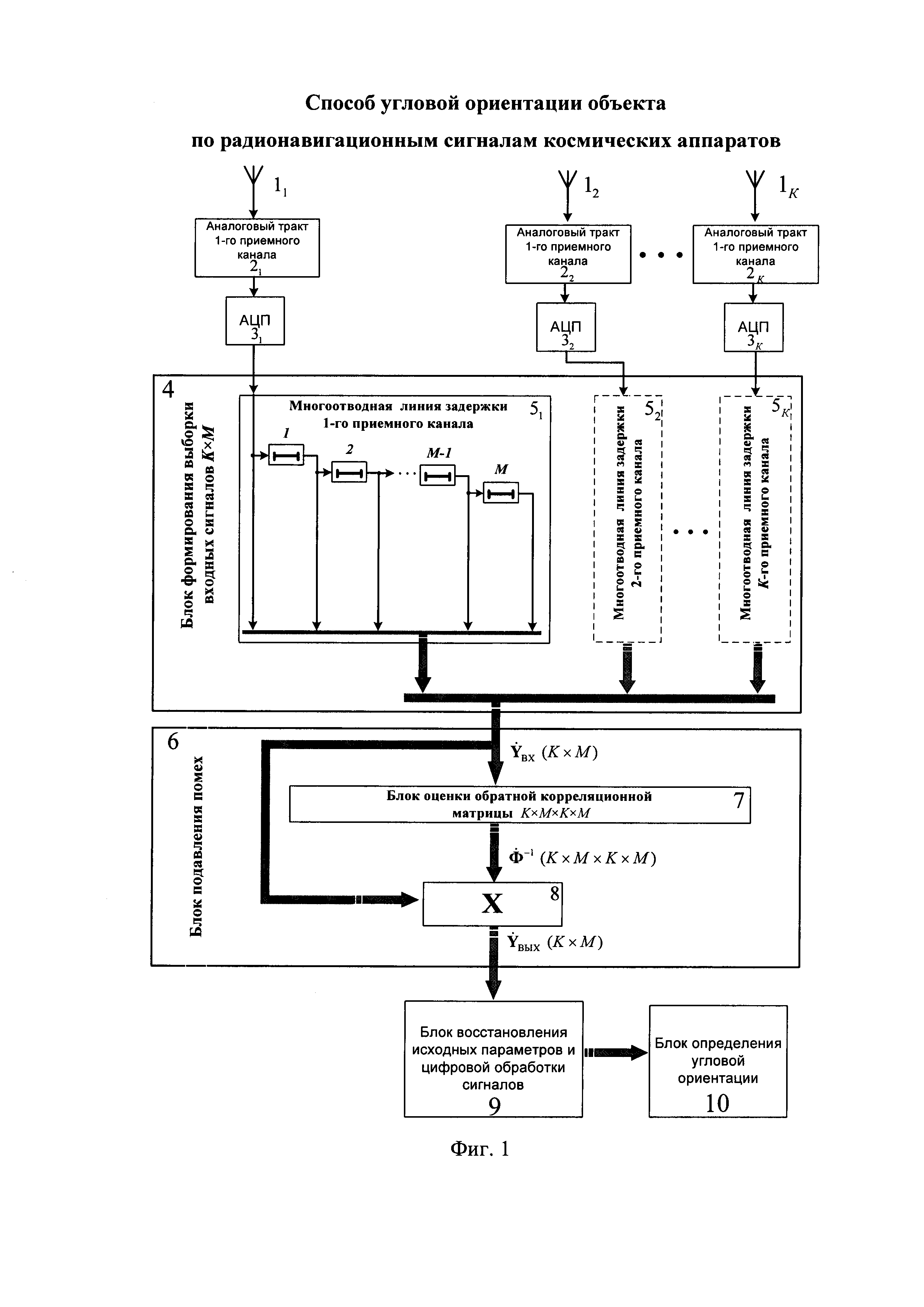 поступают на вход блока 9 восстановления исходных параметров и цифровой обработки сигналов. При дискретной задержке входных сигналов и расчете весовых коэффициентов для подавления помех изменяются также и фазовые соотношения радионавигационных сигналов от каждого НКА. В результате искажения фазовых сдвигов при подавлении помех информация об угловой ориентации искажается, и измерения становятся недействительными.