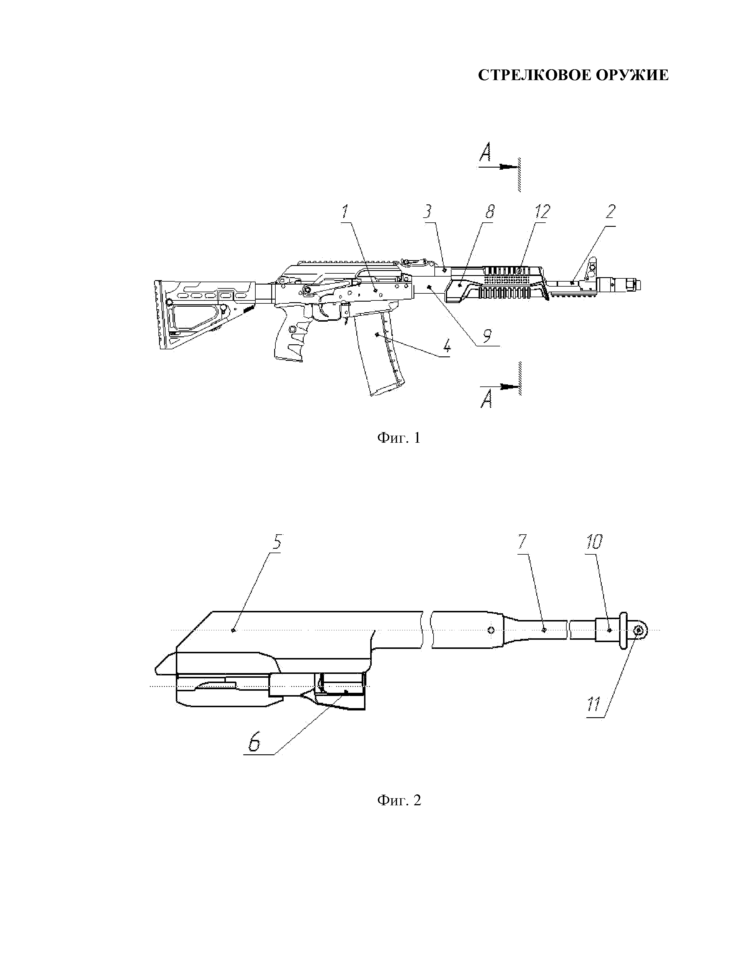 Стрелковое оружие, содержащее ствольную коробку со стволом, жестко закрепленную направляющую трубку, механизм перезаряжания, включающий затворную раму, подвижное цевье, отличающееся тем, что затворная рама снабжена наконечником с поперечным отверстием, в которое устанавливается ось цевья, соединяющая наконечник с цевьем, на боковых сторонах трубки выполнены пазы, имеющие расширенный конец, обращенный к ствольной коробке, а на оси цевья выполнены кольцевые канавки с возможностью продольного перемещения по пазам.