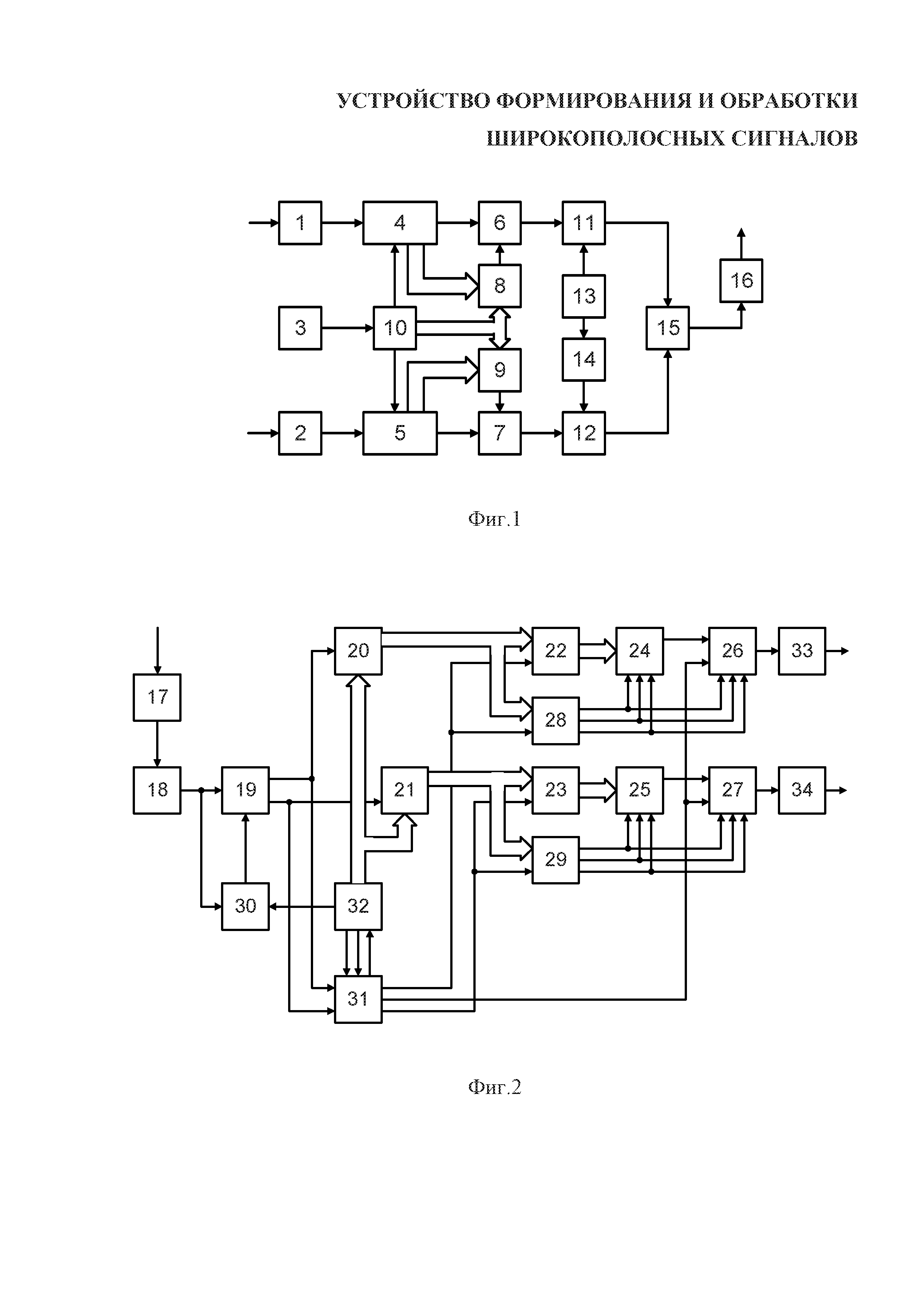 1. Устройство формирования и обработки широкополосных сигналов, содержащее в формирующей части синфазный и квадратурный каналы, выполненные идентично, в состав каждого из которых входят последовательно соединенные кодер и последовательно-параллельный преобразователь, причем вход кодера является входом информационного сигнала, последовательно соединенные первый и второй модуляторы; а также содержащее последовательно соединенные генератор чиповой частоты и генератор псевдослучайной последовательности (ПСП), управляющие выходы которого подключены к соответствующим считывающим входам последовательно-параллельных преобразователей синфазного и квадратурного каналов, последовательно соединенные генератор несущей частоты и фазовращатель на 90°, причем выход генератора несущей частоты соединен со вторым входом второго модулятора синфазного канала, а выход фазовращателя соединен со вторым входом второго модулятора квадратурного канала; суммирующий усилитель, первый и второй входы которого соединены с выходами вторых модуляторов, а выход является выходом формирующей части устройства; содержащее в обрабатывающей части синфазный и квадратурный каналы, выполненные идентично, в состав каждого из которых входят блок выбора максимума, параллельно-последовательный преобразователь и декодер, выход которого является выходом информационного сигнала, а вход соединен с выходом параллельно-последовательного преобразователя; выходы блока выбора максимума являются входами параллельно-последовательного преобразователя; также содержащее усилитель, вход которого является входом обрабатывающей части устройства, последовательно соединенные блок поиска и синхронизации по задержке и генератор ПСП, первый и второй выходы которого соединены с первым и вторым входами блока поиска и синхронизации по задержке, второй выход которого соединен с входами синхронизации блоков выбора максимума и с управляющими входами параллельно-последовательных преобразователей; отличающееся тем, что в формирующей части в состав синфазного и квадратурного каналов введен генератор М-последовательности, у которого входы записи начального состояния соединены с выходами последовательно-параллельного преобразователя, вход разрешения записи начального состояния объединен со считывающим входом последовательно-параллельного преобразователя, а выход соединен с первым входом первого модулятора, причем тактовые входы генераторов М-последовательности подключены к выходу генератора чиповой частоты, а вторые входы первых модуляторов синфазного и квадратурного каналов соединены с первым и вторым выходами генератора ПСП, в обрабатывающей части в состав синфазного и квадратурного каналов введены два идентичных подканала, состоящих из последовательно соединенных умножителя, блока перестановки отсчетов и блока преобразования Уолша, блок объединения квадратур, выход которого соединен с входом блока выбора максимума, а первый и второй входы соединены со выходами блоков преобразования Уолша синфазного и квадратурного каналов, также введены генератор частоты дискретизации, блок аналого-цифрового преобразования и два регистра-дециматора, причем выход генератора частоты дискретизации соединен с первым входом блока аналого-цифрового прео