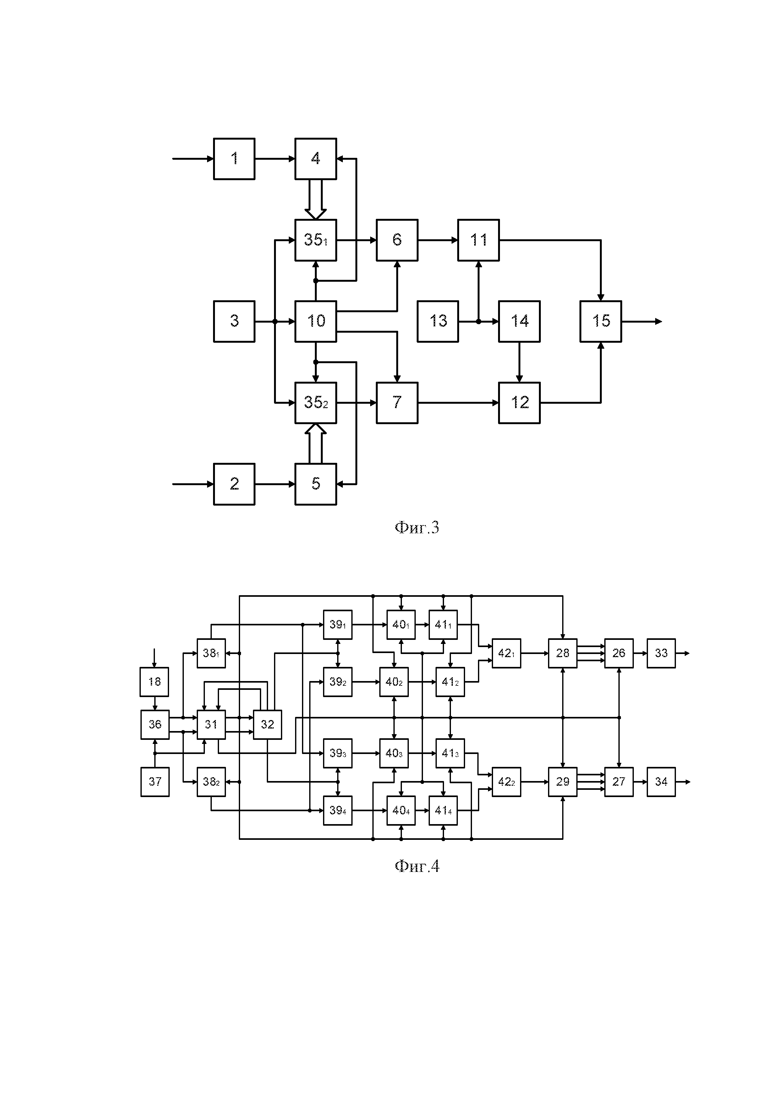 Предлагаемое устройство относится к системам радиосвязи и может найти применение в широкополосных системах радиосвязи на основе расширения спектра. Наиболее близким по технической сущности к заявляемому устройству является устройство передачи и приема дискретной информации с использованием широкополосных сигналов при кодовом разделении каналов, описанное в [1], принятое за прототип. Устройство [1] по функциональности и алгоритму работы аналогично заявляемому устройству. Устройство-прототип содержит передатчик и приемник, функциональные схемы которых приведены на фиг. 1 и фиг. 2 соответственно. На фиг. 1 приняты следующие обозначения: 1, 2 – кодеры (КД); 3 – генератор чиповой частоты (ГЧЧ); 4, 5 – последовательно-параллельные преобразователи (ПР); 6, 7, 11, 12 – модуляторы (МД); 8, 9 – коммутаторы (КМ); 10 – генератор псевдослучайной последовательности (ГПСП); 13 – генератор несущей частоты (ГНЧ); 14 – фазовращатель (Ф); 15 – суммирующий усилитель (СУ); 16 – антенна (А). Передатчик содержит генератор чиповой частоты (ГЧЧ) 3, генератор псевдослучайной последовательности (ГПСП) 10, генератор несущей частоты (ГНЧ) 13, фазовращатель (Ф) 14 на 90°, суммирующий усилитель (СУ) 15 и антенну (А) 16; кроме того, передатчик содержит два идентичных канала – синфазный и квадратурный, каждый из которых состоит из кодера (КД), первого и второго модуляторов (МД), последовательно-параллельного преобразователя (ПР) и коммутатора (КМ), соответственно. На фиг. 2 приняты следующие обозначения: 17 – антенна (А); 18 – усилитель (У); 19 – когерентный детектор (КД); 20, 21 – N-канальные демодуляторы (ДМ); 22, 23 – решающие блоки (РБ); 24, 25 – коммутаторы (КМ); 26, 27 – параллельно-последовательные преобразователи (ПР); 28, 29 – блоки выбора максимума (БВМ); 30 – блок восстановления несущей (БВН); 31 – блок поиска и синхронизации по задержке (БПС); 32 – генератор ПСП (ГПСП); 33, 34 – декодеры (ДК). Приемник содержит антенну (А) 17, усилитель (У) 18, когерентный детектор (КД) 19, блок восстановления несущей (БВН) 30, блок поиска и синхронизации по задержке (БПС) 31, генератор ПСП (ГПСП) 32; кроме того, приемник содержит два идентичных канала – синфазный и квадратурный, каждый из которых состоит из N-канального демодулятора (ДМ), решающего блока (РБ), коммутатора (КМ), параллельно-последовательного преобразователя (ПР), блока выбора максимума (БВМ) и декодера (ДК), соответственно. Работа устройства-прототипа заключается в следующем. В передатчике (фиг. 1) информационные данные поступают на входы КД 1 и КД 2 от двух независимых источников информации или от одного высокоскоростного источника через демультиплексор. После кодирования в КД 1 и КД 2 информация поступает на входы ПР 4 и ПР 5, распараллеливается на (k+1) выходов, в результате чего скорость на каждом выходе понижается в (k+1) раз. Сигналы с «k» выходов ПР 4 и ПР 5 поступают на управляющие входы КМ 8 и КМ 9 соответственно. В зависимости от вида «k» двоичных информационных символов на управляющих входах на выходах этих коммутаторов соответственно осуществляется выбор одной из N=2k ПСП, формирующихся в ГПСП 10. Сигналы с выходов (k+1) ПР 4 и ПР 5 подаются на один из входов первых модуляторов МД 6 и МД 7 соответственно, где они подвергаются псевдослучайной модуляции с помощью одной из ПСП, выбранной с помощью коммутаторов КМ 8 и КМ 9. С выходов первых модуляторов МД 6 и МД 7 двоичные ПСП в прямом или инверс