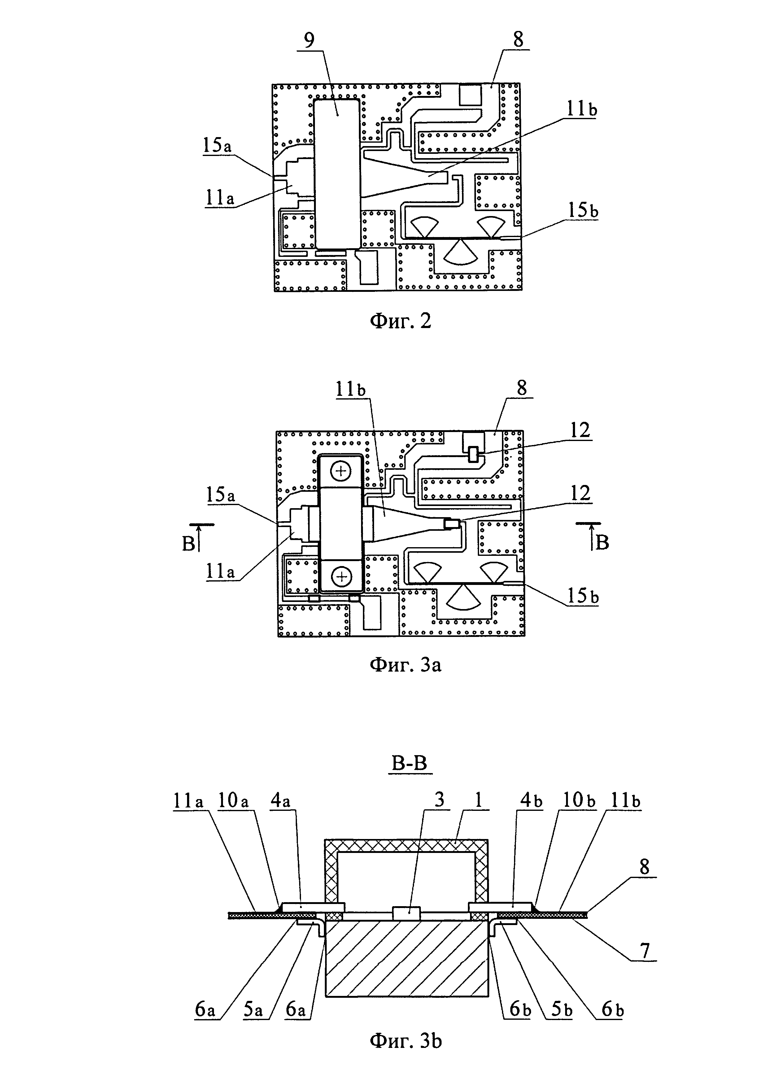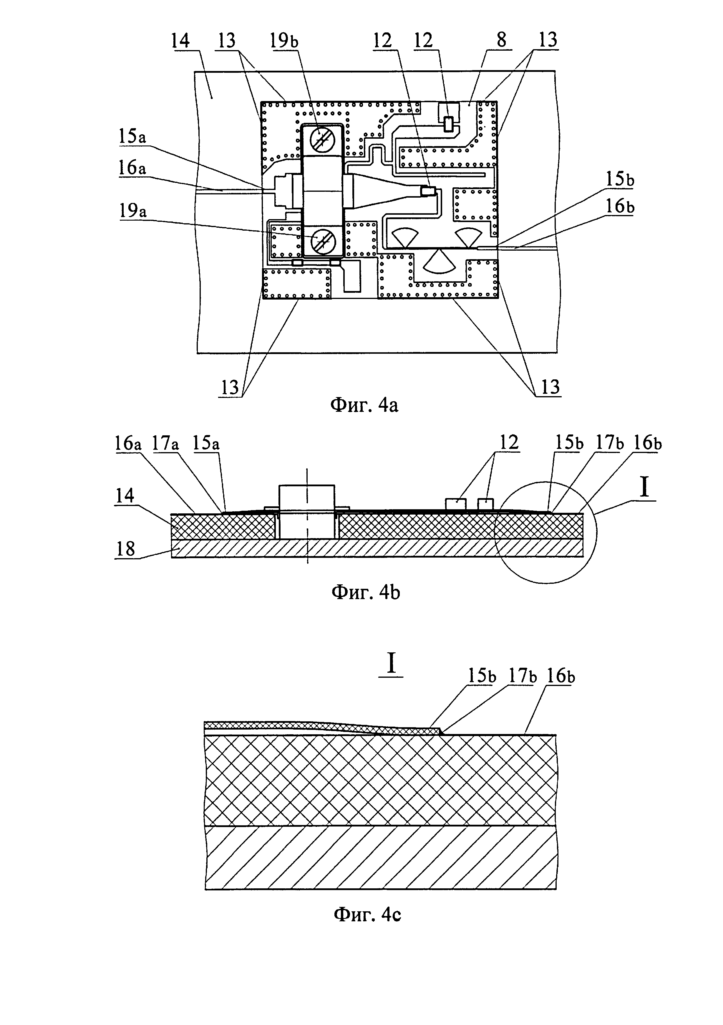 1. Способ монтажа в радиоэлектронное устройство мощного полупроводникового элемента, содержащего корпус, теплоотводящее основание, связанное с корпусом, по меньшей мере, один кристалл, расположенный в корпусе на теплоотводящем основании, и выводы для передачи высокочастотного сигнала, в котором теплоотводящее основание устанавливают на поверхность теплоотводящей структуры и электрически соединяют с заземляющей поверхностью печатной платы, а выводы для передачи высокочастотного сигнала электрически соединяют с плоскими проводниками, расположенными на противоположной поверхности печатной платы, отличающийся тем, что 2. Способ монтажа по п. 1, отличающийся тем, что 3. Способ монтажа по п. 1, отличающийся тем, что 4. Способ монтажа по п. 3, отличающийся тем, что