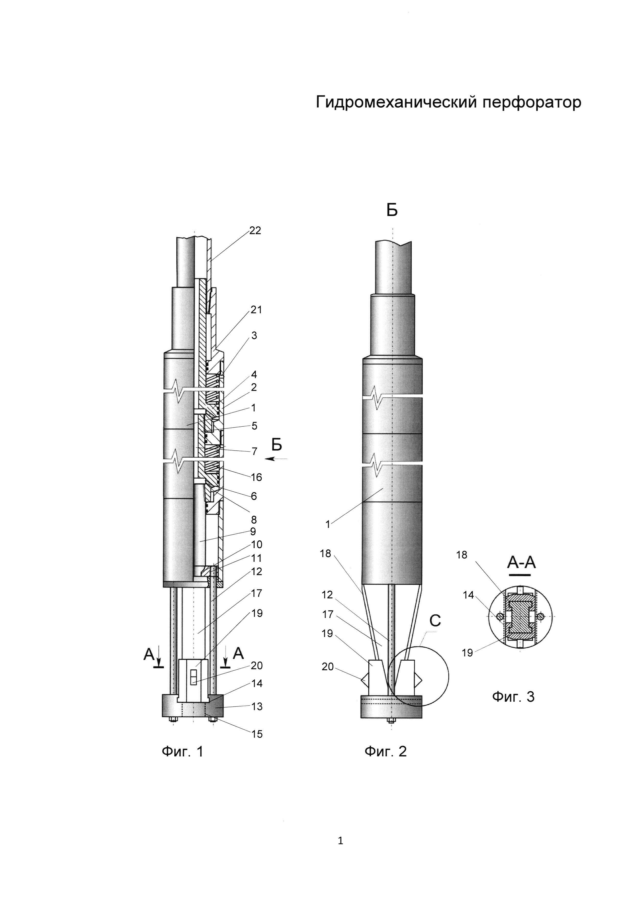 1. Гидромеханический перфоратор, содержащий гидропривод, состоящий из по меньшей мере двух цилиндров с поршнями, верхний из которых соединен с колонной технологических труб, а к нижнему присоединен клин, по которому перемещаются с помощью выходного штока гидропривода и толкателя с пазами каретки с ножами, отличающийся тем, что толкатель соединен с выходным штоком гидропривода боковыми тягами, размещенными с двух сторон клина, а поршни снабжены возвратными пружинами, размещенными в каждом из цилиндров, причем все пружины предварительно сжаты. 2. Гидромеханический перфоратор по п. 1, отличающийся тем, что боковые тяги выполнены в виде штоков с резьбовыми соединениями. 3. Гидромеханический перфоратор по п. 1, отличающийся тем, что боковые тяги выполнены в виде боковых накладок, соединяемых с выходным штоком. 4. Гидромеханический перфоратор по любому из пп. 1–3, отличающийся тем, что ножи выполнены с твердосплавными вставками, размещенными на их острие.