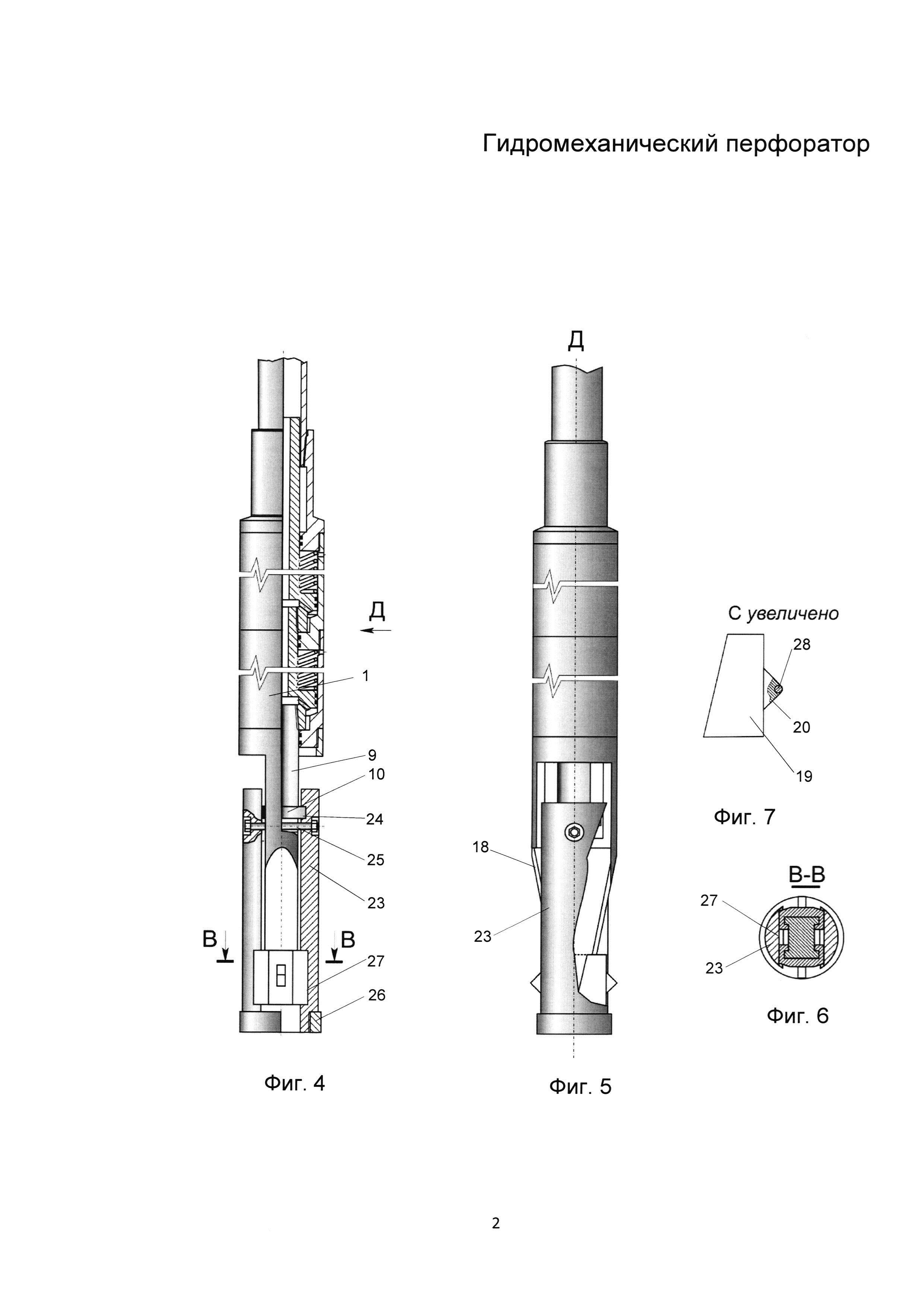Изобретение относится к нефтедобывающей промышленности, в частности к области вторичного вскрытия созданием перфорационных каналов в эксплуатационной колонне. Гидромеханический перфоратор содержит гидропривод, состоящий из по меньшей мере двух цилиндров с поршнями, верхний из которых соединен с колонной технологических труб, а к нижнему присоединен клин, по которому перемещаются с помощью выходного штока гидропривода и толкателя с пазами каретки с ножами. Толкатель соединен с выходным штоком гидропривода боковыми тягами, размещенными с двух сторон клина, а поршни снабжены возвратными пружинами, размещенными в каждом из цилиндров. Все пружины предварительно сжаты. Обеспечивается увеличение глубины проникновения ножей в стенку эксплуатационной колонны и цемент, а также повышение надежности извлечения перфоратора из скважины, износостойкости и срока службы ножей. 3 з.п. ф-лы, 7 ил.