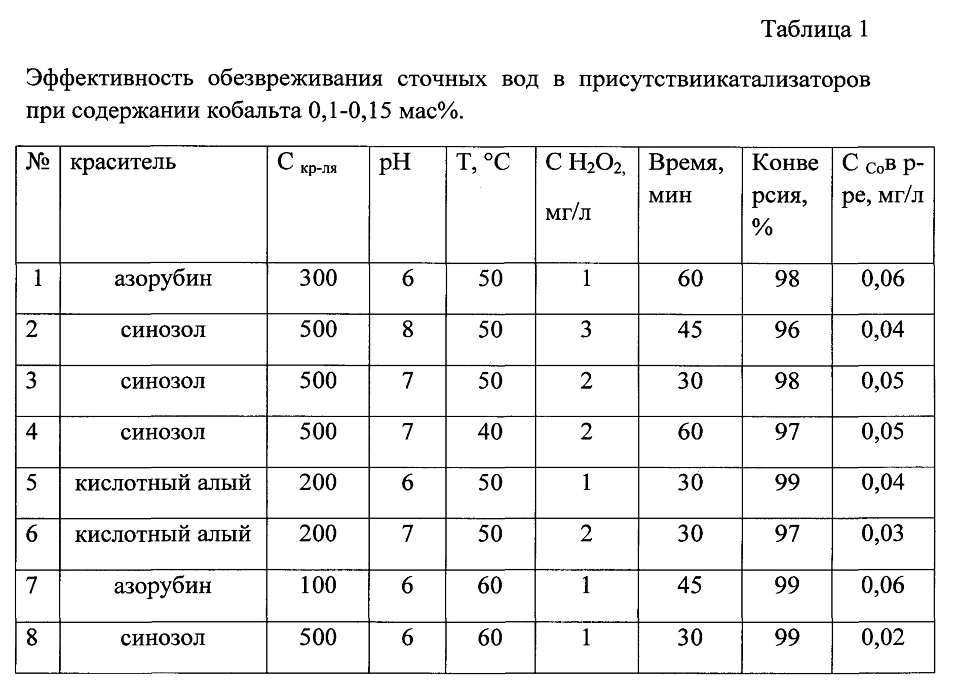 Способ обезвреживания сточных вод, содержащих органические красители, включающий их окисление пероксидом водорода при pH 6-8, температуре 40-60°C, отличающийся тем, что процесс ведут в присутствии кобальтсодержащего катализатора на основе керамического блочно-ячеистого материала, содержание кобальта в котором составляет 0,1-0,15 мас.%.