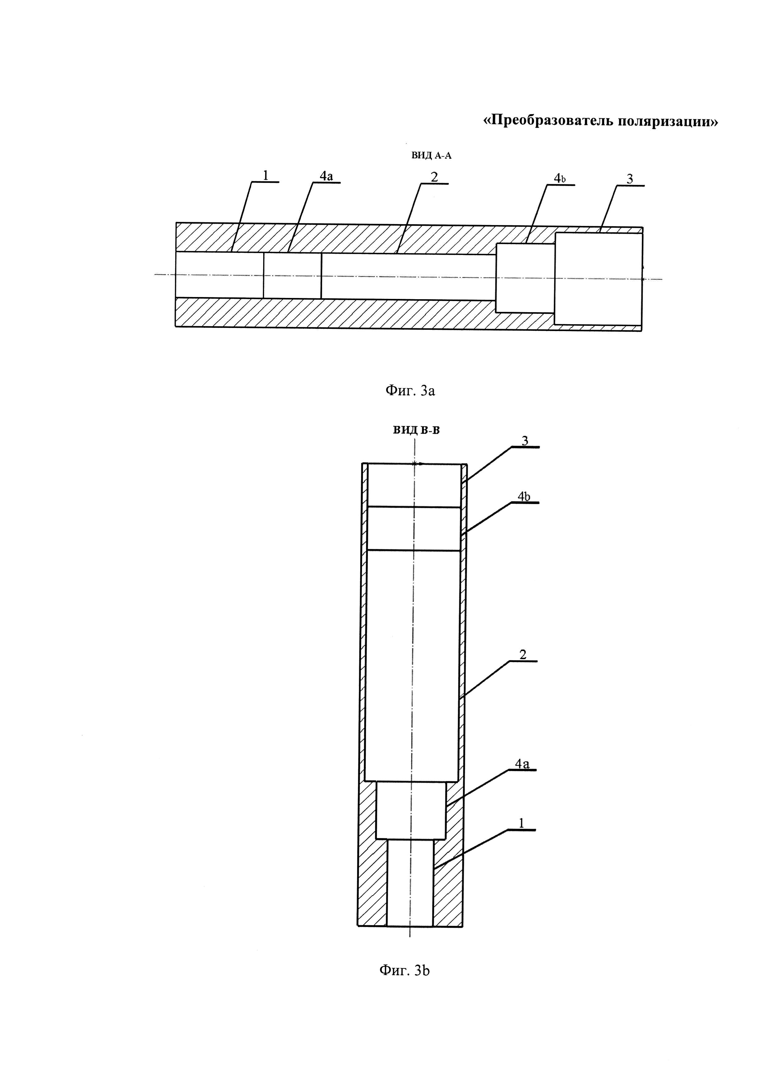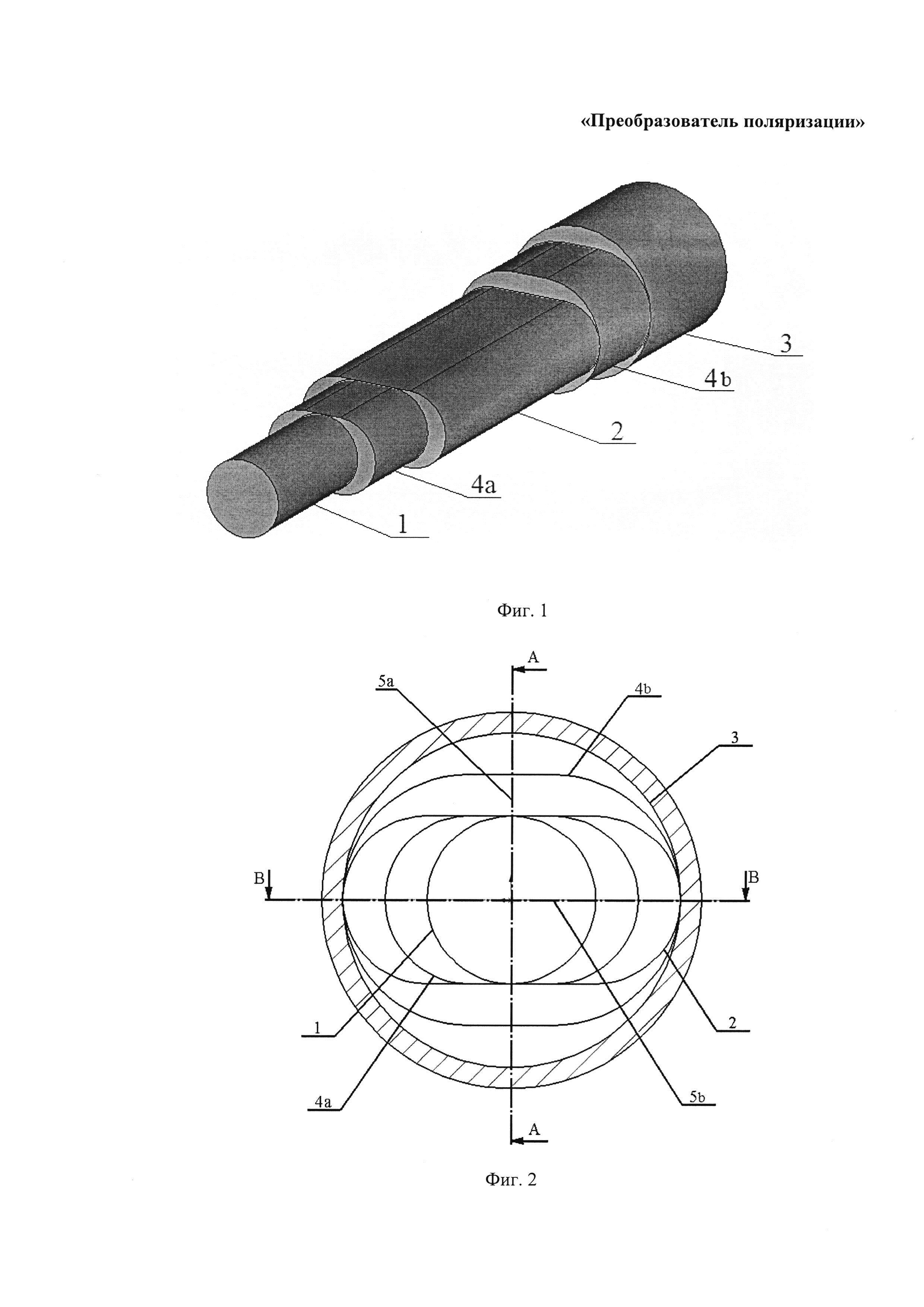 Изобретение относится к области радиотехники, а именно к средствам преобразования поляризации волноводных волн, и может быть использовано в антенных системах с полосой рабочих частот порядка 5%. Известен преобразователь поляризации, содержащий корпус, внутри которого размещены отрезок круглого волновода и механическое приспособление, которое, в процессе использования преобразователя поляризации, с помощью микрометрического винта деформирует поперечное сечение отрезка круглого волновода в эллиптическое сечение на части продольного размера (см. SU 1631630, МПК Н01Р 1/165, опубл. 28.02.1991). Известен преобразователь поляризации, содержащий последовательно расположенные и соединенные переходом отрезок круглого волновода диаметром D1 и отрезок круглого волновода диаметром D2>D1. На стенках каждого из этих отрезков установлены радиальные металлические стержни (см. US 4672334, МПК Н01Р 1/17, опубл. 09.06.1987). Известен преобразователь поляризации, содержащий последовательно расположенные и соединенные коническим переходом отрезок круглого волновода диаметром D1 и отрезок круглого волновода диаметром D2>D1. На стенках отрезка круглого волновода диаметром D1 установлены радиальные металлические стержни и продольные металлические пластины. На стенках отрезка круглого волновода диаметром D2 установлены поперечные металлические диафрагмы (см. SU 1596407, МПК Н01Р 1/165, опубл. 30.09.1990). Общим недостатком известных преобразователей поляризации является низкая технологичность их изготовления, обусловленная сложностью конструкции. Наиболее близким по технической сущности к предлагаемому устройству является преобразователь поляризации, содержащий последовательно расположенные и соединенные плавными переходами отрезок входного круглого волновода диаметром D1, отрезок промежуточного волновода и отрезок выходного круглого волновода диаметром D2, равным D1 (см. JPH 0197001, МПК Н01Р 1/161, Н01Р 1/17, Н01Р 1/18, опубл. 14.04.1989). Отрезок промежуточного волновода и переходы имеют поперечные сечения в форме овалов (эллипсов), причем размер большой оси эллипса промежуточного волновода равен D1, а размер малой оси эллипса равен D3<D1. Данный преобразователь поляризации принят в качестве ближайшего аналога заявляемого преобразователя поляризатора. Недостатком данного преобразователя поляризации является невозможность его изготовления из единой заготовки путем обработки с одной из ее сторон, что делает невозможным его применение в антенных системах, выполненных в виде моноблока. Технической проблемой, решаемой настоящим изобретением, является создание преобразователя поляризации, лишенного указанного недостатка. В результате достигается технический результат, заключающийся в возможности изготовления преобразователя поляризации из единой заготовки путем токарно-фрезерной или электроэрозионной обработки внутренней полости заготовки с одной из ее сторон. Указанный технический результат достигается созданием преобразователя поляризации, содержащего последовательно расположенные и соединенные переходами отрезок входного круглого волновода диаметром D1, отрезок промежуточного волновода, имеющий поперечное сечение в форме овала, и отрезок выходного круглого волновода диаметром D2, в котором размер малой оси овала равен D1, а размер большой оси овала равен D2>D1. Согласно ча