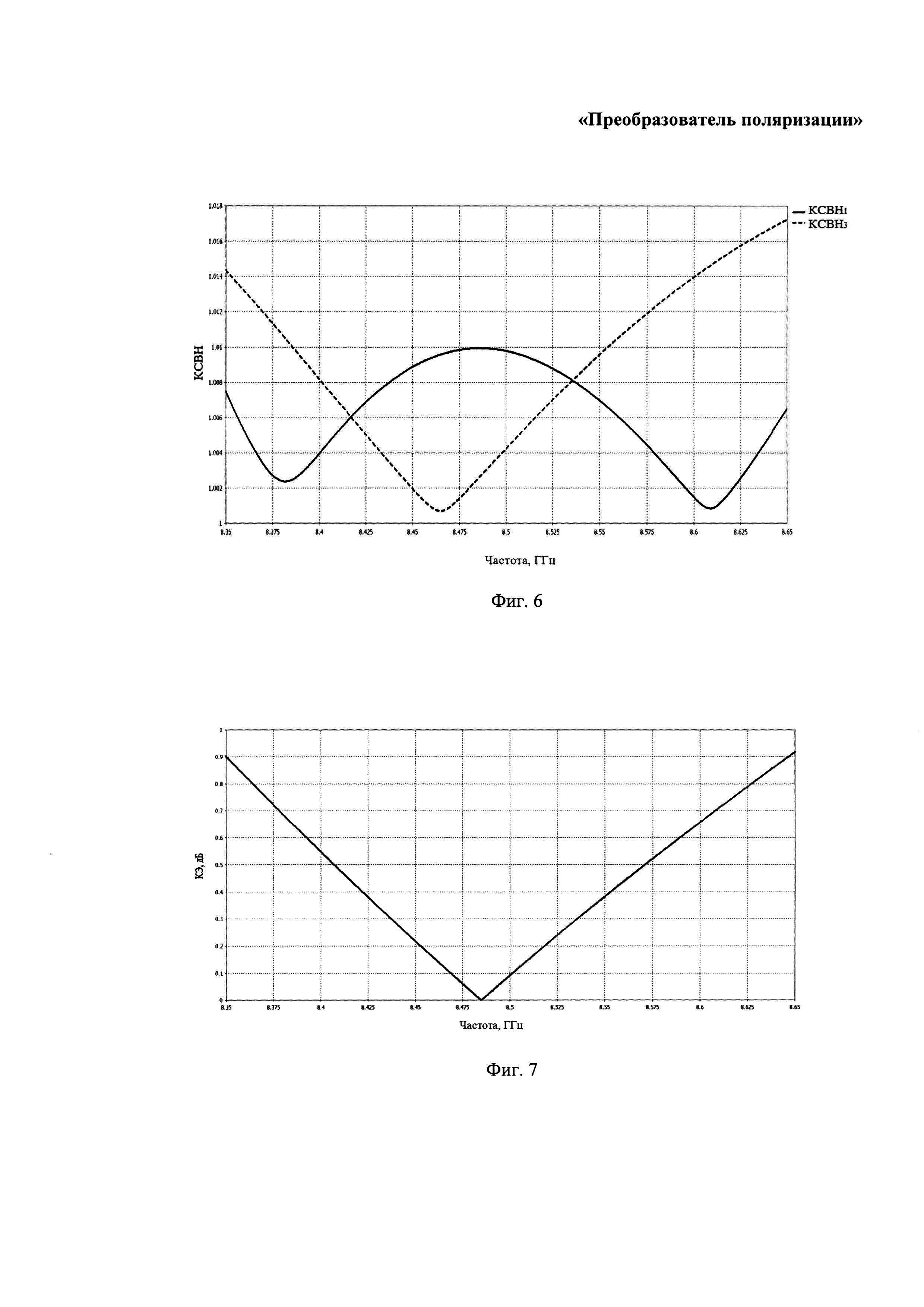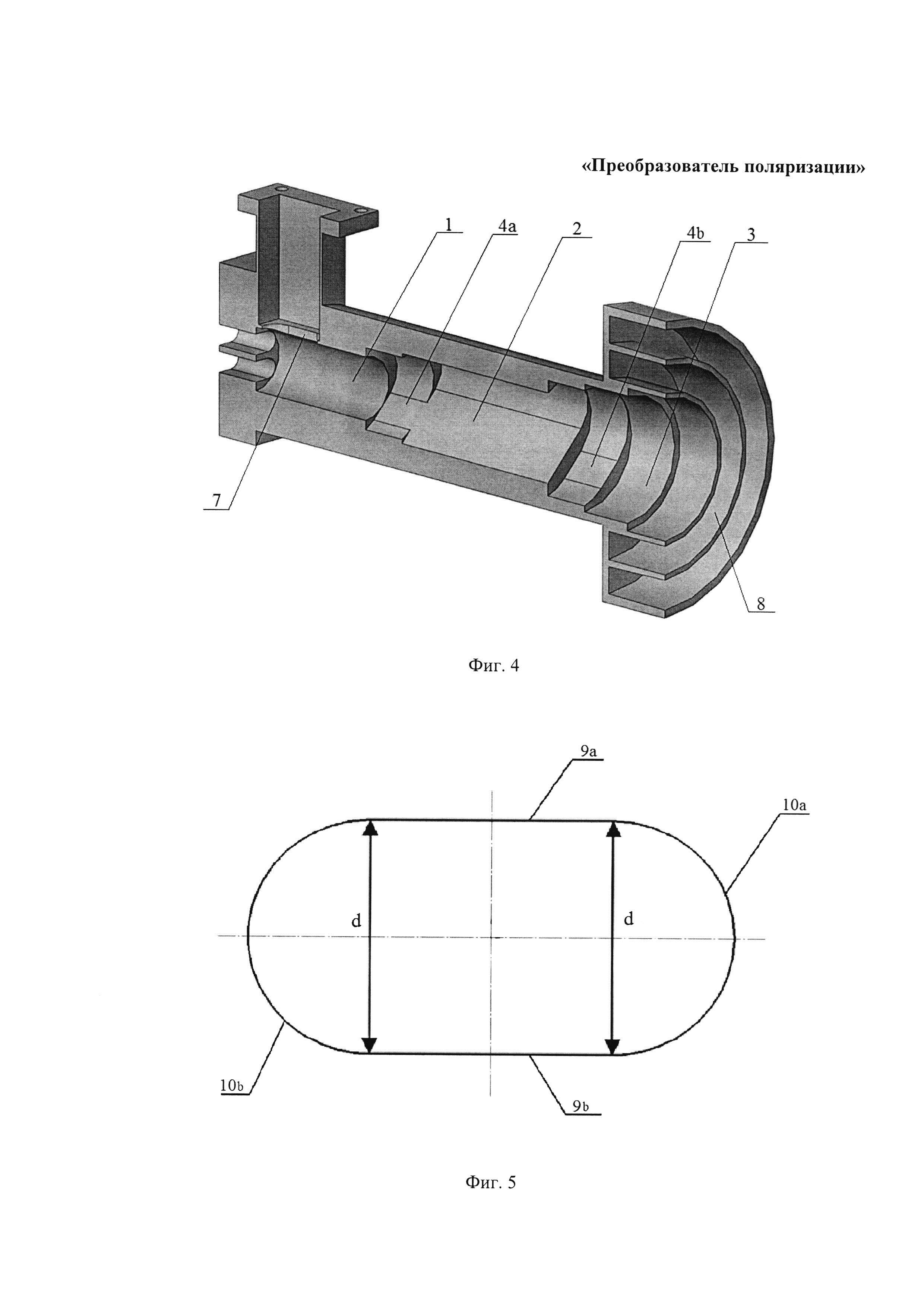 1. Преобразователь поляризации, содержащий последовательно расположенные и соединенные переходами отрезок входного круглого волновода диаметром D1, отрезок промежуточного волновода, имеющий поперечное сечение в форме овала, и отрезок выходного круглого волновода диаметром D2, отличающийся тем, что размер малой оси овала равен D1, а размер большой оси овала равен D2>D1. 2. Преобразователь поляризации по п. 1, отличающийся тем, что диаметр отрезка входного круглого волновода D1>0,63λmax, а диаметр отрезка выходного круглого волновода D2<0,73λmin, где λmax и λmin - длины волн в свободном пространстве, соответствующие нижней и верхней границе рабочего диапазона частот. 3. Преобразователь поляризации по п. 1 или 2, отличающийся тем, что отрезок промежуточного волновода имеет поперечное сечение в форме эллипса. 4. Преобразователь поляризации по п. 1 или 2, отличающийся тем, что отрезок промежуточного волновода имеет поперечное сечение в форме овала, образованного двумя параллельными отрезками прямых и двумя полуокружностями, диаметр которых равен расстоянию между двумя параллельными отрезками прямых. 5. Преобразователь поляризации по п. 1 или 2, отличающийся тем, что переходы выполнены с плавным изменением их поперечного сечения. 6. Преобразователь поляризации по п. 1 или 2, отличающийся тем, что переходы выполнены со ступенчатым изменением их поперечного сечения.