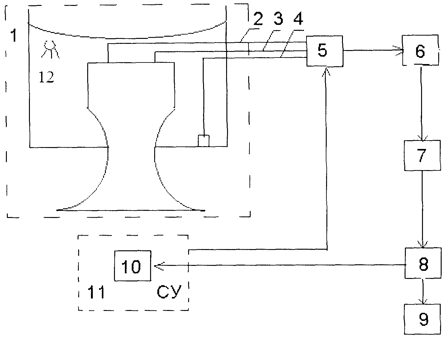 Изобретение относится к способам функционального контроля и диагностирования состояния при испытаниях сложных пневмогидравлических объектов, например ракетных двигателей (РД). Известен способ контроля состояния жидкостного ракетного двигателя (ЖРД), заключающийся в измерении контрольных параметров и сравнении их с допустимыми (пороговыми) значениями, который реализуется с помощью информационно-измерительной системы (см., например, «Испытания ЖРД». Под ред. Левина В.Я. Москва, Машиностроение, 1981 г., с.199). Данный способ осуществляет контроль состояния объекта и не позволяет диагностировать неисправность, т.е. определять место, степень и наименование неисправности. Наиболее близким к заявленному способу является способ контроля и диагностирования ракетного двигателя, заключающийся в том, что циклически измеряют параметры двигателя и двигательного отсека, сравнивают их с заданными пороговыми значениями и диагностируют (локализуют) неисправность в случае выхода текущего значения параметра за его пороговый уровень и выключают двигатель (патент РФ 2393450, G01M 15/14) - наиболее близкий аналог. Известный способ контроля и диагностирования не позволяет диагностировать степень неисправности, а любое превышение пороговых значений измеряемых параметров фиксирует как отказ, и выключают двигатель. При этом программа испытания оказывается не выполненной и требует повторения на дополнительной материальной части. Вместе с тем опыт эксплуатации и испытаний РД показывает, что существует большая группа неисправностей, связанных с незначительными негерметичностями жидкостного и газовых трактов, при которых возможно продолжение испытания и выполнения его программы. Техническим результатом настоящего изобретения является повышение достоверности контроля и диагностирования РД за счет определения в процессе диагностирования степени неисправности, при которой допустимо продолжение испытания и выполнение его программы, и исключения выхода из строя РД. Указанный технический результат достигается тем, что в способе контроля и диагностирования ракетного двигателя, заключающемся в циклическом измерении параметров двигателя и двигательного отсека, сравнении их с заданными пороговыми значениями и по результатам сравнения осуществлении контроля и диагностирования двигателя, новым является то, что дополнительно определяют производные изменения параметров во времени, сравнивают их со своими пороговыми значениями и, в случае нахождения производных в пределах пороговых значений, фиксируют степень неисправности, допустимой для продолжения испытания, переводят двигатель на пониженный режим и подают в двигательный отсек инертную среду. Операции по переводу двигателя на пониженный режим и подаче в двигательный отсек инертной среды позволяют сохранить материальную часть двигателя, кабельной сети и приборов, находящихся в двигательном отсеке, от воздействия агрессивной среды при сравнительно небольших неисправностях. В качестве инертной среды при стендовых испытаниях используют душирование двигательного отсека водой, а при летных испытаниях - газом наддува (азот или гелий). Сущность заявленного изобретения поясняется чертежом, на котором представлена схема информационно-управляющей системы для осуществления способа. На да
