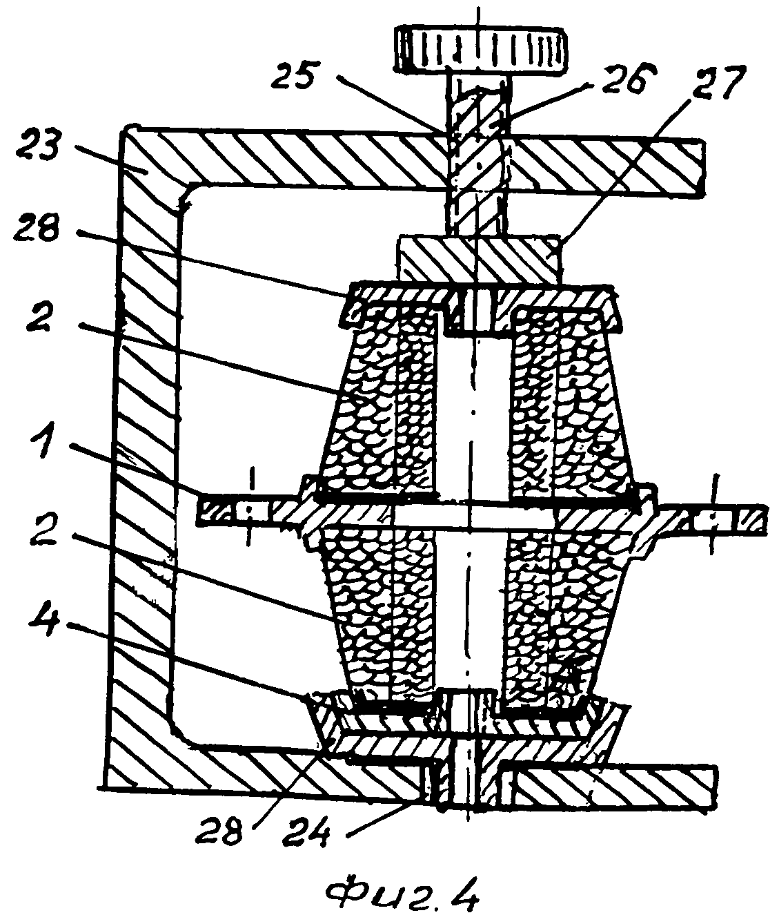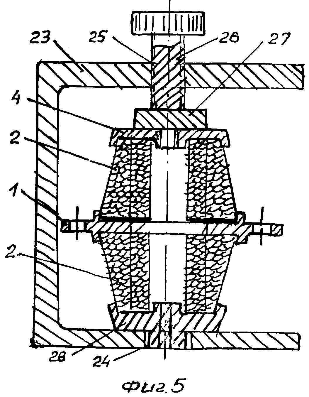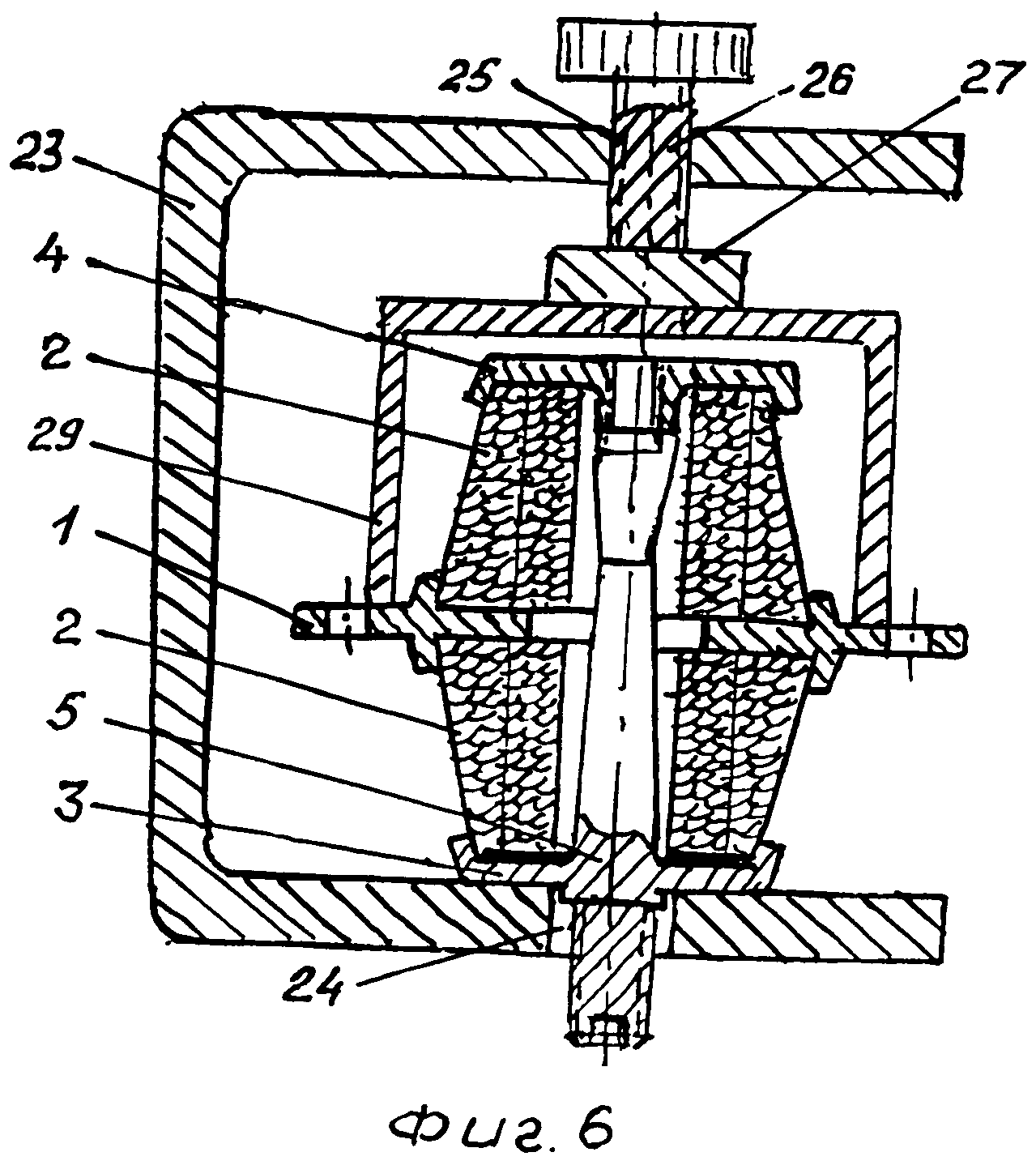 Изобретение относится к транспортному машиностроению, преимущественно к ракетно-космической технике, и может быть использовано для виброизоляции пультов отображения информации и управления бортовыми системами транспортного корабля, где требуется снижение уровня вибрации и ударной нагрузки. Известен демпфирующий элемент, намотанный из соединенных между собой металлических спиралей разного диаметра, причем вначале наматывается спираль меньшего диаметра виток к витку в несколько слоев, а затем, поверх нее, наматывается спираль большего диаметра под углом к спирали меньшего диаметра, при этом представлен способ намотки. Недостатком известного демпфирующего элемента является недостаточная связка витков спирали меньшего диаметра между собой, что приводит к недостаточной жесткости демпфирующего элемента (патент США №5149068, НКИ 267/147, МПК F16f 7/00 от 22.09.1992 г.). Известен также виброизолятор втулочный, содержащий два упругодемпфирующих элемента прямоугольного сечения из материала металлорезина, размещенных в посадочных местах кольцевого основания с двух сторон с одинаковыми усилиями поджатия ограничительными фланцами, стягивающий их болт с фиксирующей гайкой, в кольцевом основании выполнены отверстия для крепления к защищаемому изделию от воздействия вибрационных нагрузок, а в ограничительных фланцах выполнены резьбовые отверстия для крепления к внешней арматуре объекта (патент ФРГ №DE4408139, МПК F16f 1/38 от 21.09.1995 г.). Недостатком виброизолятора втулочного является недостаточная защита изделия от нагрузок в поперечном направлении, что ограничивает область его использования. Известен виброизолятор втулочный, принятый за прототип, содержащий два упругодемпфирующих элемента из материала металлорезина, размещенных на кольцевом основании с двух сторон с различными усилиями поджатия ограничительными шайбами, закрепленными на втулке соосно с кольцевым основанием и упругодемпфирующими элементами. Кроме того, между кольцевым основанием и одной из ограничительных шайб соосно с ними введены две поджатые разгрузочные пружины, одна из которых цилиндрическая, охватывающая с соприкосновением большей частью своих витков наружную поверхность упругодемпфирующего элемента, а другая - коническая пружина, установленная во внутреннем центральном коническом отверстии упругодемпфирующего элемента, витком меньшего основания плотно охватывает наружную поверхность бурта ограничительной шайбы, а большая часть витков конической пружины опирается на внутреннюю коническую поверхность центрального отверстия упругодемпфирующего элемента, причем центральная втулка выполнена в виде крепежного стержня заодно с ограничительной шайбой на одном конце и резьбовой частью на противоположном конце, а другая ограничительная шайба через центральное отверстие запрессована своим внутренним буртом на крепежный стержень и закреплена гайкой с продольными пазами под ключ (патент на полезную модель №95048, МПК F16f 3/08 «Виброизолятор втулочный», опублик. 10.06.2010 г.) Недостатком виброизолятора втулочного является износ демпфирующего элемента из металлорезины, вызванного его сухим трением о разгрузочные пружины, снижая, тем самым, ресурс. Цель предлагаемого изобретения - повышение надежности и улучшение его демпфирующих свойств за счет увеличения