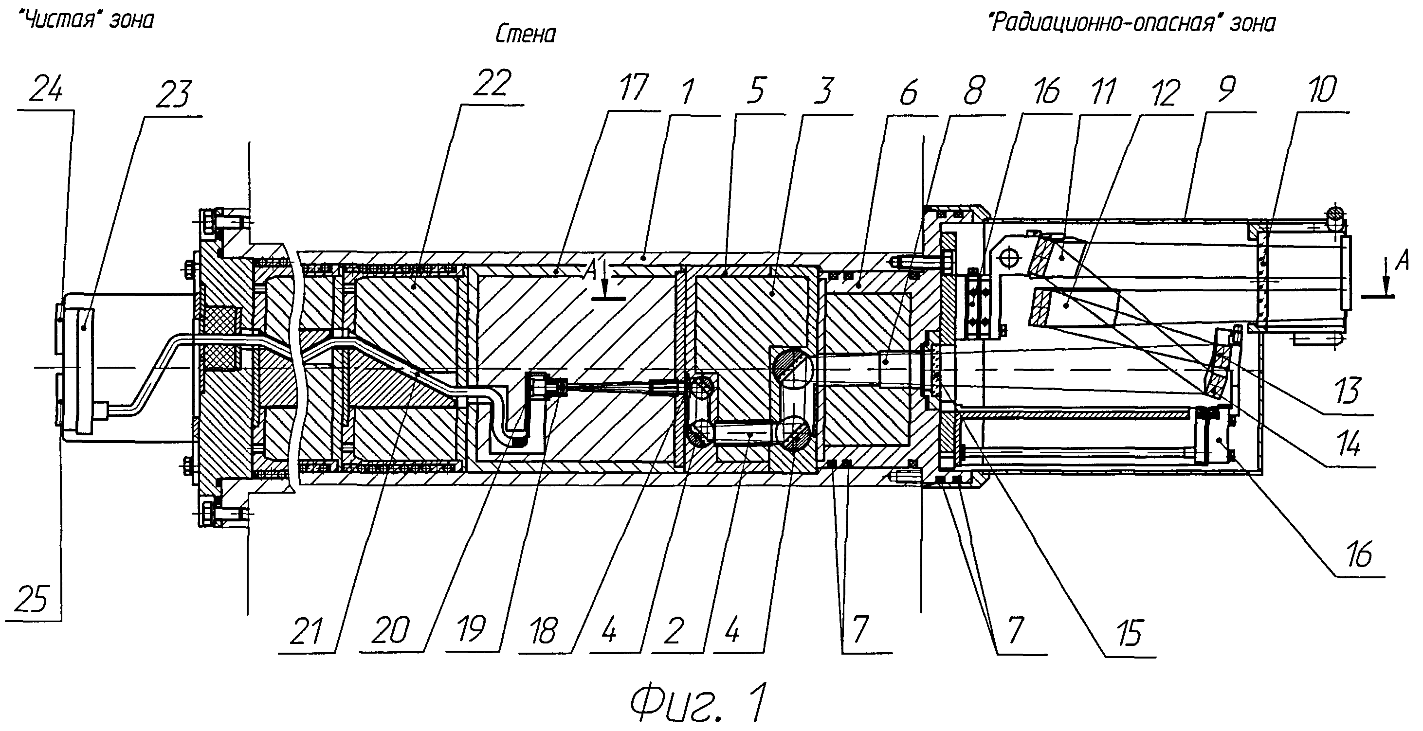 1. Устройство для получения изображения объекта, находящегося в радиационно-опасной зоне, содержащее фоторегистратор изображения, а также вынесенные в чистую зону процессорный блок управления фоторегистратором и блок визуализации изображения, отличающееся тем, что устройство содержит коленчатый зеркальный лабиринт, выполненный в радиационно-защитном материале и размещенный в проходке через защитную стенку между радиационно-опасной и чистой зонами, а также размещенную в защитном кожухе, по меньшей мере, с одним светопроницаемым окном внешнюю систему отклоняющих зеркал, установленную между контролируемым участком радиационно-опасной зоны и входным каналом зеркального лабиринта и обеспечивающую приведение заданного угла и направления обзора к входному каналу зеркального лабиринта, при этом фоторегистратор изображения выполнен на основе многоэлементной полупроводниковой матрицы высокого разрешения, которая вместе с проецирующим объективом размещена на выходе коленчатого зеркального лабиринта и соединена кабелем, проложенным в проходке с собственной радиационной защитой, с процессорным блоком управления и визуализации изображения. 2. Устройство по п.1, отличающееся тем, что фоторегистратор изображения выполнен на основе цифровой CMOS-матрицы. 3. Устройство по п.1, отличающееся тем, что внешняя система отклоняющих зеркал содержит одно входное и одно выходное зеркала. 4. Устройство по п.1, отличающееся тем, что внешняя система отклоняющих зеркал содержит два входных зеркала, каждое из которых принимает изображение своего участка обзора в собственном угле, и два выходных зеркала, каждое из которых проецирует изображение соответствующего ему входного зеркала на вход зеркального лабиринта. 5. Устройство по п.1, отличающееся тем, что зеркала отклоняющей системы установлены на юстировочных столах с регулируемым углом наклона в нескольких плоскостях. 6. Устройство по п.5, отличающееся тем, что в радиационно-защитном материале проходки выполнены каналы для обеспечения доступа к регулировочным винтам юстировочных столов со стороны чистой зоны.