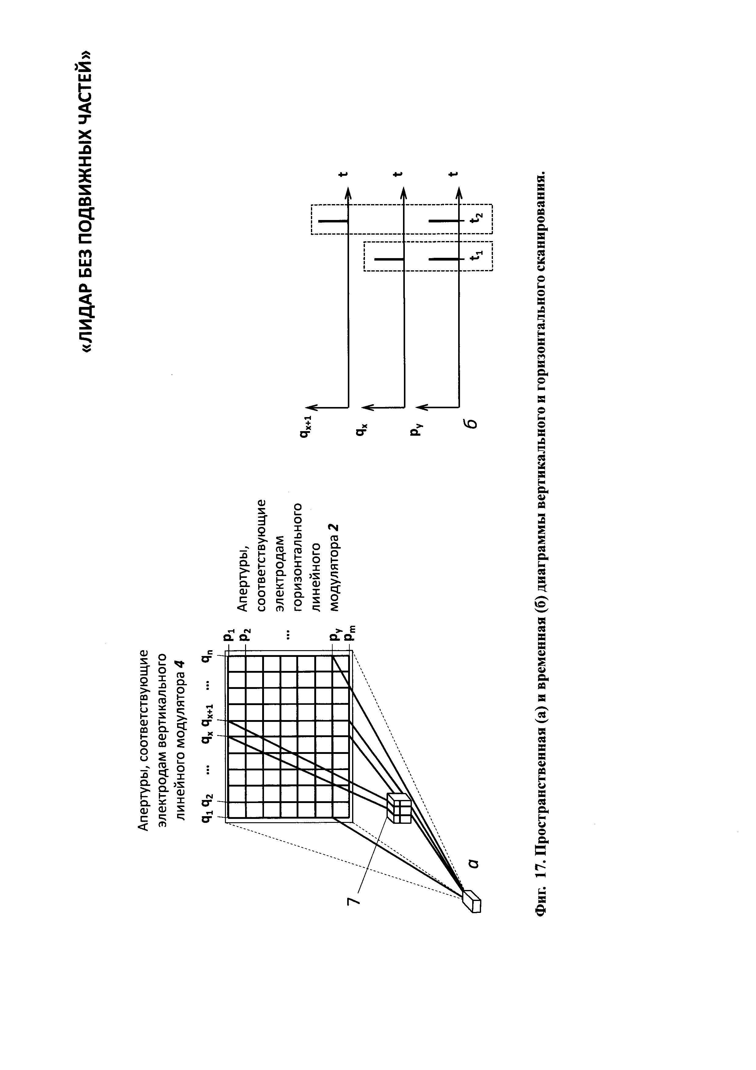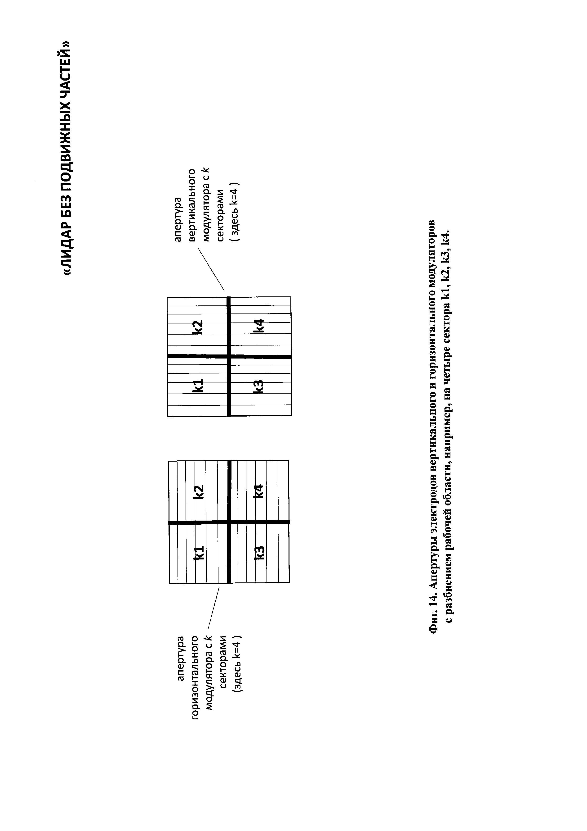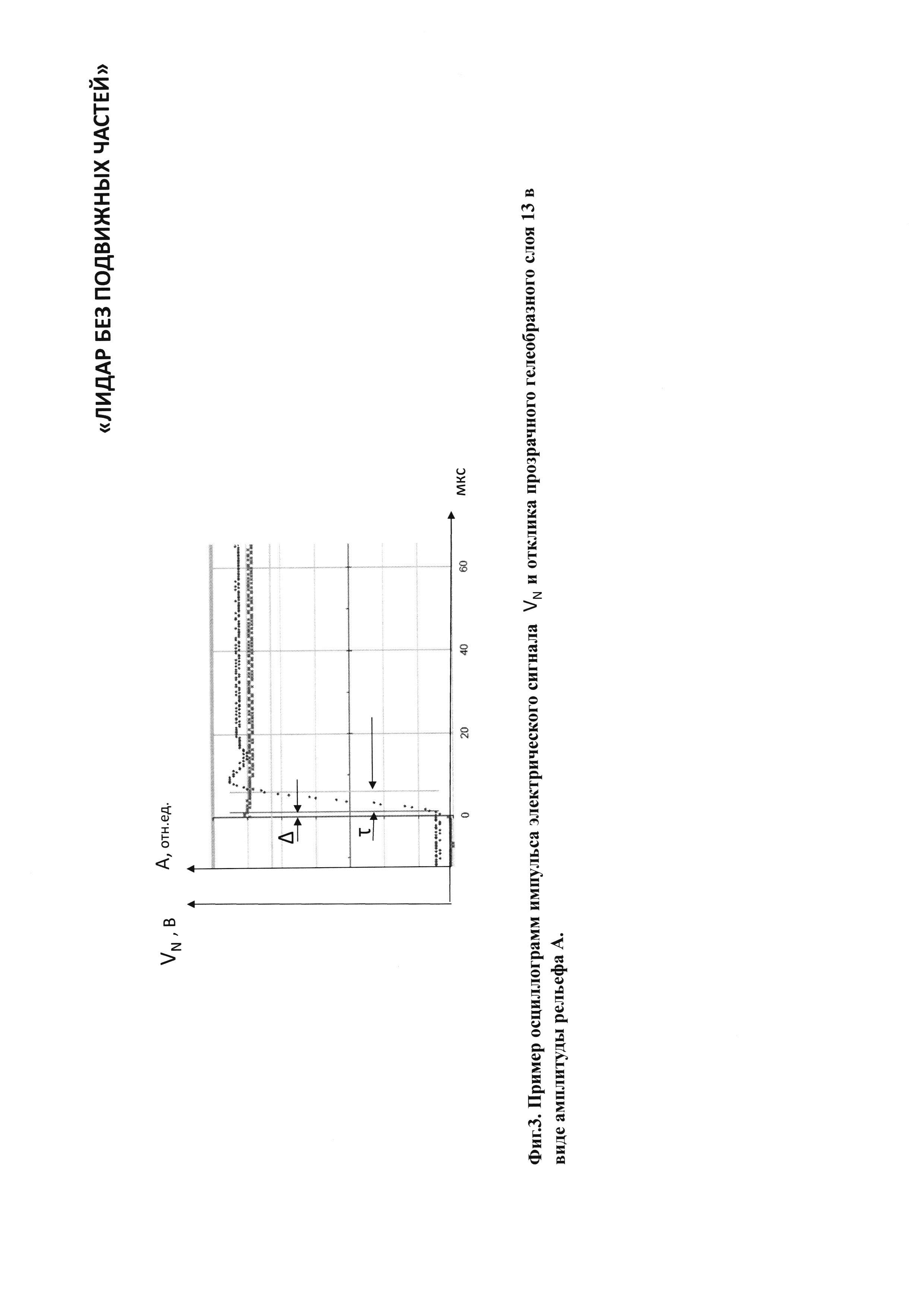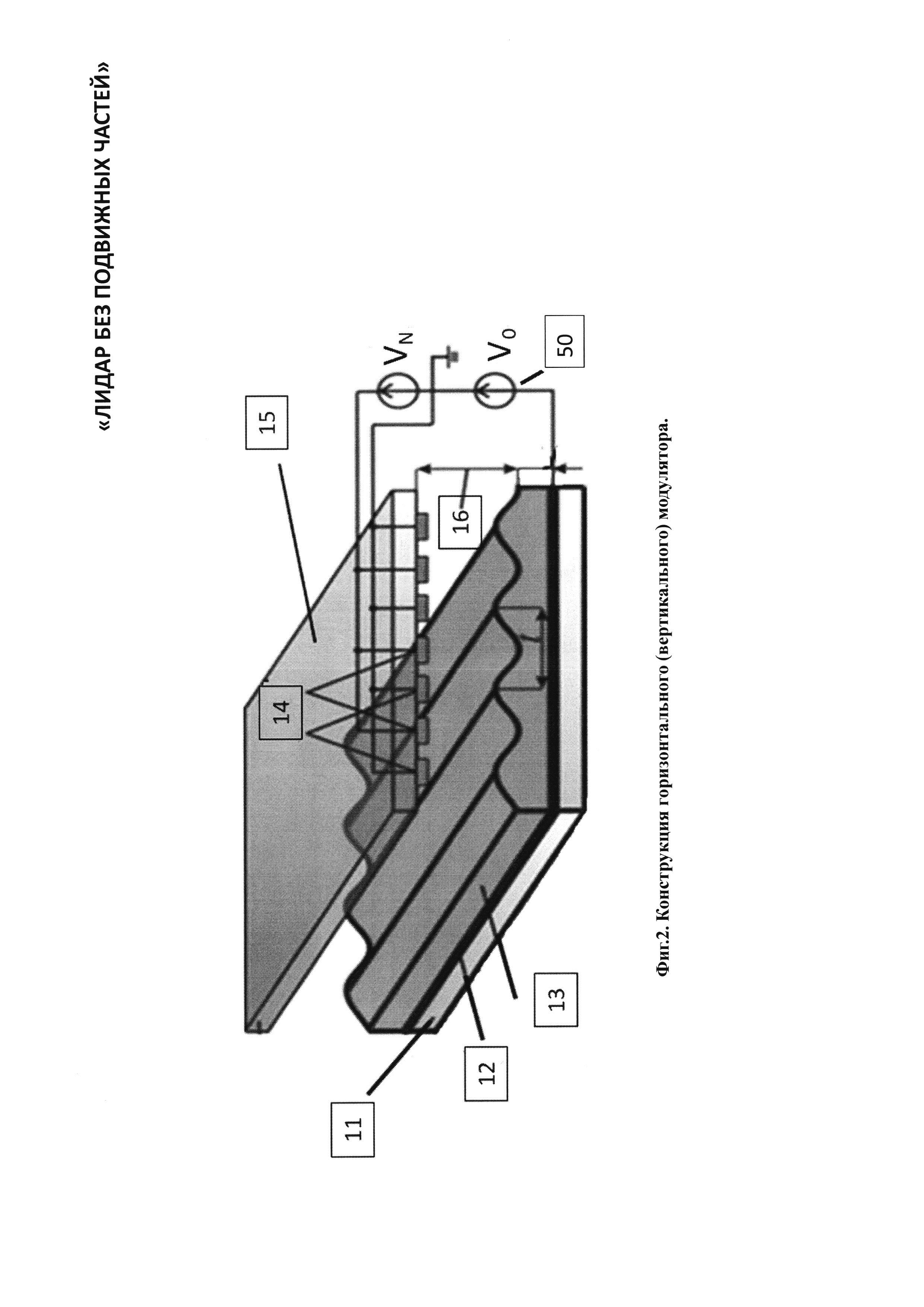 1. Лидар без подвижных частей содержит лазерный излучатель, горизонтальный линейный модулятор, систему управления горизонтальным линейным модулятором, вертикальный линейный модулятор, систему управления вертикальным линейным модулятором, передающий оптический тракт, направленный на объект наблюдения, приемный оптико-электронный тракт, цифровой вычислитель и потребитель информации, причем горизонтальный модулятор содержит нанесенную на первую диэлектрическую прозрачную подложку прозрачный электропроводящий слой, покрытый прозрачным гелеобразным слоем, и систему n штук линейчатых прозрачных горизонтальных электродов, расположенных в одной плоскости на второй диэлектрической прозрачной подложке, размещенных с зазором над прозрачным гелеобразным слоем и соединенных электрически с системой управления горизонтальным линейным модулятором, при этом n выходов системы управления горизонтальным линейным модулятором соединены с n входами системы линейчатых прозрачных электродов, при этом система линейчатых прозрачных горизонтальных n электродов покрывает световую апертуру второй диэлектрической прозрачной подложки, при этом все линейчатые прозрачные горизонтальные n электроды электрически изолированы друг от друга, а вертикальный линейный модулятор содержит нанесенную на первую диэлектрическую прозрачную подложку прозрачный электропроводящий слой, покрытый прозрачным гелеобразным слоем, и систему m штук линейчатых прозрачных вертикальных электродов, расположенных в одной плоскости на второй диэлектрической прозрачной подложке, размещенных с зазором над прозрачным гелеобразным слоем и соединенных электрически с системой управления вертикальным линейным модулятором, при этом m выходов системы управления соединены с m входами системы линейчатых прозрачных электродов, при этом линейчатые прозрачные вертикальные m электроды покрывают световую апертуру второй диэлектрической прозрачной подложки, при этом все линейчатые прозрачные вертикальные m электроды электрически изолированы друг от друга, причем лазерный излучатель, система управления горизонтальным линейным модулятором, система управления вертикальным линейным модулятором, приемный оптико-электронный тракт и потребитель информации электрически соединены с цифровым вычислителем, причем лазерный излучатель состоит из лазерного источника света, коллимматора, зеркала и расщепителя света на горизонтальный и вертикальный пучки, каждый из которых оптически соединен с горизонтальным линейным модулятором и вертикальным линейным модулятором, причем приемный оптико-электронный тракт состоит из расположенных последовательно на оптической оси объектива 21 приемного оптико-электронного тракта, полосового оптического фильтра, фотоприемного элемента, при этом фотоприемный элемент электрически связан с предварительным усилителем, а предварительный усилитель электрически связан с регулятором коэффициента усиления, причем цифровой вычислитель состоит по крайней мере из двух блоков согласования аналоговых сигналов, цифроаналогового преобразователя, время-цифрового преобразователя, центрального процессорного устройства, оперативного запоминающего устройства, постоянного запоминающего устройства, при этом блоки согласования аналого