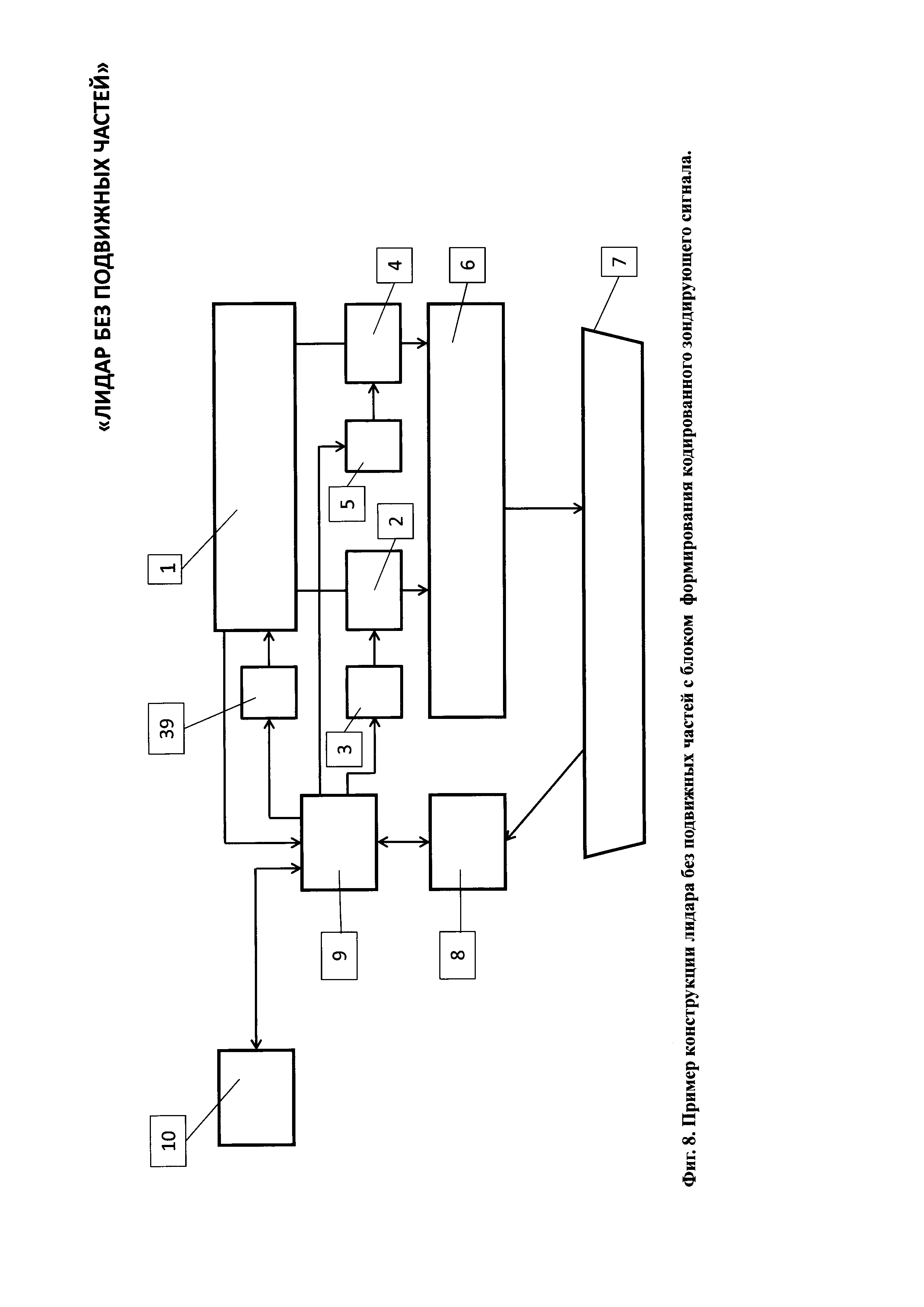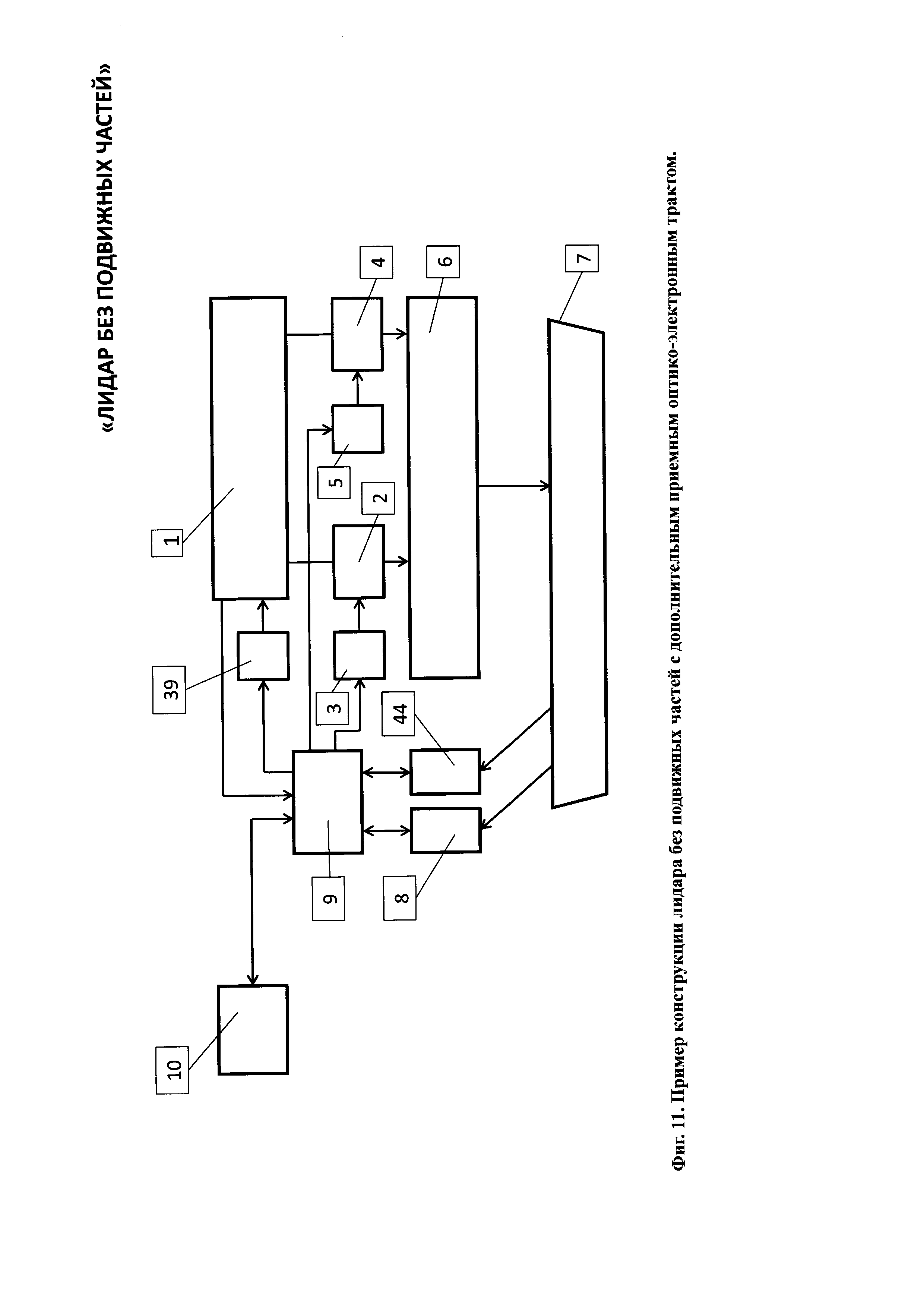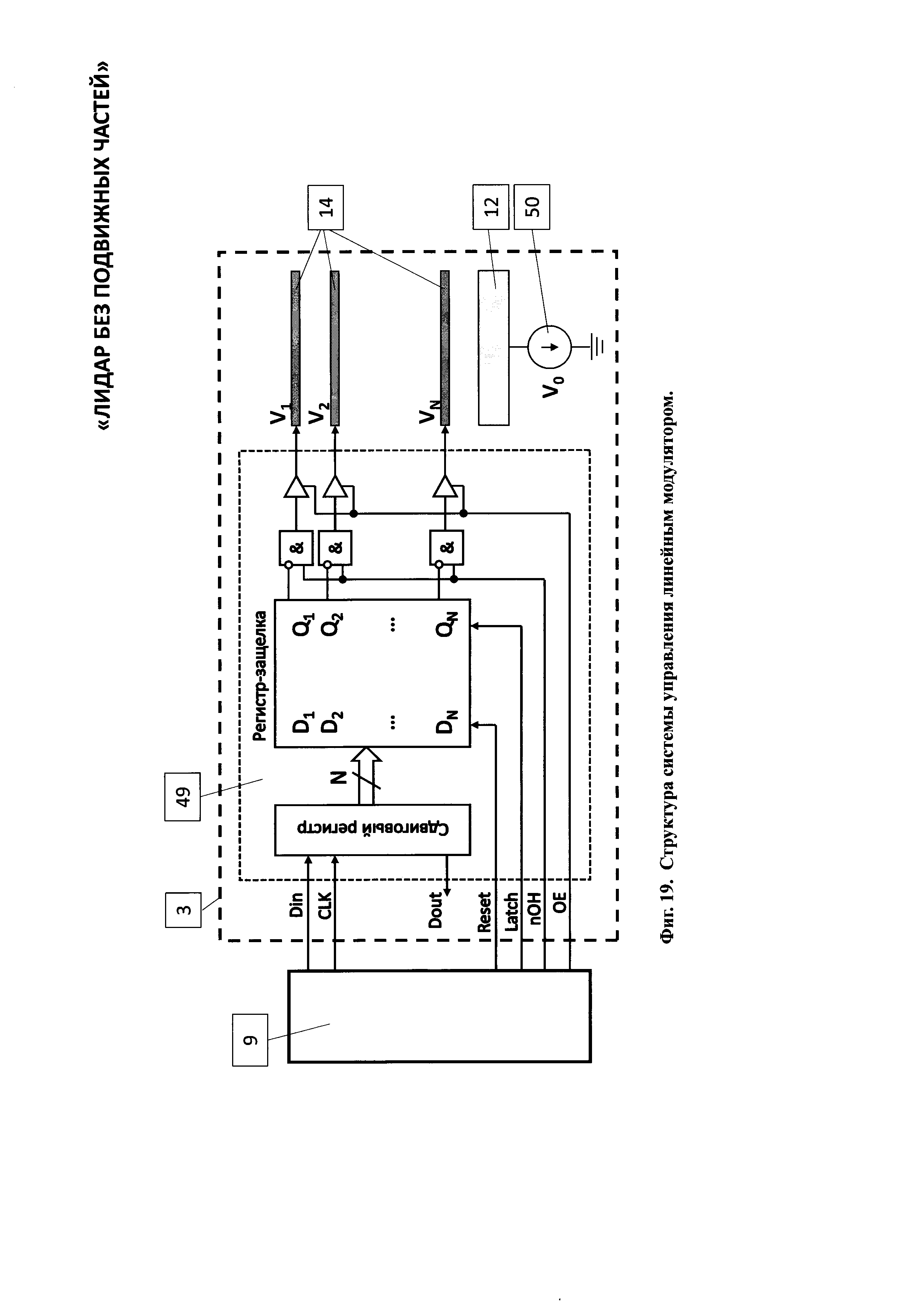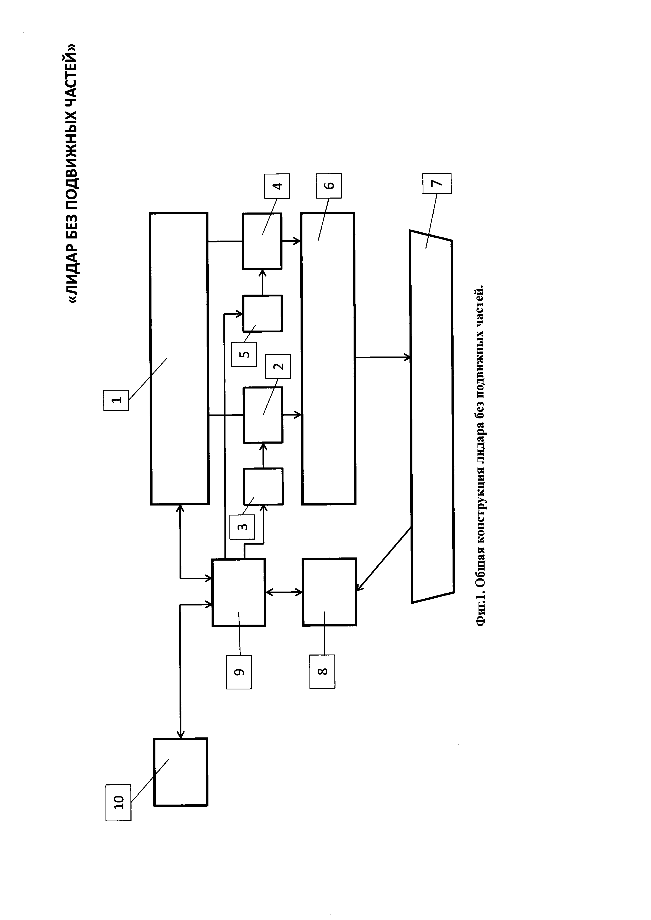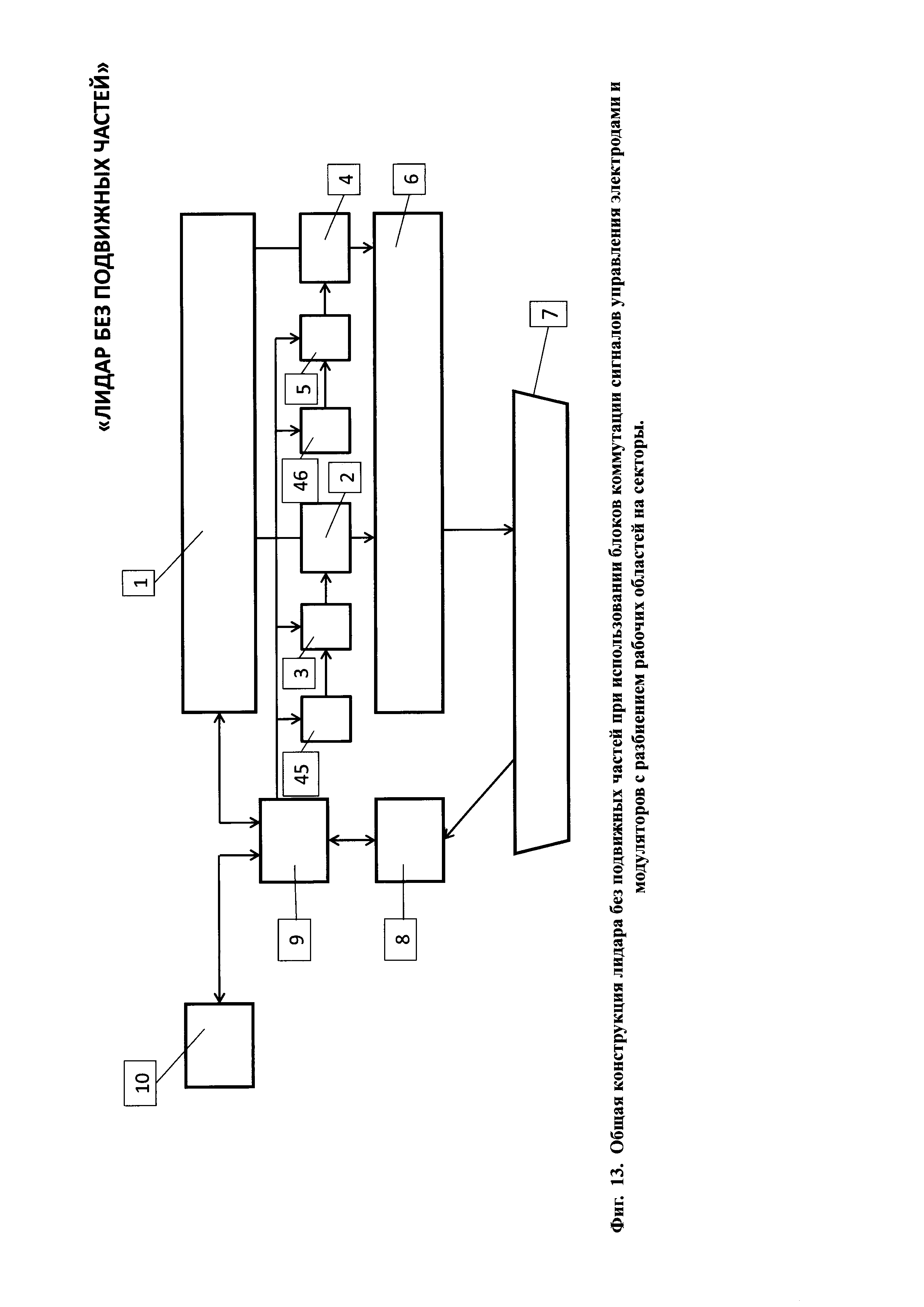 1. Лидар без подвижных частей содержит лазерный излучатель, горизонтальный линейный модулятор, систему управления горизонтальным линейным модулятором, вертикальный линейный модулятор, систему управления вертикальным линейным модулятором, передающий оптический тракт, направленный на объект наблюдения, приемный оптико-электронный тракт, цифровой вычислитель и потребитель информации, причем горизонтальный модулятор содержит нанесенную на первую диэлектрическую прозрачную подложку прозрачный электропроводящий слой, покрытый прозрачным гелеобразным слоем, и систему n штук линейчатых прозрачных горизонтальных электродов, расположенных в одной плоскости на второй диэлектрической прозрачной подложке, размещенных с зазором над прозрачным гелеобразным слоем и соединенных электрически с системой управления горизонтальным линейным модулятором, при этом n выходов системы управления горизонтальным линейным модулятором соединены с n входами системы линейчатых прозрачных электродов, при этом система линейчатых прозрачных горизонтальных n электродов покрывает световую апертуру второй диэлектрической прозрачной подложки, при этом все линейчатые прозрачные горизонтальные n электроды электрически изолированы друг от друга, а вертикальный линейный модулятор содержит нанесенную на первую диэлектрическую прозрачную подложку прозрачный электропроводящий слой, покрытый прозрачным гелеобразным слоем, и систему m штук линейчатых прозрачных вертикальных электродов, расположенных в одной плоскости на второй диэлектрической прозрачной подложке, размещенных с зазором над прозрачным гелеобразным слоем и соединенных электрически с системой управления вертикальным линейным модулятором, при этом m выходов системы управления соединены с m входами системы линейчатых прозрачных электродов, при этом линейчатые прозрачные вертикальные m электроды покрывают световую апертуру второй диэлектрической прозрачной подложки, при этом все линейчатые прозрачные вертикальные m электроды электрически изолированы друг от друга, причем лазерный излучатель, система управления горизонтальным линейным модулятором, система управления вертикальным линейным модулятором, приемный оптико-электронный тракт и потребитель информации электрически соединены с цифровым вычислителем, причем лазерный излучатель состоит из лазерного источника света, коллимматора, зеркала и расщепителя света на горизонтальный и вертикальный пучки, каждый из которых оптически соединен с горизонтальным линейным модулятором и вертикальным линейным модулятором, причем приемный оптико-электронный тракт состоит из расположенных последовательно на оптической оси объектива 21 приемного оптико-электронного тракта, полосового оптического фильтра, фотоприемного элемента, при этом фотоприемный элемент электрически связан с предварительным усилителем, а предварительный усилитель электрически связан с регулятором коэффициента усиления, причем цифровой вычислитель состоит по крайней мере из двух блоков согласования аналоговых сигналов, цифроаналогового преобразователя, время-цифрового преобразователя, центрального процессорного устройства, оперативного запоминающего устройства, постоянного запоминающего устройства, при этом блоки согласования аналого