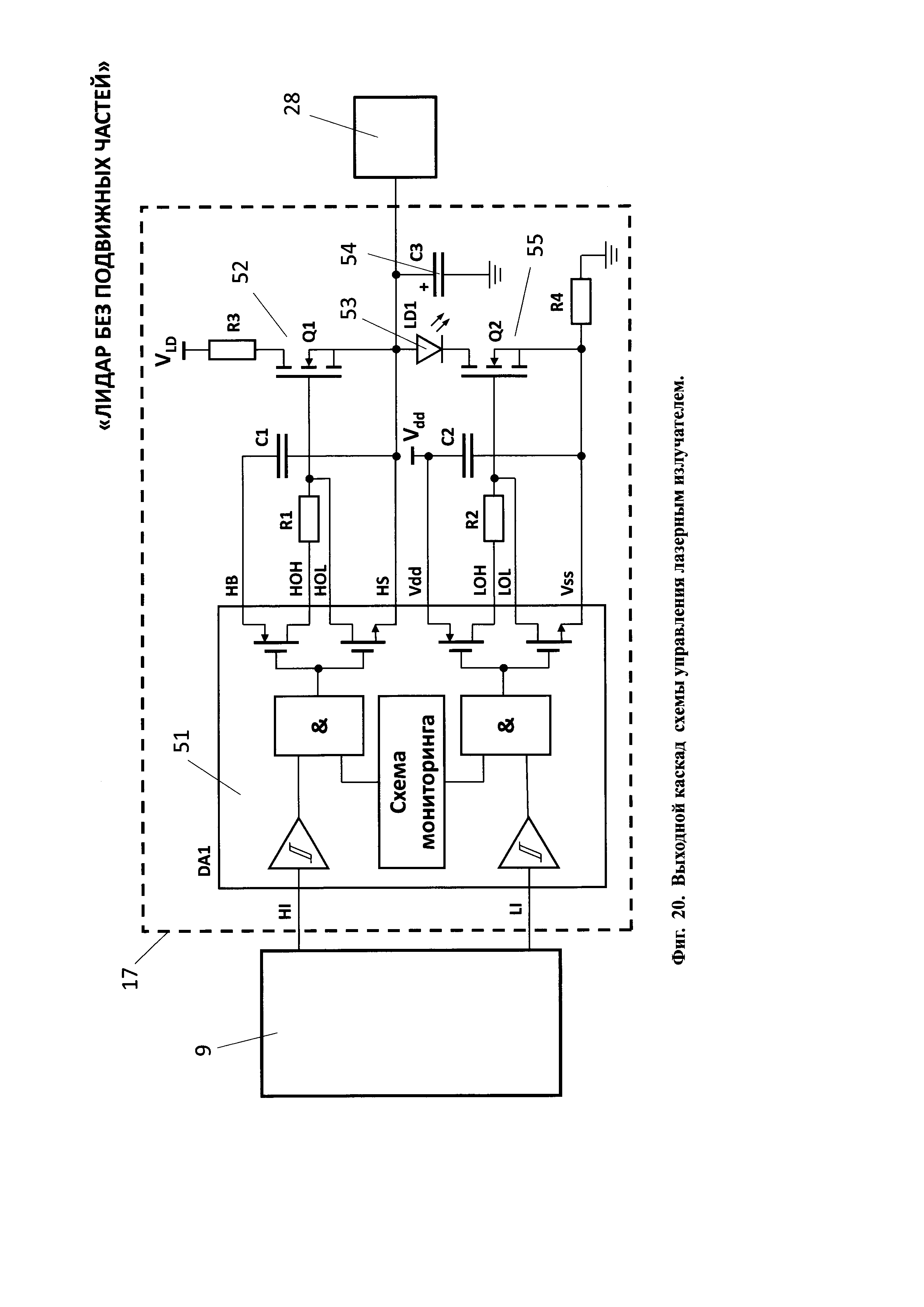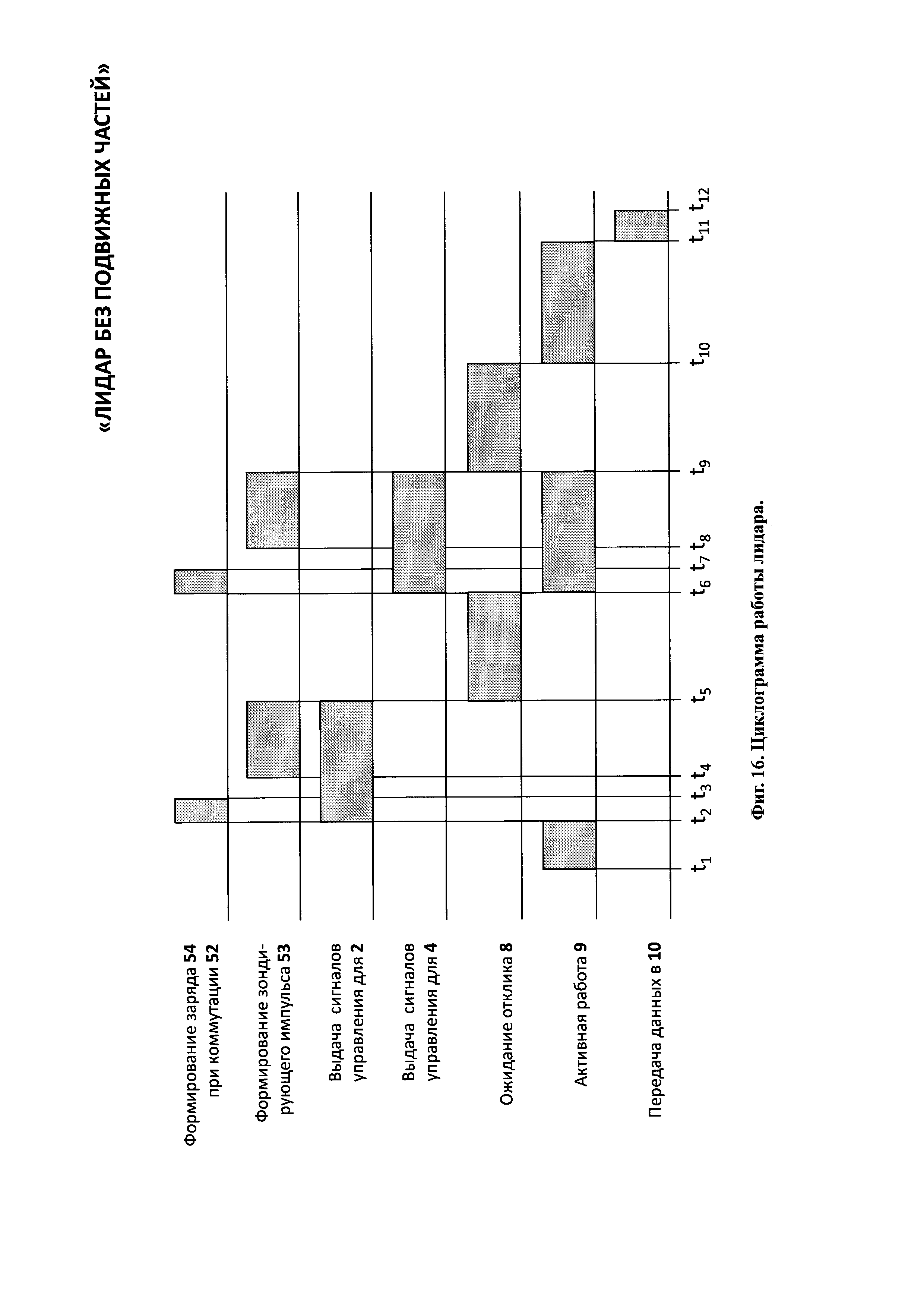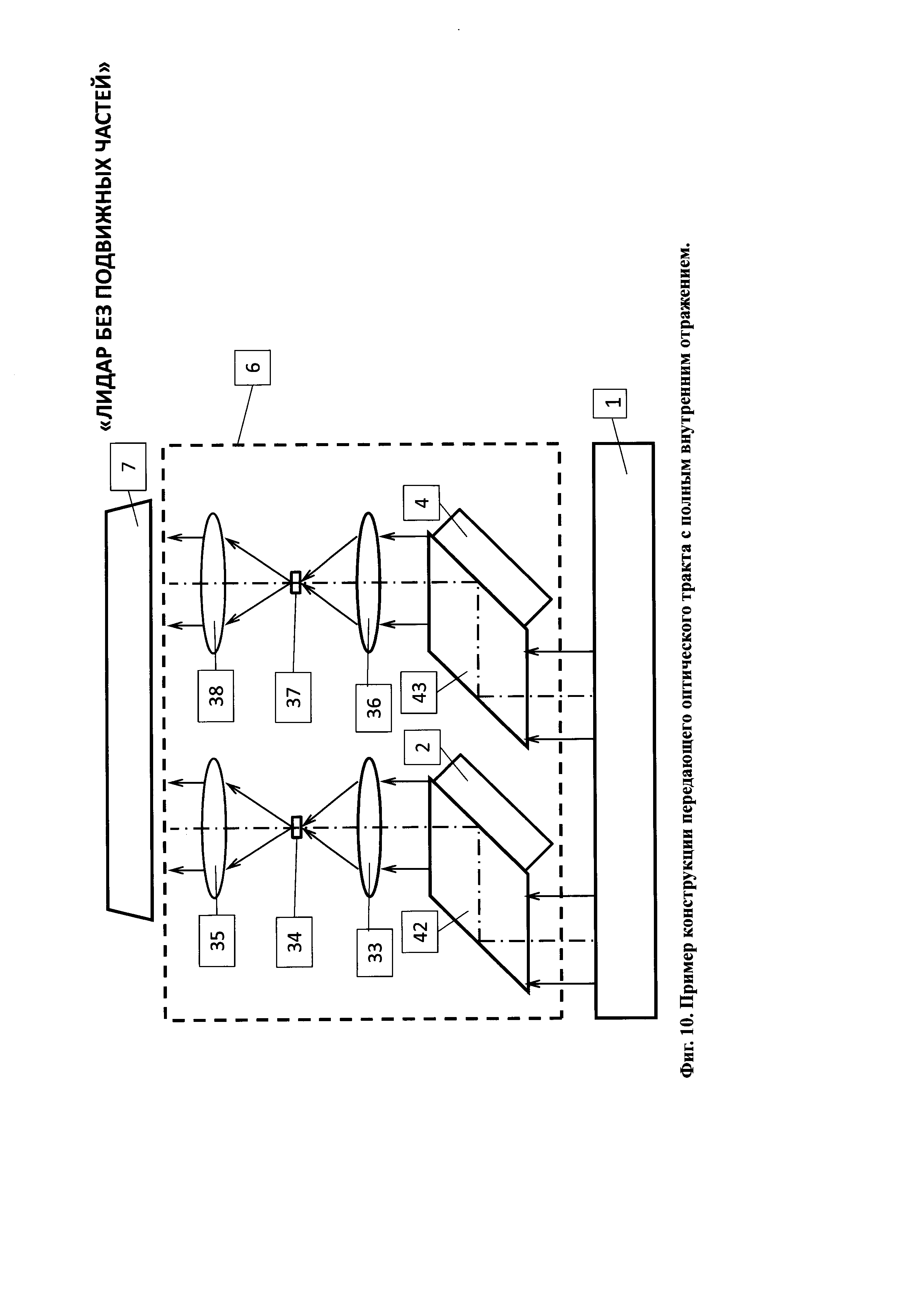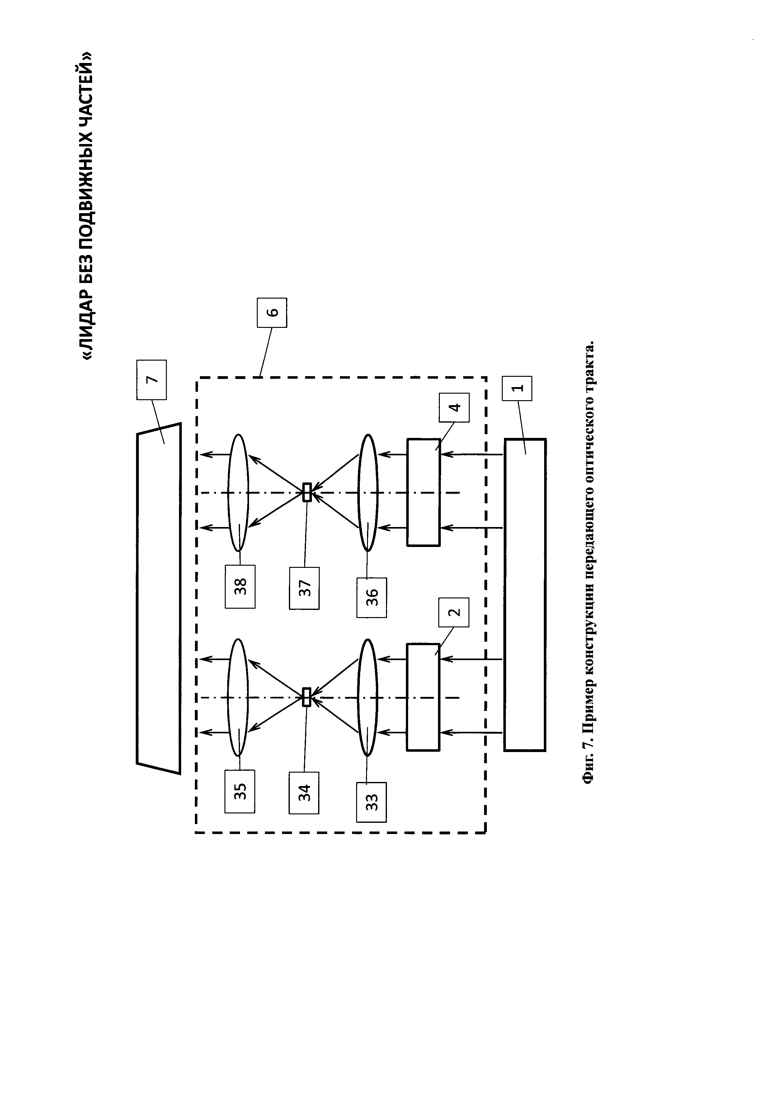 1. Лидар без подвижных частей содержит лазерный излучатель, горизонтальный линейный модулятор, систему управления горизонтальным линейным модулятором, вертикальный линейный модулятор, систему управления вертикальным линейным модулятором, передающий оптический тракт, направленный на объект наблюдения, приемный оптико-электронный тракт, цифровой вычислитель и потребитель информации, причем горизонтальный модулятор содержит нанесенную на первую диэлектрическую прозрачную подложку прозрачный электропроводящий слой, покрытый прозрачным гелеобразным слоем, и систему n штук линейчатых прозрачных горизонтальных электродов, расположенных в одной плоскости на второй диэлектрической прозрачной подложке, размещенных с зазором над прозрачным гелеобразным слоем и соединенных электрически с системой управления горизонтальным линейным модулятором, при этом n выходов системы управления горизонтальным линейным модулятором соединены с n входами системы линейчатых прозрачных электродов, при этом система линейчатых прозрачных горизонтальных n электродов покрывает световую апертуру второй диэлектрической прозрачной подложки, при этом все линейчатые прозрачные горизонтальные n электроды электрически изолированы друг от друга, а вертикальный линейный модулятор содержит нанесенную на первую диэлектрическую прозрачную подложку прозрачный электропроводящий слой, покрытый прозрачным гелеобразным слоем, и систему m штук линейчатых прозрачных вертикальных электродов, расположенных в одной плоскости на второй диэлектрической прозрачной подложке, размещенных с зазором над прозрачным гелеобразным слоем и соединенных электрически с системой управления вертикальным линейным модулятором, при этом m выходов системы управления соединены с m входами системы линейчатых прозрачных электродов, при этом линейчатые прозрачные вертикальные m электроды покрывают световую апертуру второй диэлектрической прозрачной подложки, при этом все линейчатые прозрачные вертикальные m электроды электрически изолированы друг от друга, причем лазерный излучатель, система управления горизонтальным линейным модулятором, система управления вертикальным линейным модулятором, приемный оптико-электронный тракт и потребитель информации электрически соединены с цифровым вычислителем, причем лазерный излучатель состоит из лазерного источника света, коллимматора, зеркала и расщепителя света на горизонтальный и вертикальный пучки, каждый из которых оптически соединен с горизонтальным линейным модулятором и вертикальным линейным модулятором, причем приемный оптико-электронный тракт состоит из расположенных последовательно на оптической оси объектива 21 приемного оптико-электронного тракта, полосового оптического фильтра, фотоприемного элемента, при этом фотоприемный элемент электрически связан с предварительным усилителем, а предварительный усилитель электрически связан с регулятором коэффициента усиления, причем цифровой вычислитель состоит по крайней мере из двух блоков согласования аналоговых сигналов, цифроаналогового преобразователя, время-цифрового преобразователя, центрального процессорного устройства, оперативного запоминающего устройства, постоянного запоминающего устройства, при этом блоки согласования аналого