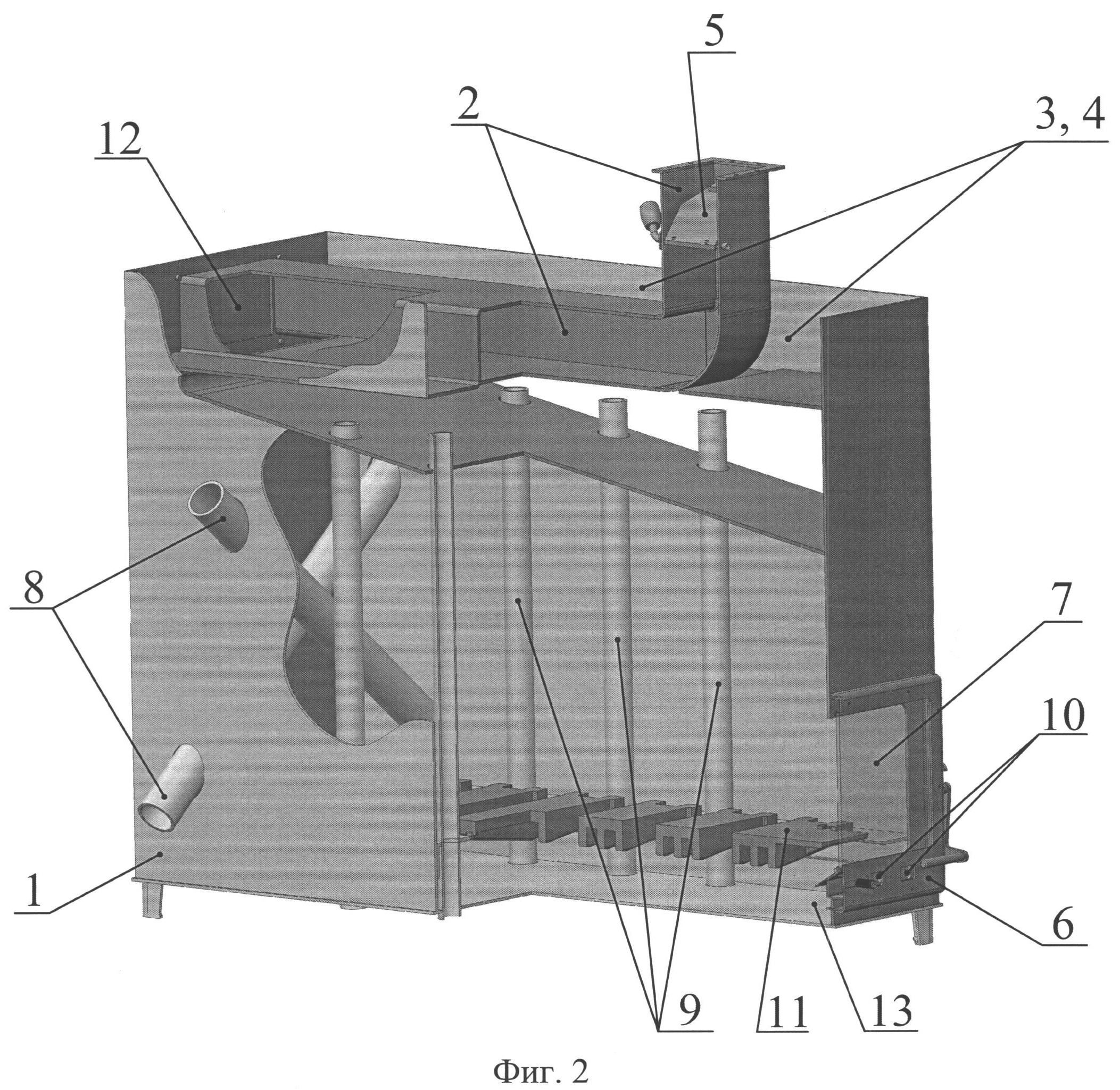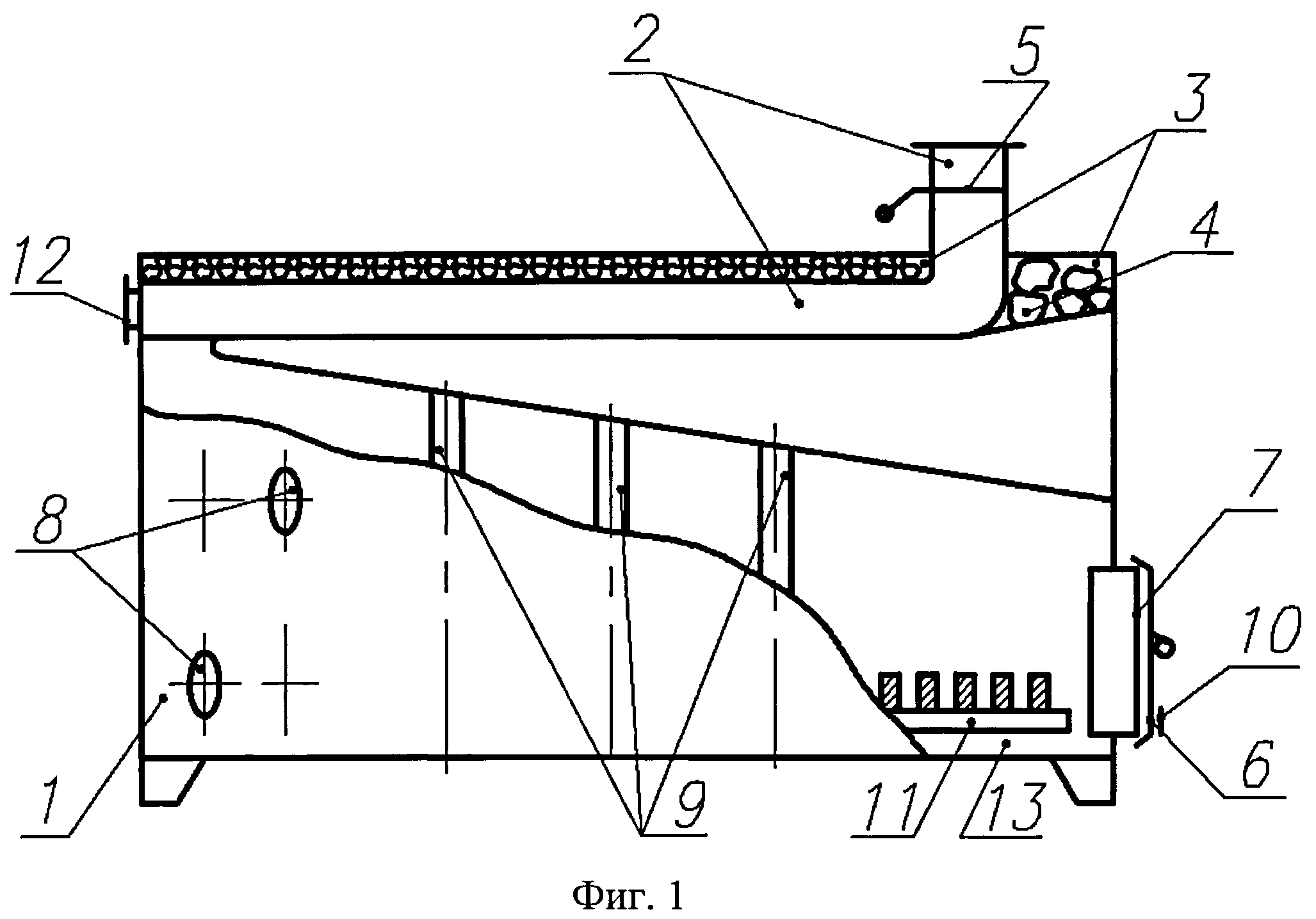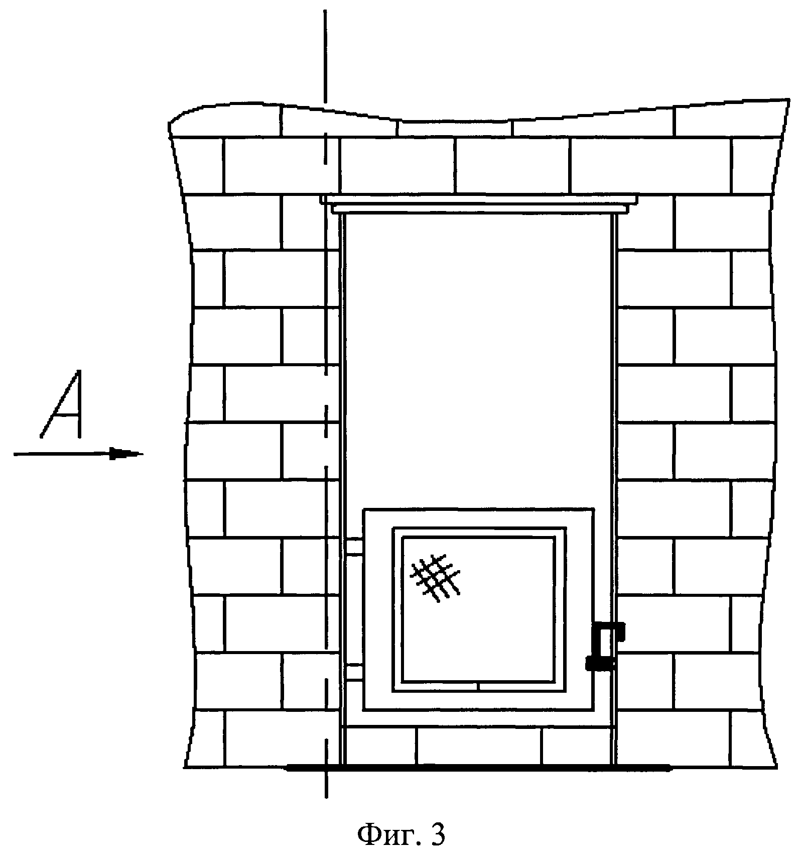 Изобретение относится к теплотехнике и может быть использовано при оборудовании индивидуальных или приусадебных бань для отопления, подогрева воды и пароснабжения. Известно множество печей-каменок, из них: - устройства [1. Шепелев A.M. Как построить сельский дом. - М.: Россельхозиздат, 1984. - С. 390; 2. Колеватов В.М. Печи и камины: Описание, руководство по сооружению, рабочие чертежи. - СПб.: Диамант, Золотой век, 1999. - С. 270-306; 3. Пат. RU №2039324, МПК6, F24B 1/18. Способ протапливания банной печи-каменки и банная печь-каменка. Опубликовано 09.07.1995 г.], выбранные в качестве аналогов, обладают существенными недостатками в обслуживании, создают дискомфорт при их использовании: возможно отложение сажи на камнях, загрязнение ею пара. Кроме того, печи [1; 2; 3] обладают значительной инерционностью при растапливании и низкой эффективностью (КПД); - устройства [4. Печь «Гекла». Дровяная печь-каменка бизнес-класса // Термофор. Сибирские печи, котлы и камины: Каталог. - [б.м.]: ООО «Термофор», 2010-2011. - С. 36-37; 5. Печи банные отопительные: Каталог. - [б.м.]: Компания «Ермак-Термо», 2010. - 18 с], выбранные также в качестве аналогов, имеют эстетичный внешний вид и гигиенически комфортные условия для пользователей. При их эксплуатации происходит ускоренный прогрев помещения за счет применения металла в качестве основного материала конструкции печи. Но при этом снижена экономичность печи, в маломерной топке колокольного типа с атмосферным диффузионным горением первый конус пламени касается конструкции печи, в результате чего снижается полнота горения, а в выходных газах повышены содержание СО и количество сажи, что снижает эффективность (КПД) печи и ухудшает экологию; - ближайшим устройством, принятым в качестве прототипа, является конвекционная пламенная печь [6. Пат. на полезную модель RU 103173, U1, МПК F24B 5/00 (2006.01) Конвекционная пламенная печь / Рябов Д.Б. заявл. 09.03.2010, опубл. 27.03.2011.], которая обладает теми же недостатками, что и аналоги, к тому же не имеет возможности регулирования процесса горения. Целью изобретения является создание простой, технологичной конструкции печи-каменки, обеспечивающей повышенную тепловую эффективность, экологические нормы при ее эксплуатации, исключающей недостатки аналогов и прототипа, сохраняя при этом их положительные качества. Осуществление поставленной цели достигается тем, что топка печи выполнена в виде диффузора с возможностью образования в нем турбулентного потока продуктов горения. Печь дополнена дымоходом, пропущенным по тепловой нише для прогрева камней без прямого контакта продуктов горения с ними и выполненным поворотным на выходе газов, а в дымовой трубе установлена регулирующая заслонка. На выходе воздухопроводных конвективных труб обеспечен турбулентный поток воздуха для эффективности теплообмена и сокращения времени прогрева помещения. Изобретение поясняется чертежами, где на фиг. 1 представлена печь-каменка, содержащая топку 1 с дымоходом 2 и дымовой трубой 3, тепловую нишу 4 под камни 5, заслонку регулирования тяги 6 в дымовой трубе 3, дверцу загрузочно-шуровочную 7 с термостеклом 8, трубы конвективные воздухопроводные 9, 10, жалюзи 11 на дверце 7, колосники 12, люк очистки сажи 13, зольник 14. На фиг. 2 указано аксонометрическое изображение, поясняющее вариант конструктивного исполнения печи. На фиг. 3, 4 указан вариант установки печи. Предлаг