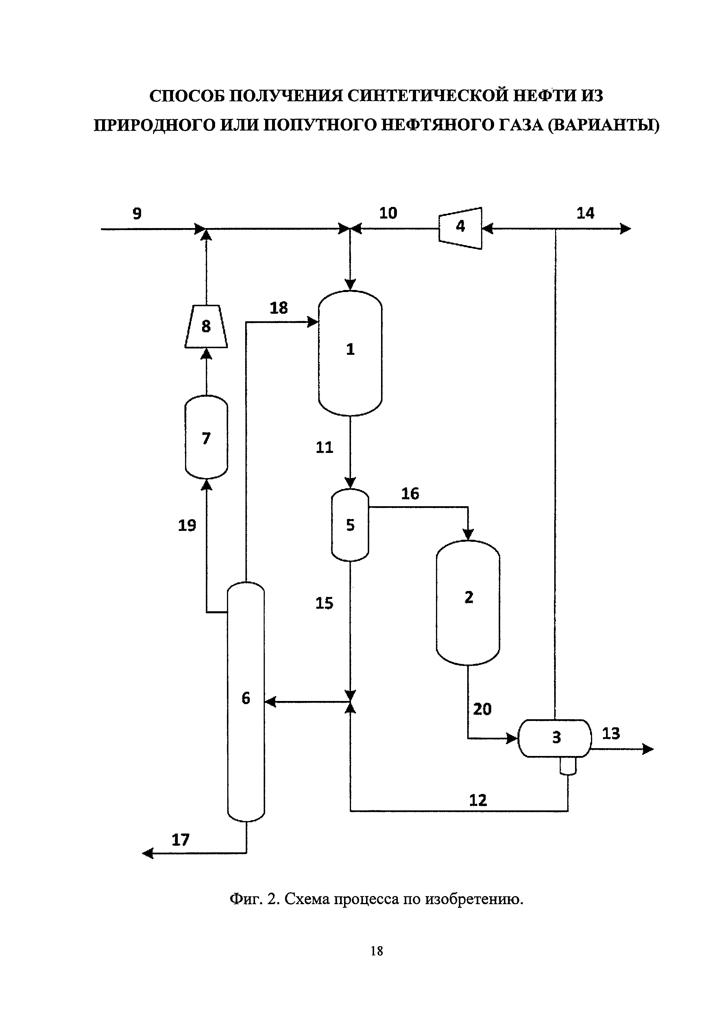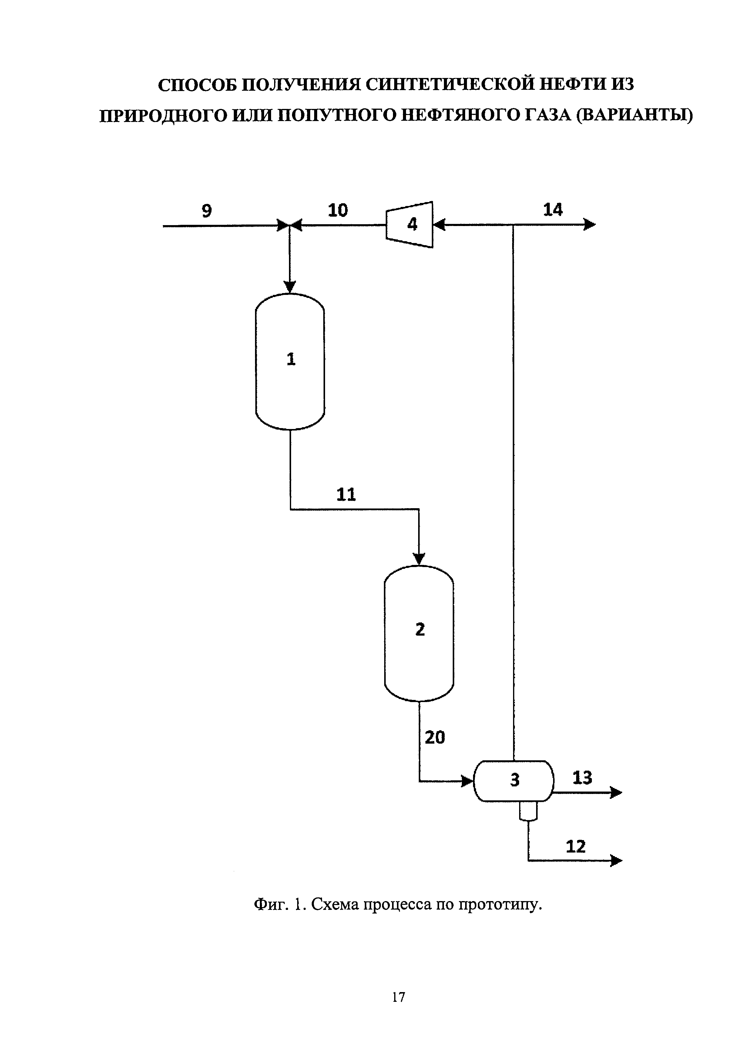Настоящее изобретение относится вариантам способа получения синтетической нефти из природного или попутного нефтяного газа. Один из вариантом способа включает стадию синтеза оксигенатов из исходного синтез-газа, полученного из указанного сырья, в присутствии металлооксидного катализатора, с получением смеси, содержащей оксигенаты, стадию получения углеводородов из указанной смеси в присутствии цеолитного катализатора, стадию разделения углеводородов на жидкую органическую фазу, которую выводят как продукт, газовую фазу и водный конденсат стадии получения углеводородов, и стадию возвращения части газовой фазы в реактор синтеза оксигенатов как циркулирующего газа. При этом кратность циркуляции составляет 3-5, в качестве металлооксидного катализатора используют катализатор, полученный таблетированием промышленного медьцинкалюминиевого катализатора МегаМакс-507 и активного оксида алюминия, взятых в массовом соотношении (1-2)/1, с коллоидным графитом в количестве 1,0% от массы катализатора, в качестве цеолитного катализатора - катализатор на основе декатионированного цеолита типа ZSM-5, модифицированного цинком и металлом, выбранным из семейства платины подгруппы VIIIB, состава, мас.%: NaO - 0,09, указанный металл 0,1-0,5, FeO- 0,5-1,0, ZnO - 2,0-5,0, AlO- 25,0, SiO- остальное, до стадии получения углеводородов из смеси, содержащей оксигенаты, предварительно выделяют водный конденсат стадии синтеза оксигенатов, который направляют на смешение с водным конденсатом стадии получения углеводородов, полученную смесь конденсатов направляют в ректификационную колонну, а дистиллят ректификационной колонны с содержанием метанола не менее 89,0 мас.% направляют в реактор синтеза оксигенатов. Предлагаемые варианты способа позволяют получить синтетическую нефть с низким содержанием ароматических соединений при сохранении селективности. 2 н.п. ф-лы, 2 ил., 2 табл., 8 пр.