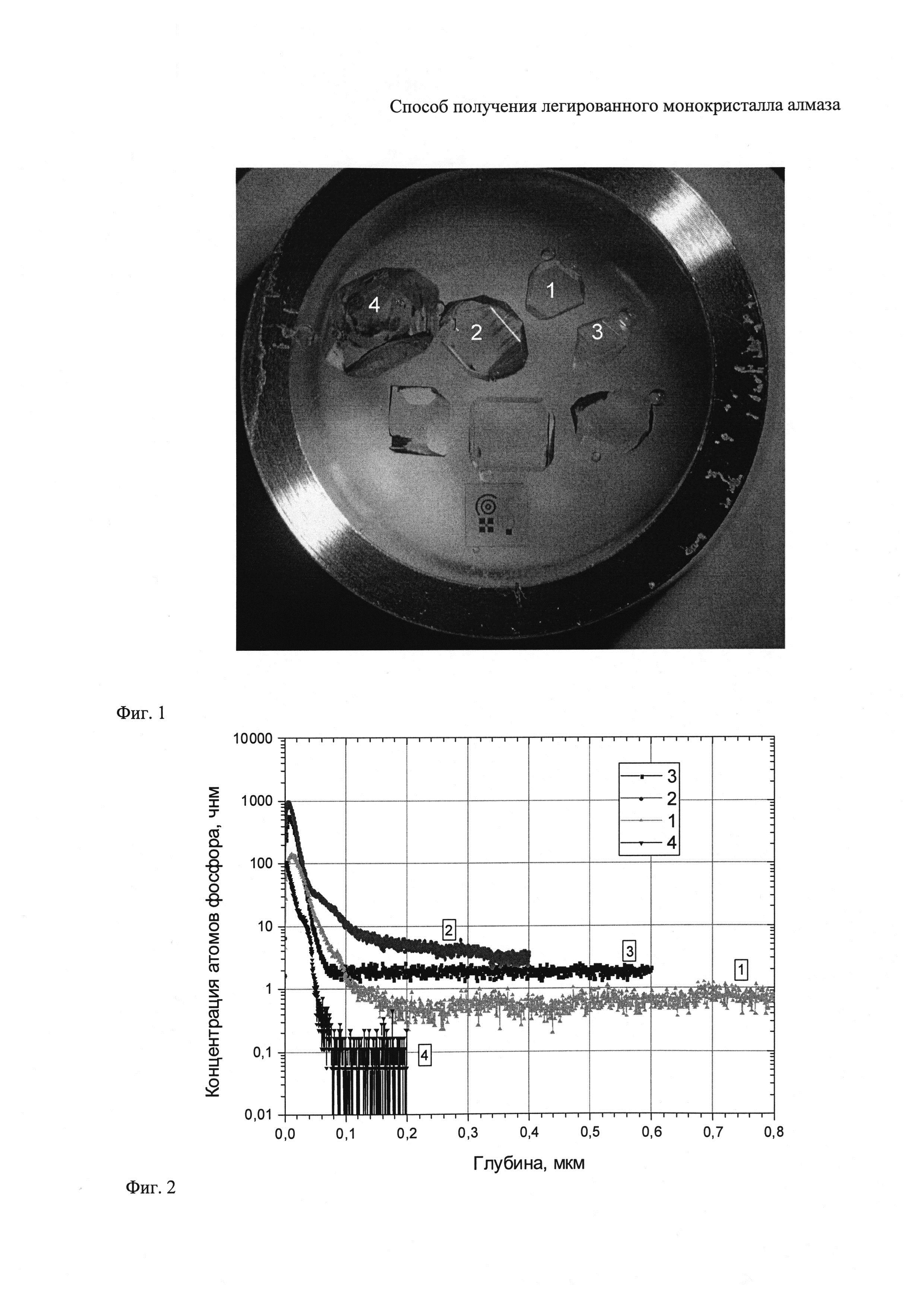 Изобретение относится к получению монокристаллов алмазов, в частности, легированных азотом и фосфором, при высоких давлениях и температурах, которые могут быть использованы в устройствах электроники. Атомы фосфора способны замещать атомы углерода в кристаллической решетке алмаза подобно тому, как это происходит в кремнии. Будучи элементом V группы, фосфор является донорной примесью в легированном кремнии. Алмаз как углеродная форма относится к IV-й группе элементов, также как и кремний, и имеет одинаковый с кремнием кубический тип кристаллической структуры. Закономерно, что фосфор выбирают в качестве донорной легирующей примеси при синтезе кристаллов алмаза с электронным типом электрической проводимости. Для применений в изделиях активной электроники, оптоэлектроники и акустоэлектроники требуются, в первую очередь, высококачественные синтетические монокристаллы алмаза. Известен способ выращивания монокристаллов алмаза в области его термодинамической стабильности на затравочном кристалле, который отделяют от источника углерода металлом-растворителем, в качестве которого используют сплав железа, алюминия и углерода, при создании температурного градиента между источником углерода и затравочным кристаллом 20-30°С, причем сплав железа, алюминия и углерода берут при следующем соотношении компонентов, вес. %: железо 89-92, алюминий 4-6, углерод 4-5, при этом нагрев осуществляют до начальной температуры в зоне роста, величина которой на 10-20°С выше температуры плавления сплава металла-растворителя, производят выдержку при этой температуре до 20 ч, а затем проводят периодически повторяющиеся циклы изменения температуры, включающие этап скачкообразного повышения температуры на 10-25°С выше начальной и этап понижения температуры до начальной со скоростью 0,2-3 градуса в минуту [С.А. Терентьев, В.Д. Бланк, С.А. Носухин, М.С. Кузнецов. Способ выращивания монокристаллов алмаза, Патент РФ на изобретение №2320404, МПК С01В 31/06, опубл. 27.03.2008 г.]. Таким способом выращивают крупные монокристаллы алмаза (весом более 3 карат) с массовой скоростью роста более 2 мг/ч, содержащие примесь азота не более 0,1 части на миллион атомов углерода (чнм). Легирование монокристаллов алмаза фосфором по этому способу выращивания не предусмотрено. Для ведения фосфора в алмаз использован метод роста на затравке в реакционной системе графит-фосфор при высоком давлении более 6,5 ГПа и высокой температуре 1800-2200°С [Akaishi М.; Kanda Н.; Yamaoka S. Phosphorus - An elemental catalyst for diamond synthesis and growth. - Science 1993, 259, P. 1592-1593; Michau D.; Kanda H.; Yamaoka S. Crystal growth of diamond from a phosphorus solvent under high pressure-high temperature conditions. - Diam. Relat. Mater. 1999, 8, P. 1125-1129; патент JP 5123562 (A), МПК: B01J 3/06, опубл. 1993.05.21]. В реакционной системе Fe-Ni-P-C монокристаллы алмаза с максимальными размерами в сечении до 4×4 мм2 выращены при давлении 5.4-5.8 GPa и температуре 1280-1360°С [Н.М. - Hua, В. Ning, L. Shang-Sheng, S. Tai-Chao, Z.A. - Guo, H. Qiang, J. Xiao-Peng, M. Hong-An. Effects of FeNi-phosphorus-carbon system on crystal growth of diamond under high pressure and high temperature conditions. Chin. Phys. B, 2015, 24, No. 3, 038101]. Однако концентрация фосфора в выращенных кристаллах не исследована. Легированные фосфором алмазы получены методом химического осаждения из газовой фазы, содержащей фосфор [Koizumi S.; Kamo М.; Sato Y.; Ozaki H.; Inuzuka Т. Growth and characterization of phosphorous doped {111} homoepitaxial diamond thin films. - Appl. Phys. Lett., 1997, 71, P. 1065-1067] и методом ионной имплантации ионов фосфора в кристаллы алмаза [Р.С. Нельсон, Д.А. Хадсон, Д.Д.