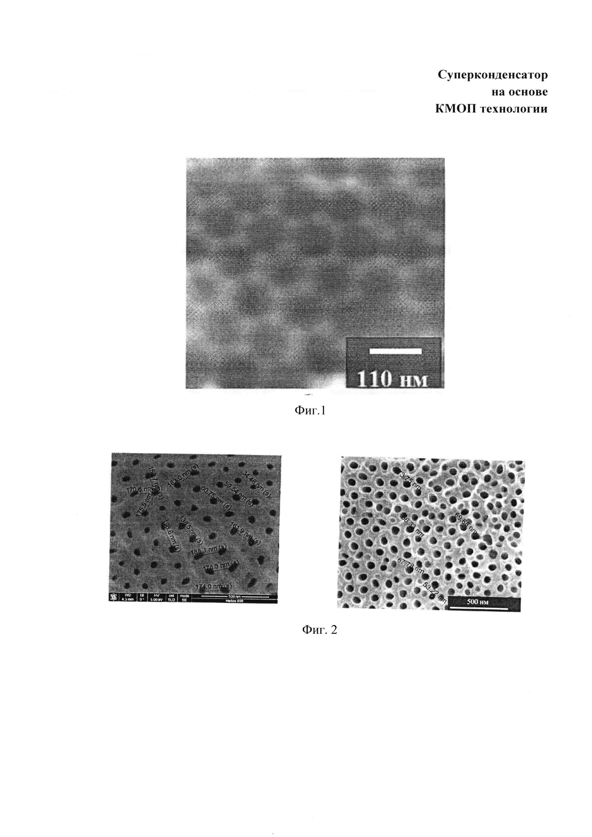 1. Твердотельный суперконденсатор, содержащий два электрода и размещенный между ними диэлектрический слой, конформно расположенный на нижнем электроде, при этом верхний электрод конформно расположен на диэлектрическом слое, отличающийся тем, что нижний электрод сформирован на профильно-структурированном основании из пористого оксида алюминия или титана. 2. Твердотельный суперконденсатор по п. 1, отличающийся тем, что рельефно-структурированное основание сформировано в полупроводниковой подложке. 3. Твердотельный суперконденсатор по п. 2, отличающийся тем, что рельефно-структурированное основание в полупроводниковой подложке является сквозным, а электроды суперконденсатора формируются с разных сторон полупроводниковой подложки.