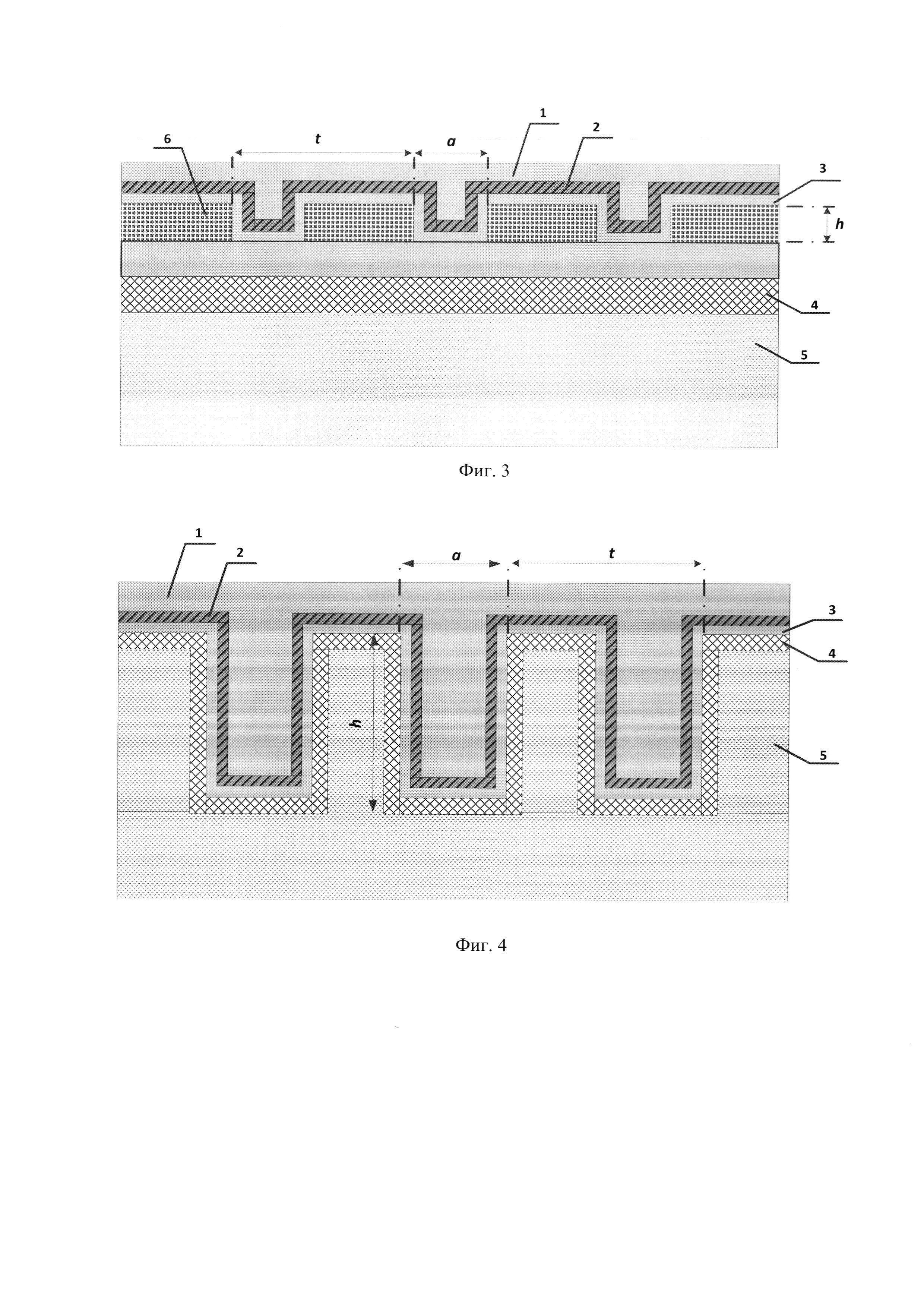 Изобретение относится к области изделий твердотельной микро- и наноэлектроники на основе КМОП-технологии и применяемых в ней материалов, а именно к твердотельным суперконденсаторам, и может быть использовано в качестве устройств для хранения энергии и электропитания разнообразных интегральных микросхем (ИМС), микроэлектронных устройств и приборов на основе микроэлектромеханических систем (МЭМС-приборов), к которым предъявляются высокие требования по циклическому ресурсу и готовности к работе. В настоящее время большие перспективы в области промышленного энергосбережения открывают суперконденсаторы, или, как их принято называть, ионисторы, которые позволяют хранить в сотни раз больше энергии, чем традиционные емкостные элементы, причем делать это на протяжении долгого времени без утечки заряда. Рассмотрим несколько аналогов предлагаемого суперконденсатора. Коллектив авторов (Carу L. Pint и др.) анализирует суперконденсатор на основе вертикально ориентированных углеродных нанотрубок (УНТ), формирование которых выходит за рамки КМОП-технологии [1]. Кроме того, выбранные в качестве нижнего электрода УНТ вследствие хаотичного формирования на поверхности не обеспечивают однородность по площади плотности накопленного заряда. И, таким образом, не обеспечивается точное воспроизведение номинала емкости с единицы площади суперконденсатора, необходимого для функционирования в составе ИМС. Известен накопительный конденсатор элемента памяти интегральных схем, содержащий первую и вторую обкладки и разделительную диэлектрическую область между ними [2]. Причем первая обкладка углублена в подложку и ее поверхность выполнена рельефной за счет формирования выступов из материала обкладки, а нижняя поверхность второй обкладки повторяет рельеф первой. При этом разделительная область выполнена из диэлектрического материала, а обкладки выполнены из легированного поликремния (Si*). Недостатком данного устройства является выбор в качестве материала обкладок легированного поликремния, который по сравнению с металлом обладает меньшей проводимостью и большой величиной зерна, что не позволяет минимизировать толщину обкладки и получить высокую плотность заряда по площади. Кроме того, формирование рельефа первой обкладки производится с применением трудоемкой и прецизионной операции - фотолитографии и использованием дорогого фотошаблона. Наиболее близким, по сути, к изобретению, является твердотельный суперконденсатор, содержащий два электрода и размещенный между ними диэлектрический слой, при этом нижний электрод выполнен из материала с большой удельной площадью поверхности, диэлектрический слой конформно и однородно расположен на нижнем электроде, верхний электрод конформно и однородно расположен на диэлектрическом слое и выполнен из оксида цинка, легированного алюминием, отличающийся тем, что материалом диэлектрического слоя является многокомпонентный оксид, содержащий смесь по меньшей мере двух оксидов из ряда TiO2, HfO2, ZrO2, Аl2O3, Та2O5, Nb2O5, Y2O3, (lantanoid)2O3, причем материал диэлектрического слоя имеет диэлектрическую проницаемость слоя в интервале 10-30 [3]. К недостаткам прототипа можно отнести материалы нижнего и верхнего электрода. Нижний электрод состоит из углеродных нанотрубок (УНТ), которые, как отмечено выше, обладают п