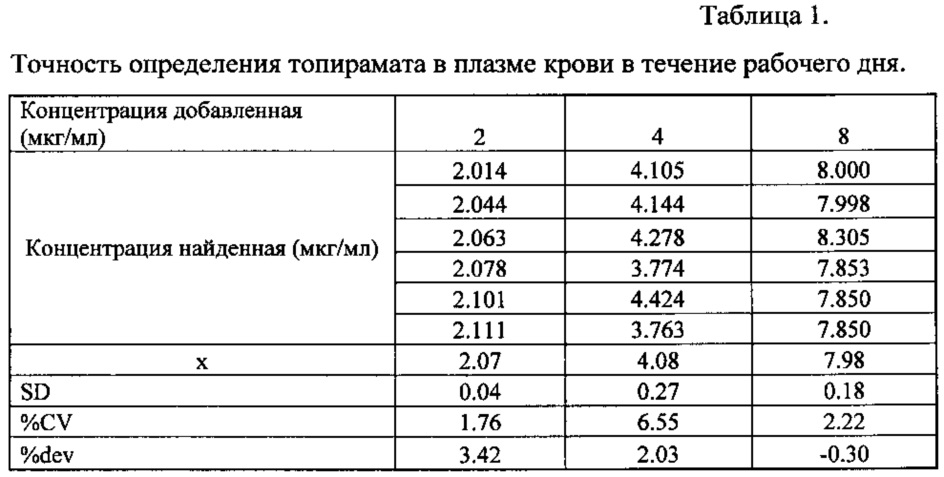 Изобретение относится к области медицины, а именно к фармакологии, и может быть использовано для количественного определения топирамата в плазме крови человека с целью проведения терапевтического лекарственного мониторинга данного препарата у пациентов в условиях стационара. Топирамат - противоэпилептическое средство относится к классу сульфат-замещенных моносахаридов. Химическое название 2,3:4,5-Ди-O-изопропилиден-бета-D-фруктопиранозы сульфамат; брутто-формула C12H21NO8S. В связи с появлением новых технологий в фармакокинетике, фармакогенетике и аналитической химии современная медицина выходит на качественно новый этап развития. Базисом рациональной терапии в современной медицине становится терапевтический лекарственный мониторинг - способ управления и контроля эффективности фармакотерапии в реальном времени. Как известно, главная цель рациональной терапии - максимальный лечебный эффект при минимальном побочном действии. Для достижения этой цели в клинике осуществляется разнонаправленный мониторинг больных, с целью получения исчерпывающей информации об их состоянии. Такого рода информацию можно получить различными способами, в том числе и терапевтический лекарственный мониторинг. Топирамат уменьшает частоту возникновения потенциалов действия, характерных для нейрона в состоянии стойкой деполяризации, что свидетельствует о зависимости блокирующего действия препарата на натриевые каналы от состояния нейрона. Топирамат потенцирует активность GABA в отношении некоторых подтипов GABA-рецепторов (в т.ч. GABAA-рецепторов), а также модулирует активность самих GABAA-рецепторов, препятствует активации каинатом чувствительности каинат/АМПК-рецепторов к глутамату, не влияет на активность N-метил-D-аспартата в отношении NMDA-рецепторов. Эти эффекты топирамата являются дозозависимыми при концентрации топирамата в плазме от 1 мкМ до 200 мкМ, с минимальной активностью в пределах от 1 мкМ до 10 мкМ. Кроме того, топирамат угнетает активность некоторых изоферментов карбоангидразы, однако этот эффект у топирамата более слабый, чем у ацетазоламида и, по-видимому, не является главным в противоэпилептической активности топирамата. На сегодняшний день известен способ оптимизации режима дозирования противоэпилептических препаратов, в том числе и топирамата, путем забора биологического материала и проведения полимеразной цепной реакции по генам-кандидатам с последующим анализом их аллельных вариантов. Далее, путем сопоставления выявленного аллельного полиморфизма с данными о его влиянии на эффективную терапевтическую дозу и возникновении побочных эффектов, производится расчет эффективной терапевтической дозы противоэпилептического препарата и определение риска развития побочных эффектов. Предложенное изобретение позволяет с высокой точностью определять эффективную терапевтическую дозу и наличие риска развития побочных эффектов (RU 2574204, 10.02.2016). Это эффективный метод молекулярной биологии, но в то же время он довольно трудоемок и требует наличия опытных специалистов по проведению данной реакции. Необходимо отметить, что наличие фармакогенетической информации о пациенте действительно обладает определенной прогностической ценностью, однако фармакогенетический скриннинг сам по себе не отменяет необходимости измерения 