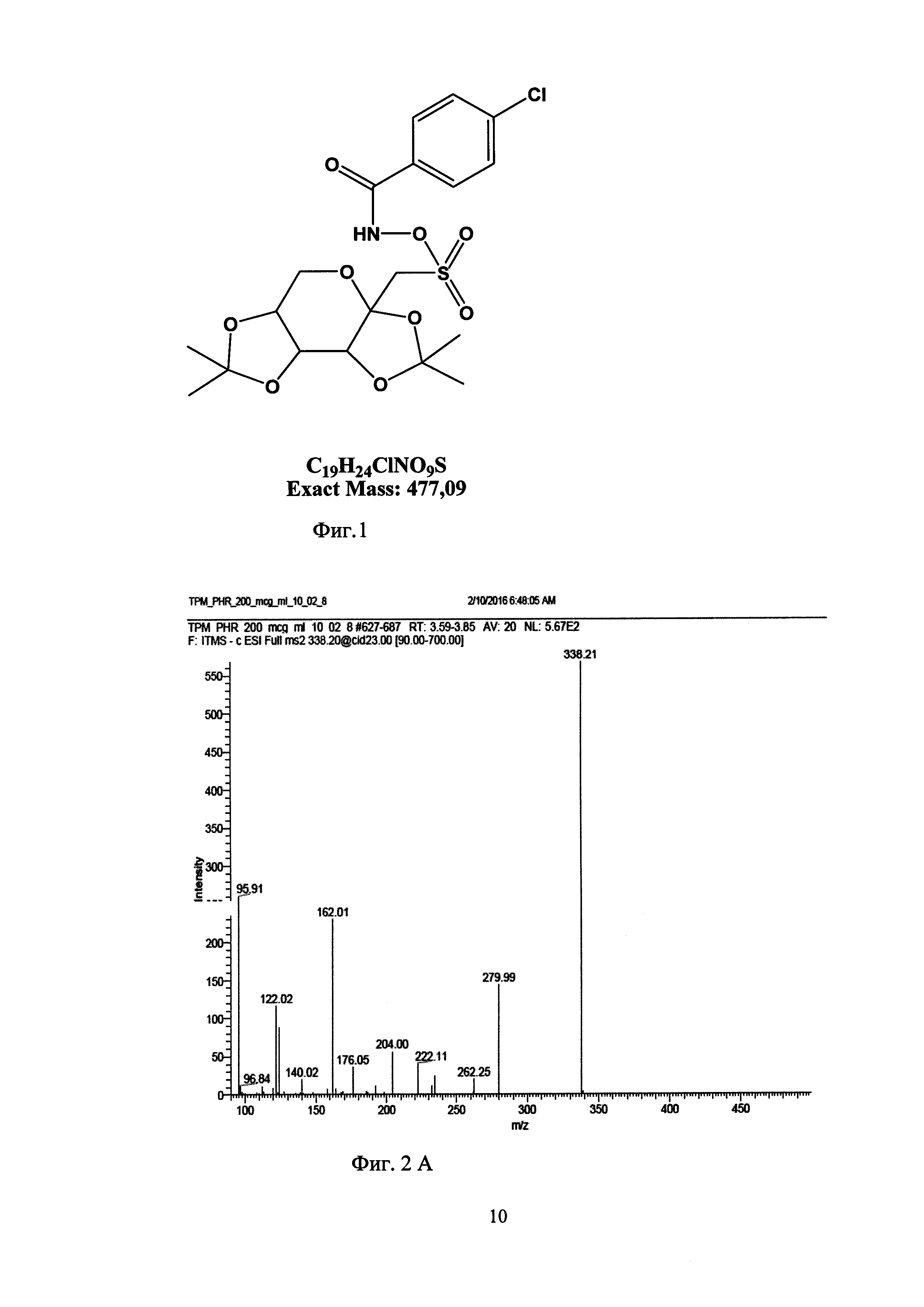 Способ количественного определения топирамата в плазме крови, включающий анализ крови на наличие топирамата высокоселективным методом хроматомасс-спектрометрии, отличающийся тем, что проводят хроматомасс-спектрометрию с использованием матрицы в виде плазмы крови с топираматом и внутреннего стандарта, вещества, близкого по строению молекулы к анализируемому веществу - 2,3-4,5-бис-О-изопропилиден-бета-D-фруктопиранозы-N-(4-хлорбензоил)сульфамата, разделение продуктов экстракции проводят на обращенно-фазной хроматографической колонке 4,6×150 мм, при этом в качестве элюента применяют 10 мМ ацетат аммония - раствор А и смесь ацетонитрила и 10 мМ ацетата аммония в отношении 90:10 - раствор Б, взятых в процентном соотношении раствора А к раствору Б 40:60 соответственно, с температурой разделения 35°C, и скоростью подачи элюента 0,8 мл/мин, детектирование топирамата проводят по четырем дочерним ионам с m/z 95.9, 122.0, 161.9, 280.0, образующимся в результате фрагментации родительского молекулярного иона топирамата с m/z 338.2, а его концентрацию рассчитывают по формуле С=15,06732079×AR, где С - концентрация топирамата (мкг/мл), AR - отношение площади хроматографического пика топирамата к площади пика внутреннего стандарта.