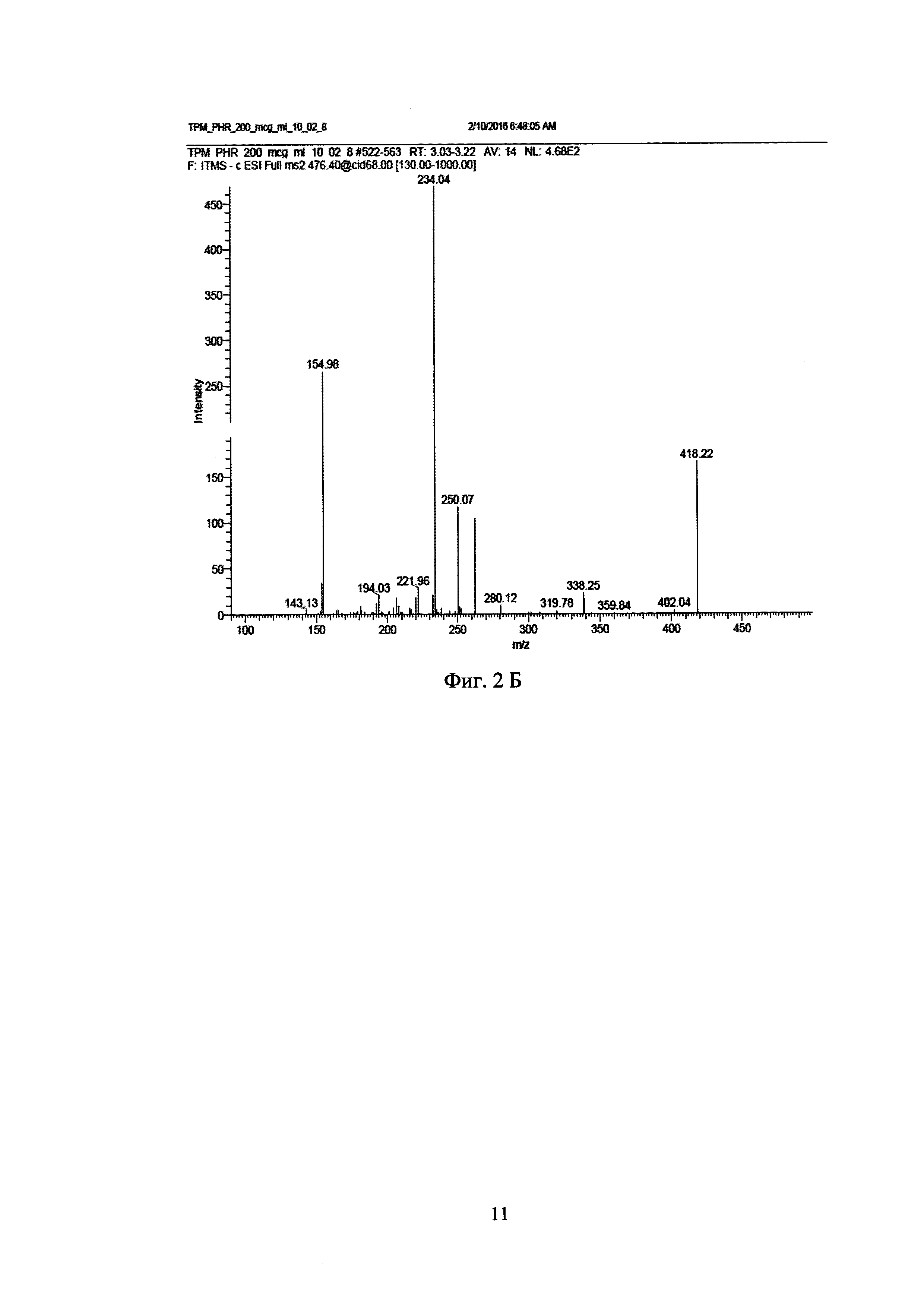 Изобретение относится к фармакологии и может быть использовано для проведения терапевтического лекарственного мониторинга топирамата у пациентов в условиях стационара. Для этого проводят количественное определение топирамата в плазме крови человека с использованием высокоселективного метода хроматомасс-спектрометрии. Анализ проводят с использованием матрицы раствора внутреннего стандарта - 2,3-4,5-бис-О-изопропилиден-бета-D-фруктопиранозы-N-(4-хлорбензоил)сульфамата и топирамата, полученного экстракцией из плазмы крови. Разделение продуктов экстракции проводят на колонке ХTerra MS C18. Элюирование со скоростью 0,8 мл/мин при температуре колонки 35°C проводят раствором А (10 мМ ацетат аммония) и раствором Б (смесь ацетонитрила и 10 мМ ацетата аммония в отношении 90:10) в соотношении раствор А : раствор Б = 40:60 (%). Топирамат детектируют по четырем дочерним ионам с m/z 95.9, 122.0, 161.9, 280.0, образующимся в результате фрагментации родительского молекулярного иона топирамата с m/z 338.2, а его концентрацию рассчитывают по формуле: С=15,06732079×AR, где С - концентрация топирамата (мкг/мл), AR - отношение площади хроматографического пика топирамата к площади пика внутреннего стандарта. Изобретение позволяет количественно и с высокой достоверностью определять топирамат в плазме крови пациентов. 1 табл., 4 ил.