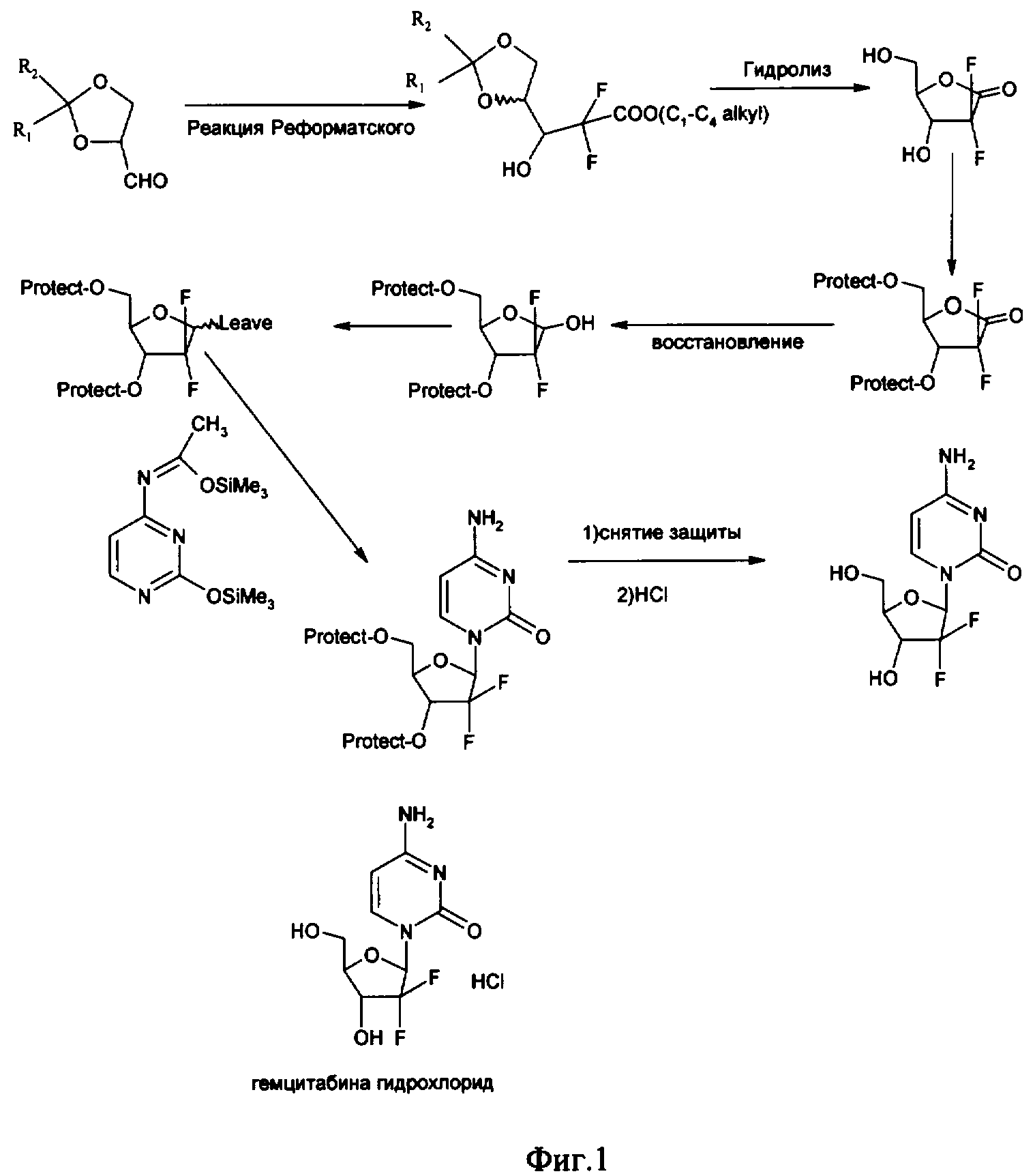 ОБЛАСТЬ ТЕХНИКИ Изобретение относится к области медицинской органической химии, конкретно к улучшенному способу получения гемцитабина гидрохлорида, обладающего антивирусной и противоопухолевой активностью. УРОВЕНЬ ТЕХНИКИ Гемцитабин по своей химической природе представляет собой 4-амино-1-[(2R,4R,5R)-3,3-дифтор-4-гидрокси-5-(гидроксиметил)тетрагидрофуран-2-ил]-1Н-пиримидин-2-она гидрохлорид и является фторированным аналогом природного нуклеозида цитидина, одного из строительных блоков синтеза нуклеиновых кислот клетки. Предполагаемый механизм действия гемцитабина гидрохлорида состоит во внутриклеточном 5'-фосфорилировании гемцитабина гидрохлорида при участии нуклеозидкиназы до активных дифосфатных и трифосфатных нуклеозидов. Цитотоксический эффект обусловлен встраиванием модифицированных нуклеозидов-метаболитов в цепочки ДНК, и, как следствие, нарушением синтеза ДНК, приводящим к смерти клетки (Справочник Видаль. Лекарственные препараты в России: справочник. М.: АстраФармСервис, 2001, раздел 3, стр.155). Способы получения гемцитабина гидрохлорида описаны в уровне техники и представляют собой сложные многостадийные синтезы (вариант по европейскому патенту ЕР 0184365 А2 заявителя Элли Лилли энд Компани приведен на фиг.1), при этом полупродукты требуют дополнительной очистки перед введением в следующую стадию. Впервые гемцитабина гидрохлорид (химическое название 4-амино-1-[(2R,4R,5R)-3,3-дифтор-4-гидрокси-5-(гидроксиметил)тетрагидрофуран-2-ил]-1Н-пиримидин-2-она гидрохлорид) был получен компанией Эли Лилли (патент США 4526988 и США 4808614), выпускающей на основе данной субстанции препарат «Гемзар». Один из вариантов способа заключается в том, что этилбромдифторацетат подвергают взаимодействию с D-глицеральдегидкетонидом, а именно с 2,2-диметил-[1,3]-диоксолан-4-карбальдегидом среде ТГФ и диэтилового эфира в присутствии цинка (реакция Реформатского). При этом для активации цинка можно использовать ультразвуковую энергию. Полученный этил 3-гидрокси-2,2-дифтор-3-[2,2-диметил-[1,3]-диоксолан-4-ил]пропионат подвергают циклизации с помощью ионообменной смолы Dowex 50W-X12 в среде растворителя с получением 2-дезокси-2,2-дифтор-1-оксорибозы ((4R,5R)-4-гидрокси-5-гидроксиметил-3,3-дифтордигидрофуран-2(3Н)-она). После введения защитных трет-бутилдиметилсилильных групп получают 3,5-бис(трет-бутилдиметилсилилокси)-2-дезокси-2,2-дифтор-1-оксорибозу ((4R,5R)-4-трет-бутилдиметилсилилокси-5-((трет-бутилтриметилсилилокси)метил)-3,3-дифтордигидрофуран-2(3Н)-он). Полученный продукт подвергают восстановлению диизобутилалюмогидридом. В полученном продукте модифицируют гидроксигруппу в положении 2 тетрагидрофуранового кольца взаимодействием с метансульфонилхлоридом и получают 3,5-бис-(трет-бутилдиметилсилилокси)-1-метансульфонилокси-2-дезокси-2,2-дифторрибозу ((4R,5R)-2-метансульфонилокси-4-(трет-бутилдиметилсилил)-5-((трет-бутилдиметилсилилокси)метил)-3,3-дифтортетрагидрафуран). Полученный продукт подвергают взаимодействию с 5-метил-2,4-бис-(триметилсилилокси)пиримидином и трифторметансульфонилокситриметилсиланом в качестве инициатора с получением 1-(5-метил-2,4-диоксо-1Н,3Н-пиримидин-1-ил)-1,2-дезокси-2,2-дифторрибозы (4-амино-1-[(2R,4R,5R)-3,3-дифтор-4-гидрокси-5-(гидроксиметил)тетрагидрофуран-2-ил]-1Н-пиримидин-2-она, или гемцитабина). Недостатком этого способа является получение на стадии реакции Реформатског