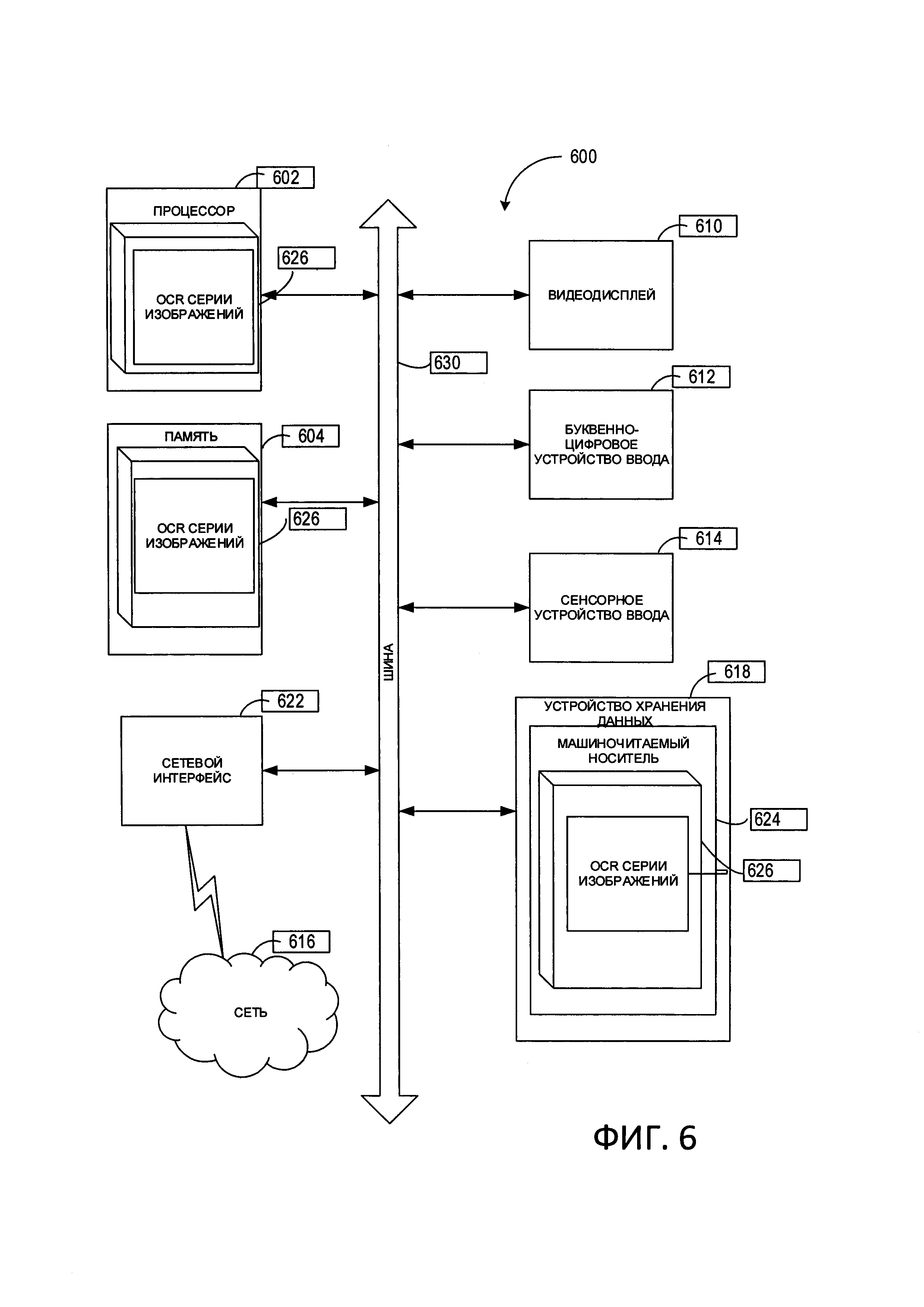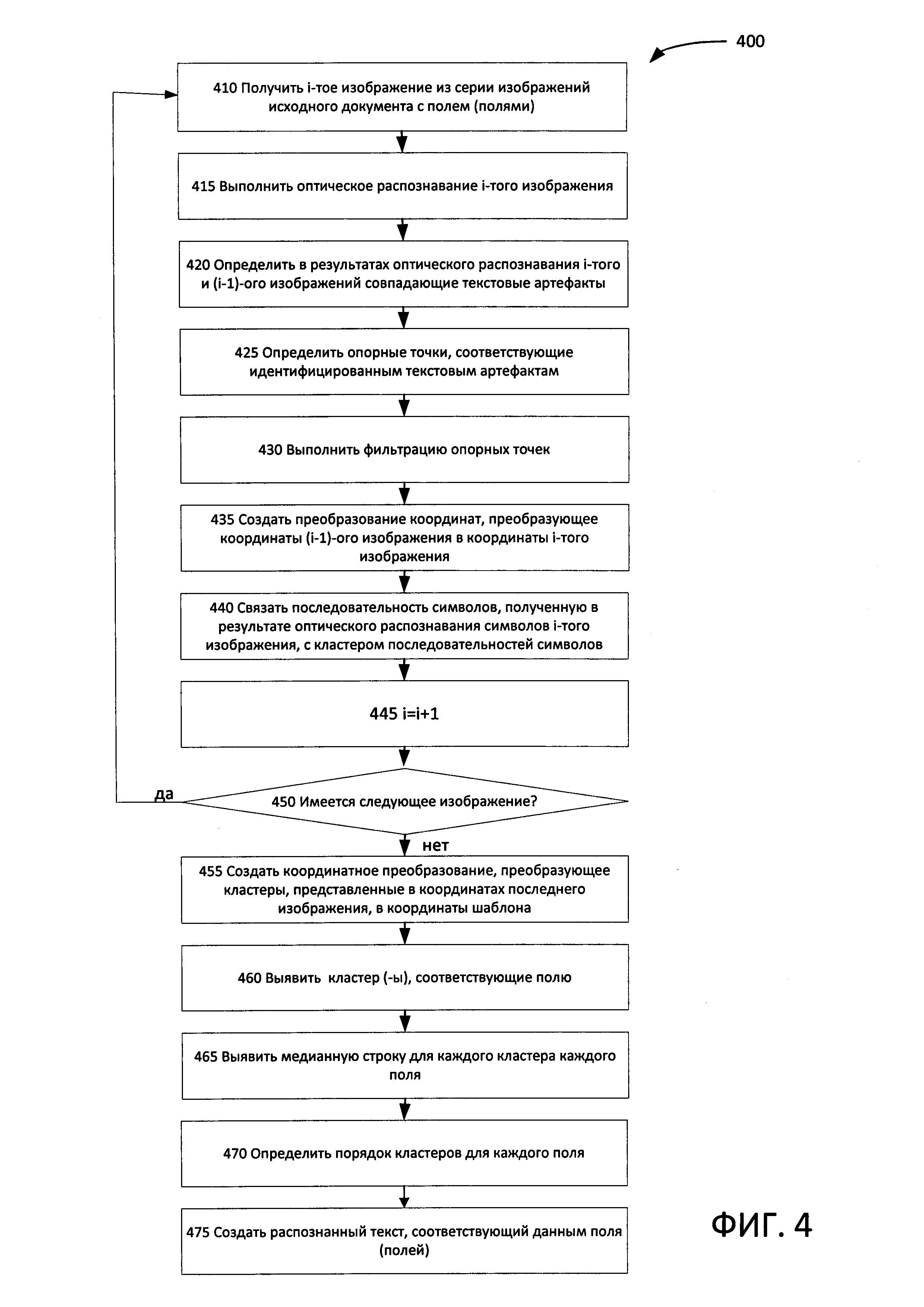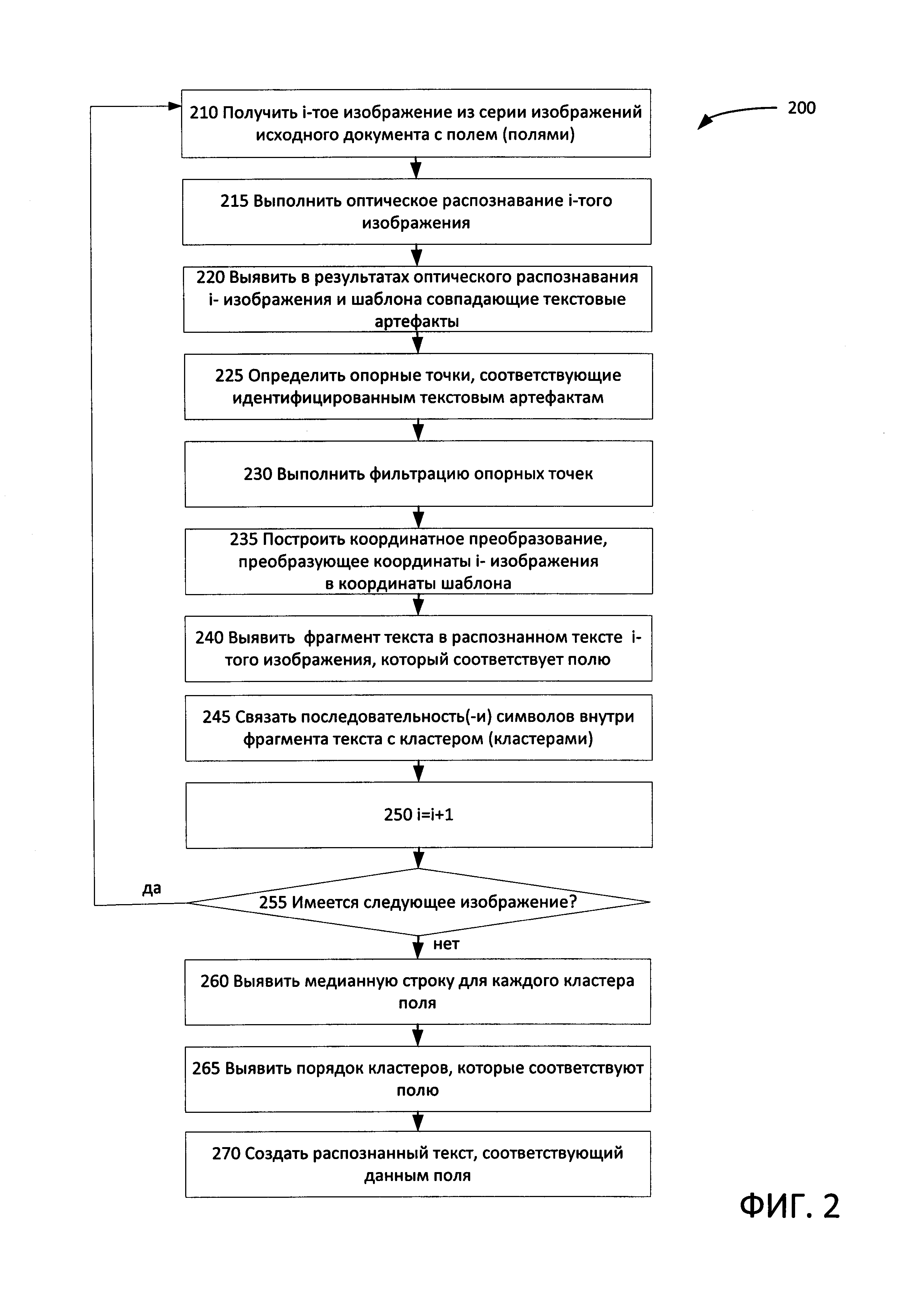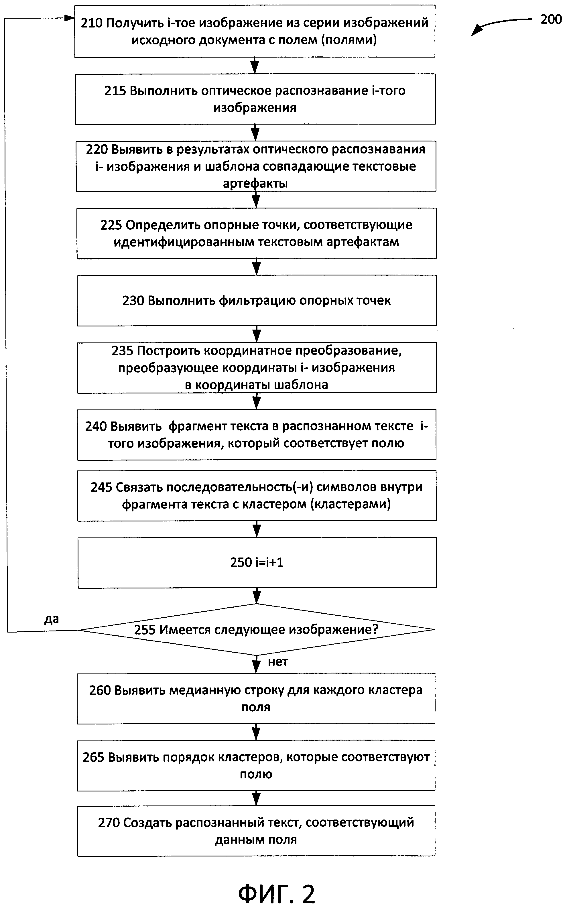 ОБЛАСТЬ ТЕХНИКИ [001] Настоящее изобретение в целом относится к вычислительным системам и способам, в частности к системам и способам оптического распознавания символов (OCR), включая системы и способы OCR для извлечения информации из структурированных документов (жестких форм). УРОВЕНЬ ТЕХНИКИ [002] Оптическое распознавание символов (OCR) представляет собой реализованное вычислительными средствами преобразование изображений текстов (включая типографский, рукописный или печатный текст) в машиночитаемые электронные документы. РАСКРЫТИЕ ИЗОБРЕТЕНИЯ [003] Одним из вариантов реализации изобретения является способ, включающий: (а) получение устройством обработки вычислительной системы текущего изображения из серии изображений копии шаблонного документа при этом созданный по шаблону документ имеет по крайней мере один статический элемент и по крайней мере одно информационное поле; (b) выполнение оптического распознавания символов (OCR) текущего изображения для получения распознанного текста и соответствующих координат каждого символа распознанного текста; (с) определение параметров преобразования координат для преобразования координат текущего изображения в координаты шаблона, при этом шаблон содержит i) текст и координаты как минимум одного статического элемента шаблонного документа и ii) координаты как минимум одного информационного поля шаблонного документа; (d) определение в распознанном тексте для текущего изображения в системе координат шаблона, фрагмента текста, который соответствует информационному полю как минимум одного информационного поля; (е) связывание в системе координат шаблона текстового фрагмента, который соответствует информационному полю, с одним или более кластерами последовательностей символов, при этом текстовый фрагмент получен путем обработки текущего изображения, и при этом последовательности символов получены путем обработки ранее полученных изображений из серии изображений; (f) создание для каждого кластера из одного или более кластеров медианной строки, соответствующей кластеру последовательностей символов информационного поля; и (g) создание с помощью медианной строки каждого из одного или более кластеров итогового распознанного текста, который соответствует исходному тексту информационного поля копии шаблонного документа. [004] Другим вариантом осуществления изобретения является способ, включающий: (а) получение с помощью устройства обработки вычислительной системы текущего изображения из серии изображений копии шаблонного документа при этом текущее изображение по крайней мере частично совпадает с предыдущим изображением из серии изображений, и шаблонный документ имеет по крайней мере один статический элемент и по крайней мере одно информационное поле; (b) выполнение оптического распознавания символов (OCR) текущего изображения для получения распознанного текста и соответствующих координат для каждого символа распознанного текста; (с) определение параметров преобразования координат для преобразования координат предыдущего изображения в координаты текущего изображения; (d) привязка по крайней мере части распознанного текста к одному или более кластерам последовательностей символов, при этом распознанный текст получен при обработке текущего изображения, и при этом пос