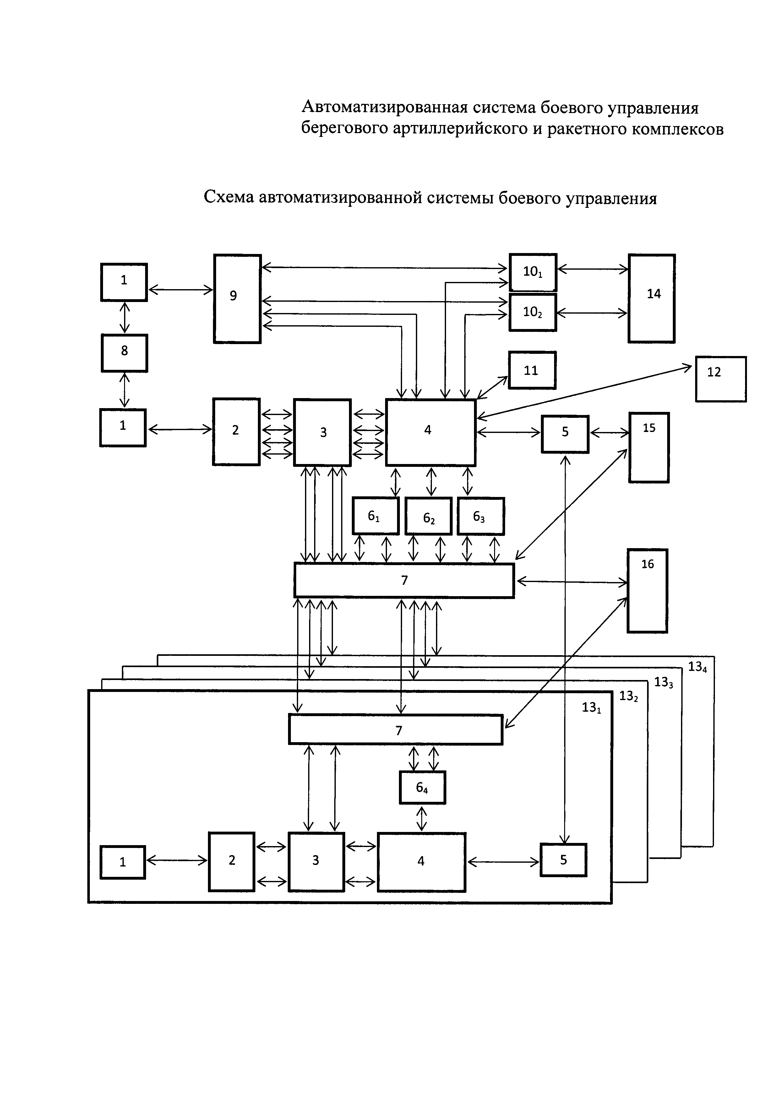 Автоматизированная система боевого управления берегового артиллерийского и ракетного комплексов содержит ЭВМ, аппаратуру передачи данных со средствами связи, технические средства автоматизации для обслуживания огневых устройств, многоканальное коммутирующее устройство, две радиостанции дециметрового волнового диапазона, аппаратуру передачи данных реального времени, аппаратуру внутренней связи, три высокоскоростных проводных модема (ВПМ), комплекс управления средствами поражения. Комплекс управления средствами поражения содержит ЭВМ, аппаратуру передачи данных со средствами связи, технические средства автоматизации, ВПМ, радиостанцию спутниковой связи. Обеспечивается максимальная оперативность обмена информацией и взаимодействия внутри системы и с внешними комплексами целеуказания и разведки, расширение функциональных возможностей. 1 ил.