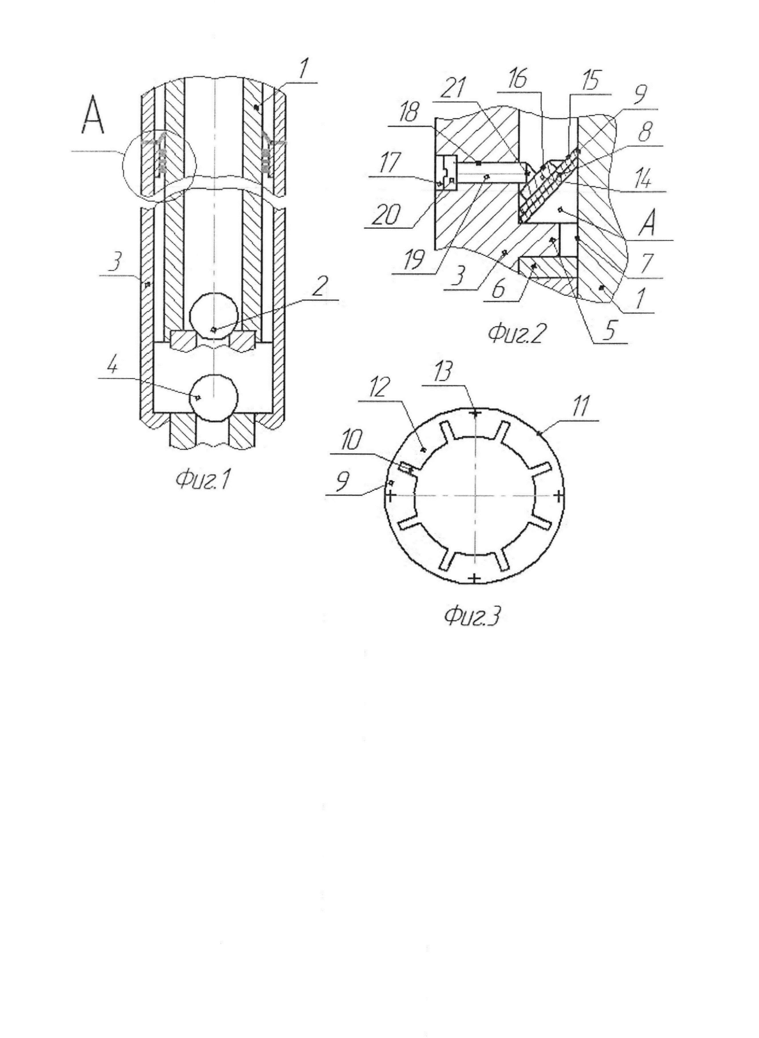 Изобретение относится к отрасли нефтедобывающей промышленности и предназначено для добычи нефти из скважин. Известен скважинный штанговый насос (а. св. СССР №909298, М.Кл. F04В 47/00, опубл. 05.03.1982), содержащий цилиндр, полый плунжер с трубкой на нижнем конце, вращатель потока жидкости, выполненный в виде шнека и с патрубком, сообщающим полость трубки с наружной поверхностью плунжера. В известном насосе при ходе плунжера вверх в зазор между плунжером и цилиндром попадают механические примеси, которые изнашивают плунжерную пару и снижают срок его службы. Наиболее близким к предлагаемому техническому решению является скважинный штанговый насос (патент RU №2369775, МПК F04B 47/00, опубл. 10.10.2009), содержащий полый плунжер с нагнетательным клапаном, цилиндр с всасывающим клапаном в нижней части и кольцевым выступом в средней части, где размещены уплотнительные кольца, взаимодействующие с боковой стенкой плунжера. Недостатком прототипа является то, что он имеет сложную конструкцию и низкий КПД. Между плунжером и цилиндром имеется насос смазывающей жидкости, который потребляет энергию и тем самым снижает КПД прототипа. Наличие насоса смазывающей жидкости, масляного бака, каналов, сообщающих замкнутую полость цилиндра с этим насосом и масляным баком, а также наличие узлов и деталей соединений каналов усложняют конструкцию прототипа. Технической задачей изобретения является упрощение конструкции и повышение КПД устройства. Поставленная техническая задача решается тем, что в скважинном штанговом насосе, содержащем полый плунжер с нагнетательным клапаном, цилиндр со всасывающим клапаном в нижней части и кольцевым выступом в средней части, где размещены уплотнительные кольца, взаимодействующие с боковой стенкой плунжера, новым является то, что на верхний торец кольцевого выступа цилиндра установлены две оболочки боковой стенки усеченного конуса, сужающегося кверху, выполненные с цилиндрическими стенками на внутренних гранях, причем в цилиндрических стенках обеих оболочек выполнены радиальные прорези, не доходящие до наружной грани оболочек, причем лепестки одной оболочки расположены напротив радиальных прорезей другой оболочки, при этом оболочки, в местах между наружной гранью и лепестками, прикреплены друг к другу контактной сваркой, причем цилиндрические стенки лепестков обеих оболочек плотно прижимаются к боковой стенке плунжера, причем оболочки зафиксированы от перемещения вверх пластинчатым кольцом, имеющим форму конической шайбы, причем нижняя коническая стенка этого кольца прилегает к верхней конической стенке верхней оболочки, а напротив верхней конической стенки пластинчатого кольца в наружной боковой стенке цилиндра выполнены радиальные цилиндрические выборки, со дна каждой из которых выполнена радиальная резьбовая выборка, снабженная установочным винтом, выполненным с цилиндрической головкой и с коническим концом, взаимодействующим с конической стенкой пластинчатого кольца. На фиг. 1 изображен скважинный штанговый насос в продольном разрезе; на фиг. 2 - вид А фиг. 1; на фиг. 3 - вид сверху на оболочку усеченного конуса. Скважинный штанговый насос содержит полый плунжер 1 (фиг. 1) с нагнетательным клапаном 2, цилиндр 3 с всасывающим клапаном 4 в нижней части и кольцевым выступом 5 в средней части. На кольцевом выступе 5 