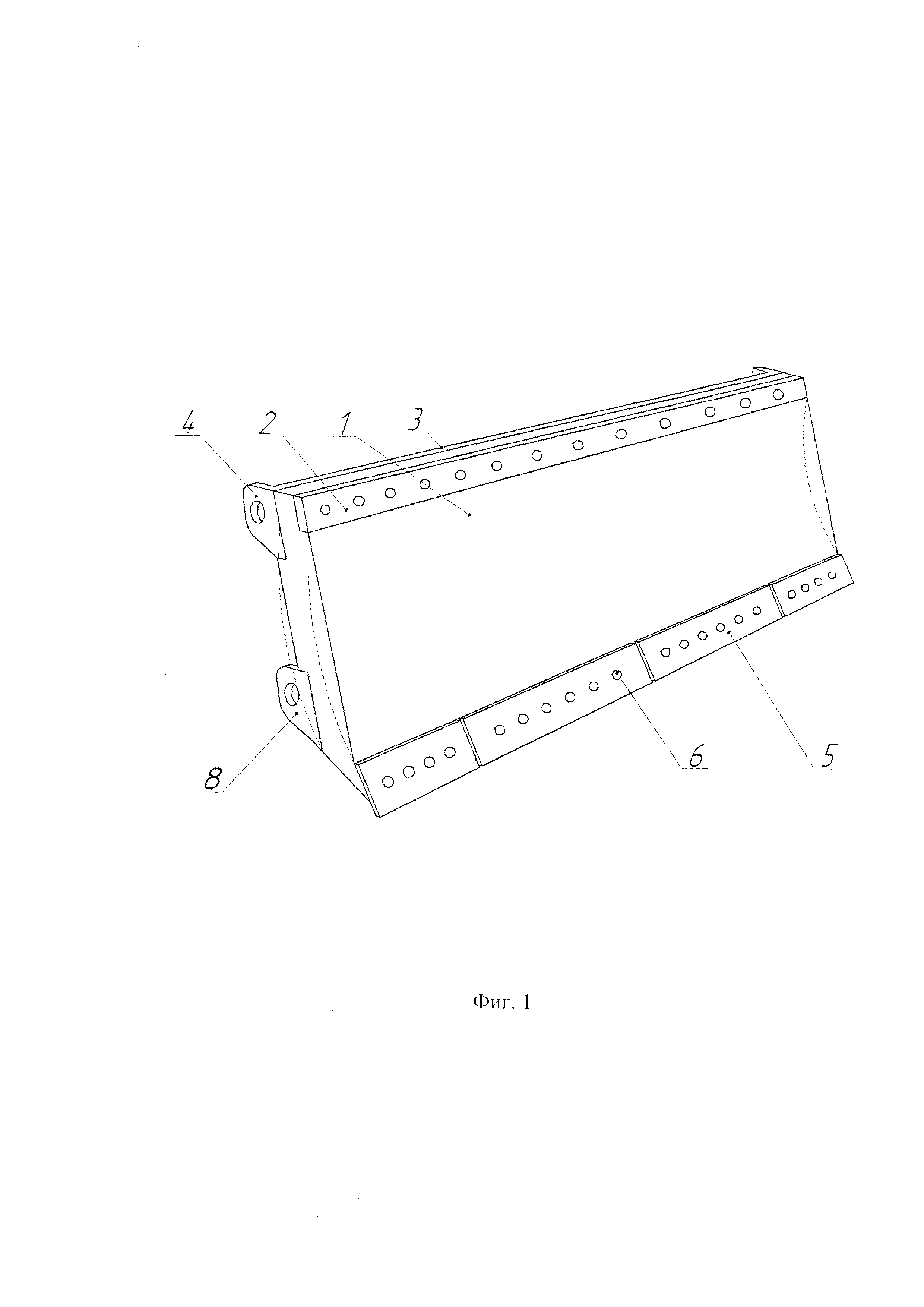 Изобретение относится к землеройно-транспортным машинам, а именно к рабочему оборудованию бульдозера и может быть использовано при разработке грунтов всех категорий. Известно рабочее оборудование бульдозера, содержащее режущий нож на коробке жесткости, которая жестко соединена с толкающими брусьями, упругую лобовую металлическую пластину, выполненную из отдельных вертикальных секций, шарнирно закрепленный отвал, снабженный гидроцилиндром управления, поворотный кронштейн, на котором закреплена выступающая средняя часть ножа, рычаги и стойку с гидроцилиндром.(см. Авт. св. №840247, кл. Е02Р 3/76, бюл. №23, 1981 г.). Недостатком известного устройства является невозможность обеспечения угла резания при разработке грунта на установленной глубине. Наиболее близким к заявленному изобретению является рабочее оборудование бульдозера, представляющее собой отвал в виде упругой пластины с режущим ножом, соединенный с базовой машиной посредством шарнирно установленных толкающих брусьев. (RU патент №2374396 опубл. 20.07.2009 г). Недостатком известного отвала является высокая металлоемкость и большая масса, ограниченная производительность, невозможность адаптации основных параметров отвала под разрабатываемую категорию грунта. Технической задачей заявленного изобретения является устранение недостатков известного изобретения. Техническим результатом, достигаемым при использовании предлагаемого изобретения является повышение производительности и технологичности выполнения землеройно-транспортных работ путем обеспечения снижения результирующей сил сопротивления копанию, снижение металлоемкости, повышение ремонтопригодности. Технический результат достигается тем, что рабочее оборудование бульдозера представляет собой гибкий отвал в виде упругой пластины с режущим ножом, соединенный с базовой машиной посредством шарнирно установленных толкающих брусьев, при этом гибкий отвал снабжен одной нижней и двумя верхними крепежными планками, одна из которых расположена с рабочей стороны, а другая со стороны, обращенной к бульдозеру, соединенными между собой и отвалом болтовым соединением, а нижняя крепежная планка расположена со стороны, обращенной к бульдозеру и соединена с гибким отвалом и ножом при помощи болтового соединения. Это позволяет обеспечить надежное крепление гибкого отвала бульдозера из полимерного сотового заполнителя с оболочкой из углепластика к базовой машине. Верхние планки выполнены с проушинами под раскосы, а нижняя - с проушинами под толкающие брусья, а упругая пластина гибкого отвала выполнена прямоугольной с наружной и внутренней поверхностями из углепластика и двумя слоями сотового заполнителя между ними, при этом ячейки сотового заполнителя соединены между собой посредством сварки, а наружные слои отвала соединены с сотовым заполнителем посредством полимеризации. Кроме того, ячейки сотового заполнителя обоих слоев могут быть дифференцированно заполнены кремнийорганическим материалом и также ячейки первого слоя сотового заполнителя, прикрепленного к наружной поверхности отвала из углепластика, полностью заполнены, а ячейки второго слоя, прикрепленного к внутренней поверхности отвала из углепластика - не заполняются. Применение в конструкции отвала углепластика и сотового заполнителя позво