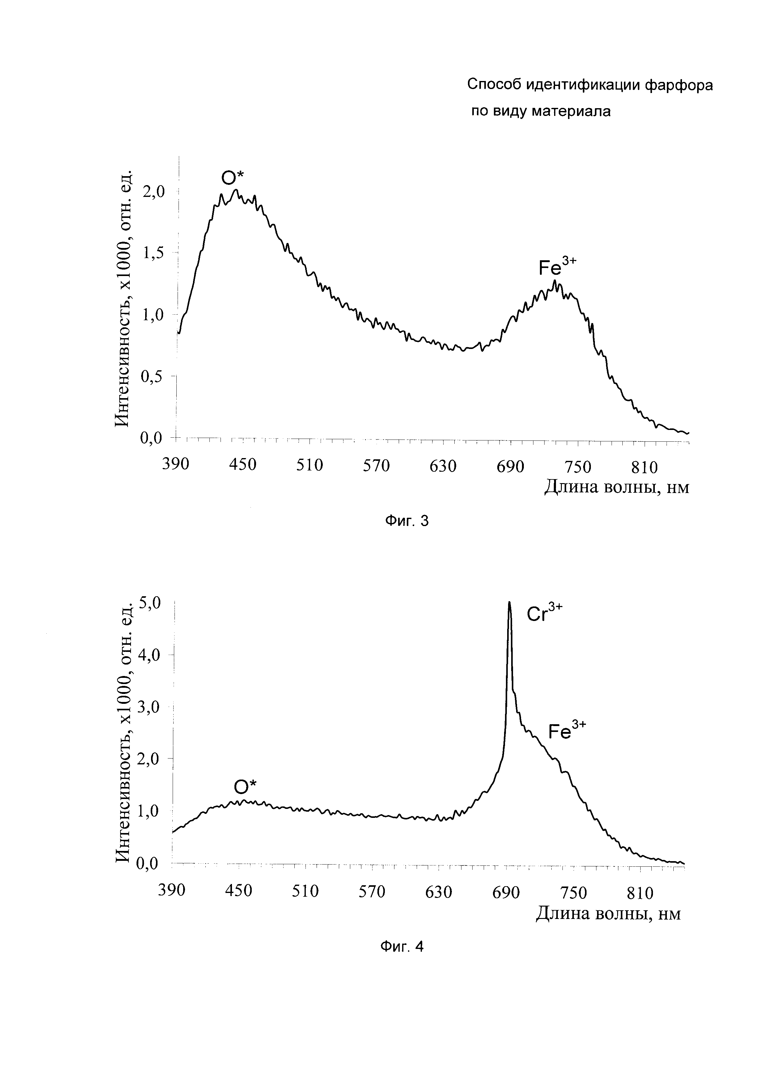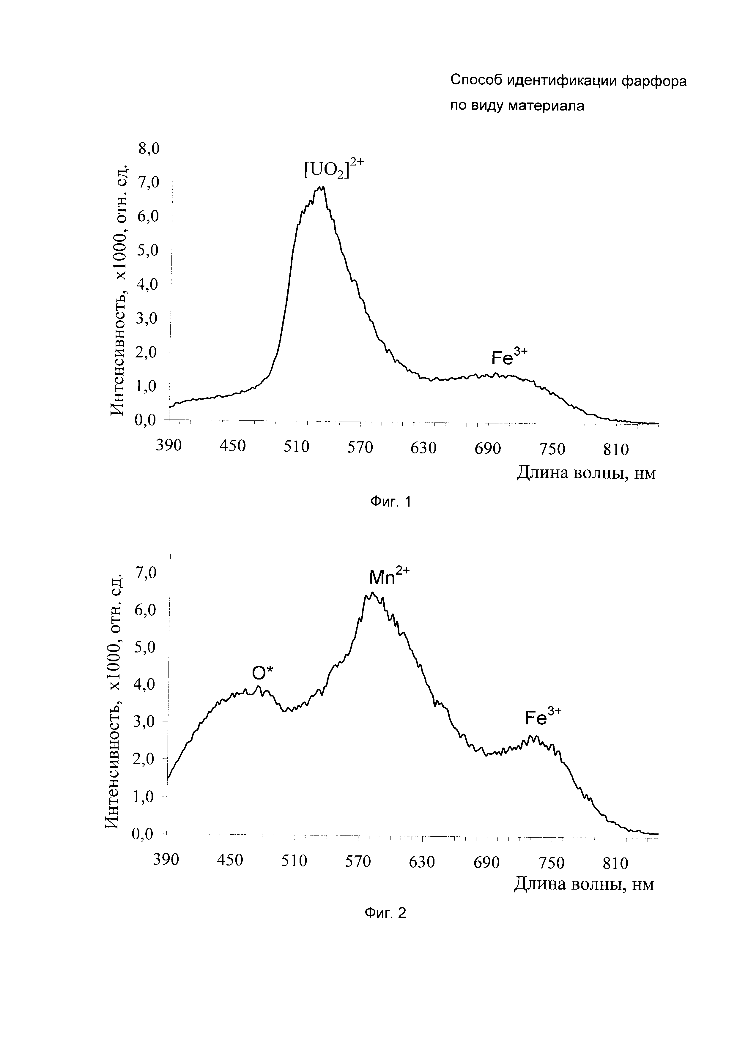 Способ идентификации фарфора по виду материала, предусматривающий освещение исследуемых образцов, регистрацию спектров и создание по спектральным характеристикам обучающей выборки с последующим формированием базы данных в виде 3-х групп образцов по виду материала: костяной фарфор, мягкий и твердый, дальнейшую идентификацию новых образцов фарфора по их принадлежности к какой-либо из указанных групп, определяемой наибольшими числовыми значениями классификационных функций, рассчитанных для каждой из указанных групп и отражающих взаимосвязь результатов спектральных исследований образцов фарфора обучающей выборки с видом фарфора по материалу, отличающийся тем, что в качестве источника освещения используют ультрафиолетовое излучение, регистрацию спектров возбуждаемой фотолюминесценции проводят в оптическом диапазоне электромагнитного излучения и определяют интенсивности полос оптически активных центров (ОАЦ) О*, [UO2]2+, Mn2+, Fe3+ в спектрах образцов, а расчет указанных классификационных функций (Ck) ведут исходя из следующего выражения: Ck=ako+ak1X1+ak2X2+…akpXp, где Ck - числовое значение классификационной функции для k-группы (k=1, 2, 3) образцов фарфора; ako - константа классификационной функции для k-группы, определяемая по числовым значениям интенсивностей полос ОАЦ в спектрах фотолюминесценции фарфора обучающей выборки; ak1…akp - коэффициенты показателей классификационной функции k-группы (k=1, 2, 3) для p-показателя (p=1, 2, 3, 4) определяемые по числовым значениям интенсивностей полос ОАЦ О*, [UO2]2+, Mn2+, Fe3+ в спектрах фотолюминесценции фарфора обучающей выборки; X1…Xp - интенсивности полос ОАЦ О*, [UO2]2+, Mn2+, Fe3+ в спектрах фотолюминесценции идентифицируемых образцов фарфора.