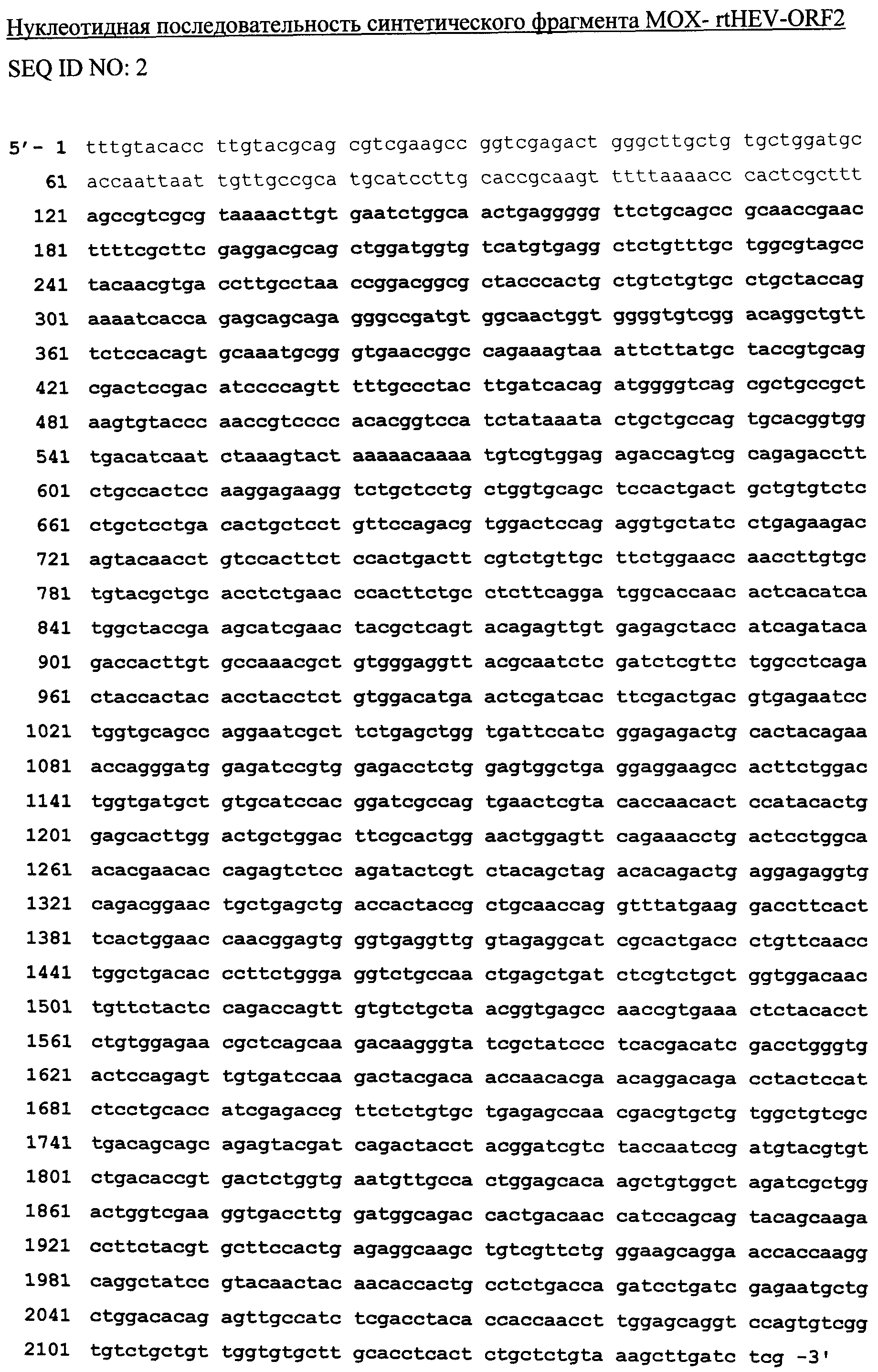 Изобретение относится к области биотехнологии, а именно генной инженерии, и может быть использовано для создания микробиологического дрожжевого продуцента капсидного белка вируса гепатита Е (HEV). Гепатит Е - вирусная инфекция, относящаяся к условной группе фекально-оральных гепатитов, характеризуется поражением печени, острым циклическим течением, часто с высокой температурой, артралгией, а также тяжелым проявлением у беременных женщин. Резервуар и источник инфекции - человек, больной или носитель. Вирусная этиология гепатита Е продемонстрирована на волонтерах путем заражения фекальными изолятами. Вирус обнаружен в фекалиях больных. Механизм передачи вируса гепатита Е, также называемого non-A, non-B (NANB), фекально-оральный, путь передачи водный, однако наблюдаются случаи передачи вируса от человека к человеку. Вирус гепатита Е эндемичен на территории с крайне плохим водоснабжением населения, неудовлетворительным качеством воды в эпидемическом отношении. Гепатит Е распространен в Азии, Африке, Европе, Мексике, Индии как в эпидемической, так и спорадической формах. Принято считать, что гепатитом Е болеют ежегодно около 1 млн. человек, причем в странах Азии на его долю приходится более половины случаев острого гепатита. Эпидемиологическая особенность этого заболевания связана с высокой смертностью у беременных женщин, которая, как показывают многочисленные исследования, может достигать 10-20%. В последние годы выявлено устойчивое увеличение числа лиц с наличием антител к HEV в регионах с умеренным климатом, в экономически развитых странах. В этих случаях часто инфицирование было обусловлено распространенным в Европе и США вирусом с генотипом 3, который также был обнаружен у диких и домашних свиней, что позволяет рассматривать зоонозный резервуар в качестве источника заражения большинства людей. Немногочисленные исследования, проведенные в РФ, также продемонстрировали наличие антител к вирусу гепатита Е у лиц, не выезжающих в эндемичные районы, что свидетельствует о контакте населения с вирусом. Вирус гепатита Е относится к семейству Hepeviridae рода Hepevirus. Частицы вируса представляют собой сферические образования диаметром 27-34 им, построенные из идентичных структурных элементов, и лишенные наружной оболочки. Вирусные частицы реагируют с антителами сыворотки инфицированных индивидуумов из географически различных регионов, что говорит о повсеместной распространенности HEV. Серологически и молекулярно-генетически HEV отличается от других типов вирусов гепатита. Последовательность генома HEV впервые была определена в 1991 г. (Tam A.W. et.al., 1991 Virology, 185, 120-131). Геном вируса гепатита Е представлен одноцепочечной РНК позитивной полярности. Анализ последовательности генома показал, что его размер 7.2 kb, и он содержит 3 открытые рамки считывания (ORF), каждая из которых кодирует синтез определенного белка или группы белков. ORF1 кодирует неструктурные белки вируса, ответственные за репликацию вируса, ORF2 кодирует структурный белок капсида вируса (ORF2-белок), ORF3 кодирует вспомогательный белок, функция которого еще не определена. С помощью картирования установлено, что линейные антигенные эпитопы локализованы в полипептидах, кодируемых ORF2 и ORF3 (Khydyakov Y.E. et al., Virology 1993, 194, 89-96). Рекомбинантный белок ORF2 способен к самосборке в вирусоподобные частицы (VLP), 