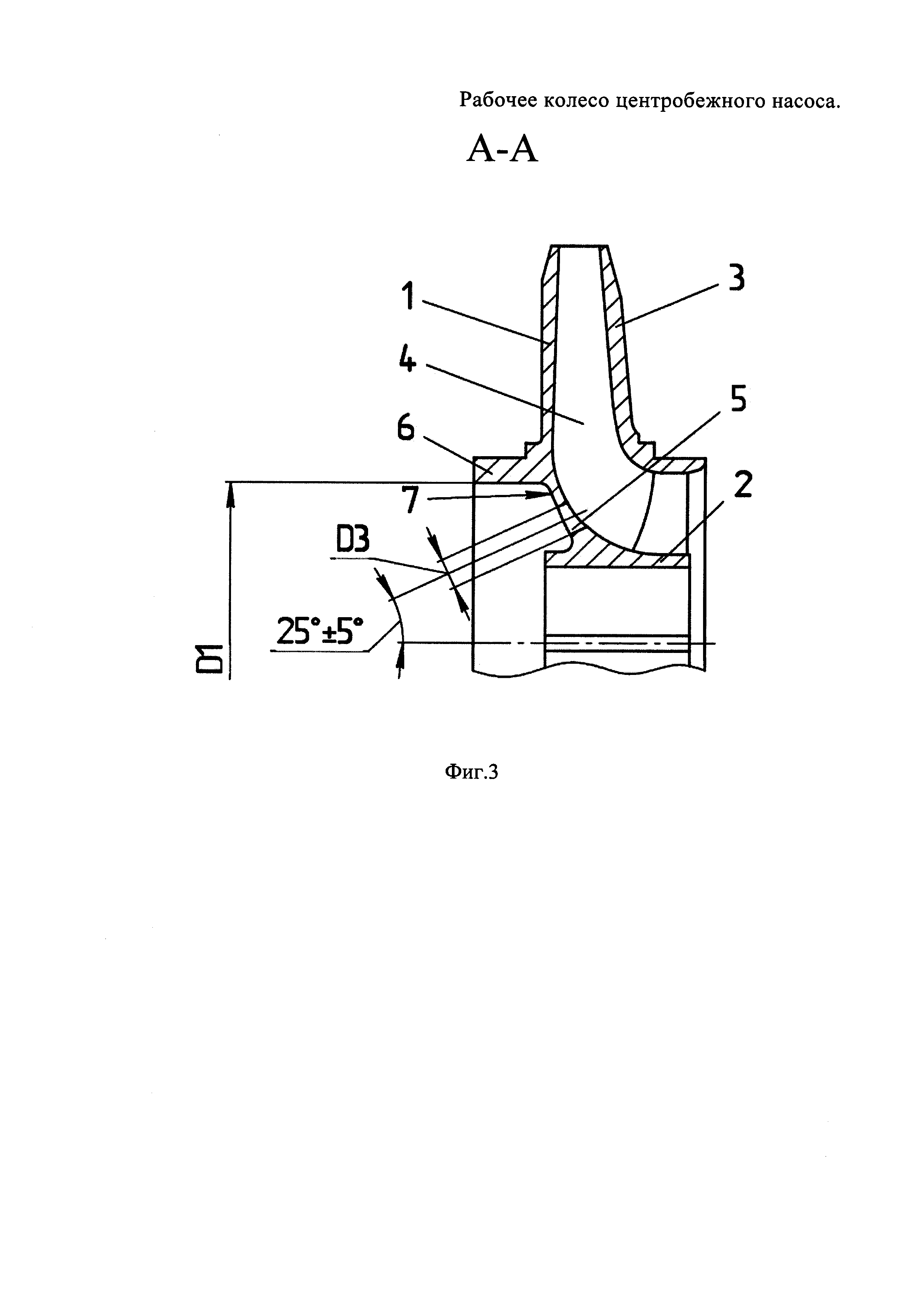 Изобретение относится к насосной технике, а именно к рабочим колесам центробежного насоса для перекачки различных жидких сред. Известно рабочее колесо центробежного насоса, содержащее основной диск со ступицей и выполненные на его лицевой поверхности лопасти, выполненные криволинейными загнутыми назад, причем в основном диске в пространстве между входными участками лопастей выполнены сквозные отверстия (см. патент US №5224821, кл. F01D 5/14, опубл. 06.07.1993). Однако выполнение наружной задней поверхности основного диска гладкой не позволяет в полной мере использовать возможность уменьшить осевую силу, возникающую при работе рабочего колеса в составе центробежного насоса. Наиболее близким к изобретению по технической сущности и достигаемому результату является рабочее колесо центробежного насоса, содержащее основной диск со ступицей, покрывной диск и размещенные между ними лопасти, выполненные криволинейными загнутыми назад, причем в основном диске в пространстве между входными участками лопастей выполнены сквозные отверстия, а с наружной стороны на основном диске выполнен кольцевой коаксиально охватывающий выступающий из основного диска участок ступицы бурт (см. патент US №5628616, кл. F04D 29/22, опубл. 13.05.1997). Однако выполнение рабочего колеса со сквозными отверстиями, оси которых расположены параллельно оси рабочего колеса, не позволяет создать равномерный градиент давления с наружной стороны основного диска, что снижает возможность уменьшения осевой силы, которая возникает на рабочем колесе при работе центробежного насоса. Технической проблемой является устранение выявленных в аналогах недостатков. Технический результат заключается в том, что достигается возможность уменьшить на рабочем колесе величину осевой силы, возникающей при работе центробежного насоса. Указанный технический результат достигается за счет того, что рабочее колесо центробежного насоса содержит основной диск со ступицей, покрывной диск и размещенные между ними лопасти, выполненные криволинейными загнутыми назад, причем в основном диске в пространстве между входными участками лопастей выполнены сквозные отверстия, а с наружной стороны на основном диске выполнен кольцевой коаксиально охватывающий выступающий из основного диска участок ступицы бурт, причем рабочее колесо выполнено литым с отклонением по шагу лопастей на их входном участке не более 2 мм и на выходном участке - не более 3 мм, наружная поверхность основного диска, расположенная между выступающим из основного диска участком ступицы и кольцевым буртом, выполнена конической с образованием боковой поверхности усеченного конуса, плавно сопряженной со стороны меньшего диаметра со ступицей и со стороны большего диаметра - с внутренней цилиндрической поверхностью кольцевого бурта, причем ось сквозного отверстия наклонена к оси рабочего колеса под углом 25°±5°, внутренний диаметр кольцевого бурта составляет от 0,4 до 0,45 от диаметра рабочего колеса, сквозные отверстия расположены по окружности и их диаметр составляет от 0,038 до 0,042 от диаметра рабочего колеса, при этом между основным и покрывным дисками расположены 7 лопастей, периферийные наружные участки основного и покрывного дисков образованы коническими, сужающимися к периферии рабочего колеса поверхностями, образующие которых 