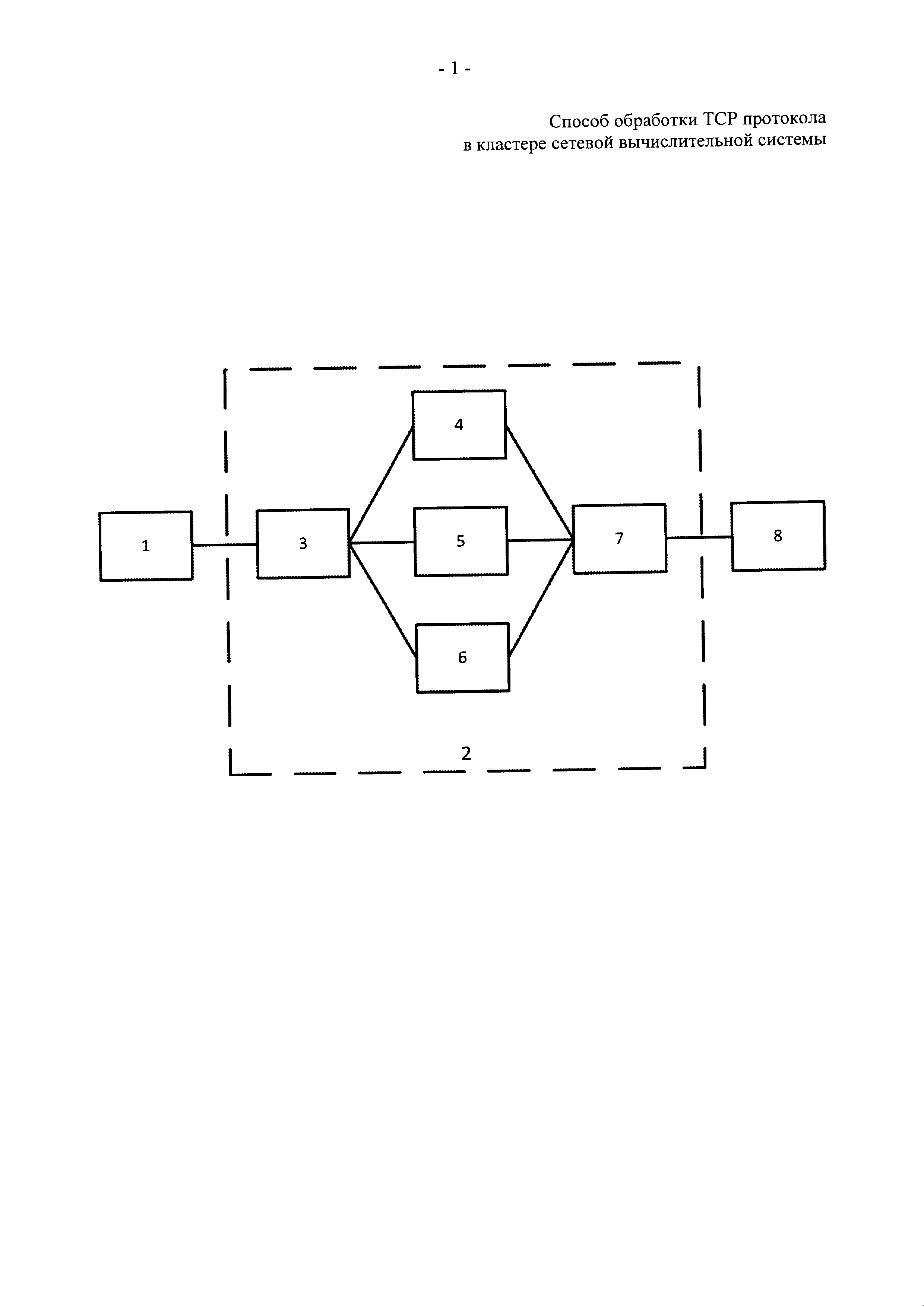 Способ обработки TCP протокола в кластере сетевой вычислительной системы, причем система включает кластер, установленный на границе защищаемого участка сети и содержащий по меньшей мере два шлюза безопасности, каждый из которых имеет уникальный номер в пределах кластера и выполнен с возможностью принимать сетевые пакеты, обрабатывать сетевые пакеты в соответствии с настройками, создавать и использовать контекст соединения, который хранит необходимую информацию для обработки сетевых пакетов одного соединения, вычислять ключевую криптографическую хэш-функцию (ККХФ), формировать и хранить ключевую информацию, принимать и обрабатывать пакеты от других шлюзов, создавать правила пересылки между шлюзами, пересылать пакеты в соответствии с правила пересылки; два сетевых коммутатора, выполненных с возможностью осуществлять балансировку трафика между шлюзами кластера, назначать шлюзы для приема пакетов, направлять пакеты одного и того же соединения на один и тот же шлюз безопасности, причем 1-й коммутатор соединяет защищаемый участок сети и шлюзы безопасности, 2-й коммутатор соединяет незащищаемый участок сети и шлюзы безопасности; по меньшей мере одно сетевое устройство (клиент), расположенный в защищаемом участке сети и выполненный с возможностью инициировать и устанавливать TCP соединения; по меньшей мере одно сетевое устройство (сервер), расположенный вне защищаемого участка сети и выполненный с возможностью устанавливать TCP соединения; способ, заключающийся в том, что формируют в оперативной памяти каждого шлюза таблицу для хранения трех ключей и относящихся к каждому ключу атрибутов: порядковый номер, признак четности порядкового номера, время создания ключа; формируют в шлюзе безопасности имеющий наименьший номер случайный ключ; вычисляют для сформированного ключа порядковый номер, начиная с нуля, признак четности порядкового номера и время создания ключа; рассылают ключ и связанные с ним атрибуты во все остальные шлюзы безопасности; сохраняют во всех шлюзах безопасности ключ и связанные с ним атрибуты в таблицу; устанавливают период смены ключа в кластере; посылают сетевой пакет, содержащий TCP-сообщение SYN для установки соединения (запрос), из клиента на сервер; принимают запрос от клиента в шлюзе безопасности кластера (1-м шлюзе), назначенном 1-м коммутатором; обрабатывает запрос в 1-м шлюзе, выполняя следующие действия: создают контекст соединения, который содержит всю необходимую информацию для обработки последующих пакетов данного соединения; обрабатывают запрос в соответствии с настройками шлюза безопасности; формируют идентификатор сетевого потока из значений полей: IP-адрес источника, IP-адрес назначения, протокол, порт источника и порт назначения, которые будут в ответном сетевом пакете на запрос; если в таблице три ключа, то выбирают ключ, имеющий промежуточное время создания, если в таблице два ключа, то выбирают ключ, имеющий наиболее раннее время создания, если в таблице один ключ, то выбирают имеющийся ключ; вычисляют ключевую криптографическую хэш-функцию (ККХФ) от идентификатора сетевого потока с использованием выбранного ключа; формируют сообщение ClusterSecCookie, содержащее следующие поля: идентификатор шлюза содержит идентификатор 1-го шлюза, признак четности содержит признак четности выбранно