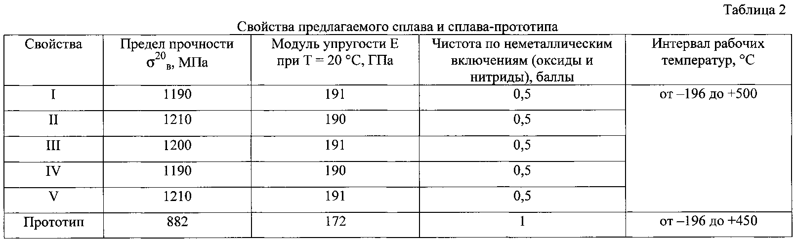Изобретение относится к области машиностроения и может использоваться при изготовлении деталей упругочувствительных элементов точного приборостроения, силовых пружин и конструкционных деталей специального назначения. Эти материалы нашли широкое применение в приборостроении для гражданской авиационной техники. Объектом изобретения являются элинварные сплавы. Элинварными называют сплавы, обладающие в определенном интервале температур особыми свойствами: близкими к нулевому значению температурным коэффициентом модуля упругости (ТКМУ) и температурным коэффициентом частоты. Использование элинварных сплавов для изготовления упругочувствительных элементов позволяет снизить температурную чувствительность аппаратуры, что повышает точность измерений, и при этом позволяет исключить необходимость термостатирования аппаратуры, что упрощает конструкцию и эксплуатацию изделий и приборов. Развитие авиационной техники в настоящее время требует создания новых материалов с повышенными значениями модуля упругости и расширенным температурным интервалом стабильности для упругочувствительных элементов - датчиков высокого давления, индикаторов и сигнализаторов АСУ и ЭСУ систем жизнеобеспечения, взрыво- и молниезащиты. В 1980-1990 г.г. для авиационной промышленности были разработаны серии элинварных сплавов (ЭП920, ВУС22 и др.), обладающих постоянным модулем упругости на уровне Ε=160-170 ГПа в диапазоне температур от -196 до +400°С, предназначенных для изготовления упруго-чувствительных элементов точного приборостроения, силовых пружин и конструкционных деталей. Эти материалы нашли широкое применение в приборостроении для гражданской и военной авиационной техники. Однако для создаваемых новых приборов, отвечающих требованиям перспективных образцов гражданской авиационной техники, требуется повышенный модуль упругости не менее 190 ГПа и расширение диапазона рабочих температур элинварных сплавов от -196 до +500°С. Известен аналог дисперсионно-твердеющий сплав (а.с. 554703, МПК С22С 38/14, опубл. 26.06.1978 г.), при следующем соотношении компонентов, масс. %: Сплав является дисперсионно-твердеющим с малым температурным коэффициентом модуля нормальной упругости, используемым для изготовления конструкционных деталей специального назначения. Сплав обладает достаточно высокими для элинварных сплавов значениями предела прочности 1470 МПа, однако недостатком данного сплава является низкий уровень модуля упругости - 170 ГПа и недостаточно высокий интервал рабочих температур от -60 до +400°С. Зарубежным аналогом для упруго-чувствительных элементов (УЧЭ) приборов широко применяется элинварный сплав Incoloy 903, по основным характеристикам уступающий отечественному сплаву ЭП920 (Патент США 3157495, МПК С22С 38/00, опубл. 17.11.1964 г.) со следующим химическим составом, масс. %: Недостатком указанного сплава является низкий уровень модуля упругости - 146 ГПа и недостаточно высокий температурный интервал рабочих температур от -60°С до +310°С. Наиболее близким аналогом, взятым за прототип, является дисперсионно-твердеющий сплав с малым температурным коэффициентом модуля нормальной упругости (патент РФ 1438266, МПК С22С 38/14, опубл. 30.05.1994 г.) при следующем соотношении компонентов, масс. %: Сплав обладает прочностью 882 МПа, модулем упругости 172 ГПа при диапазоне рабочих температур от -196 