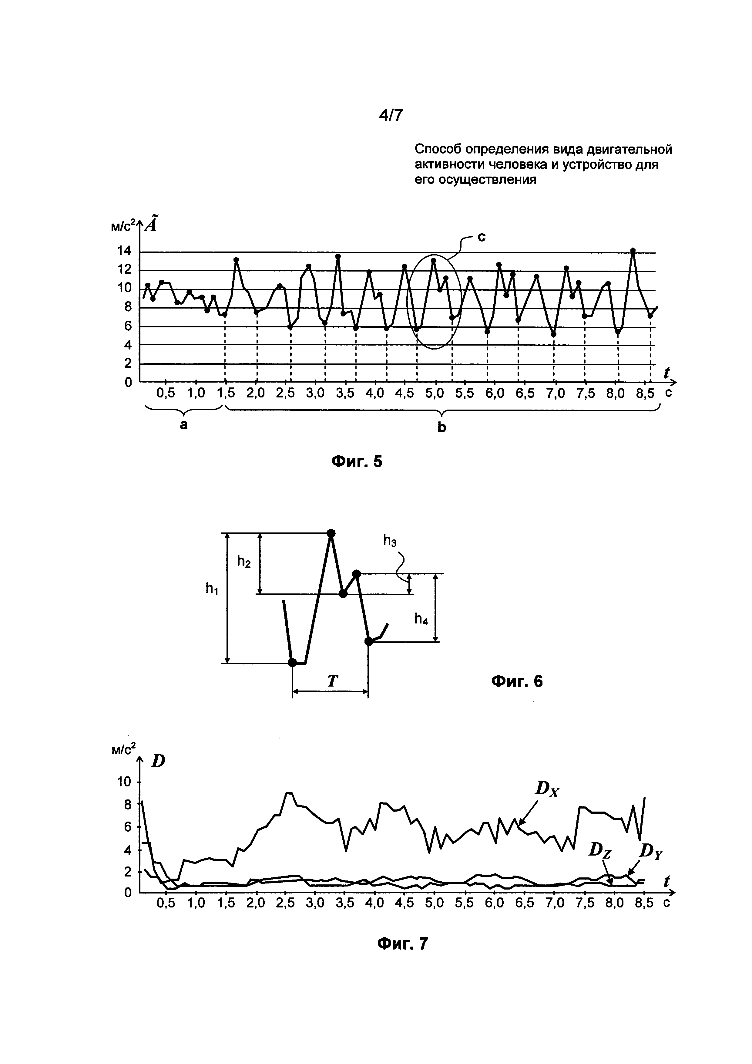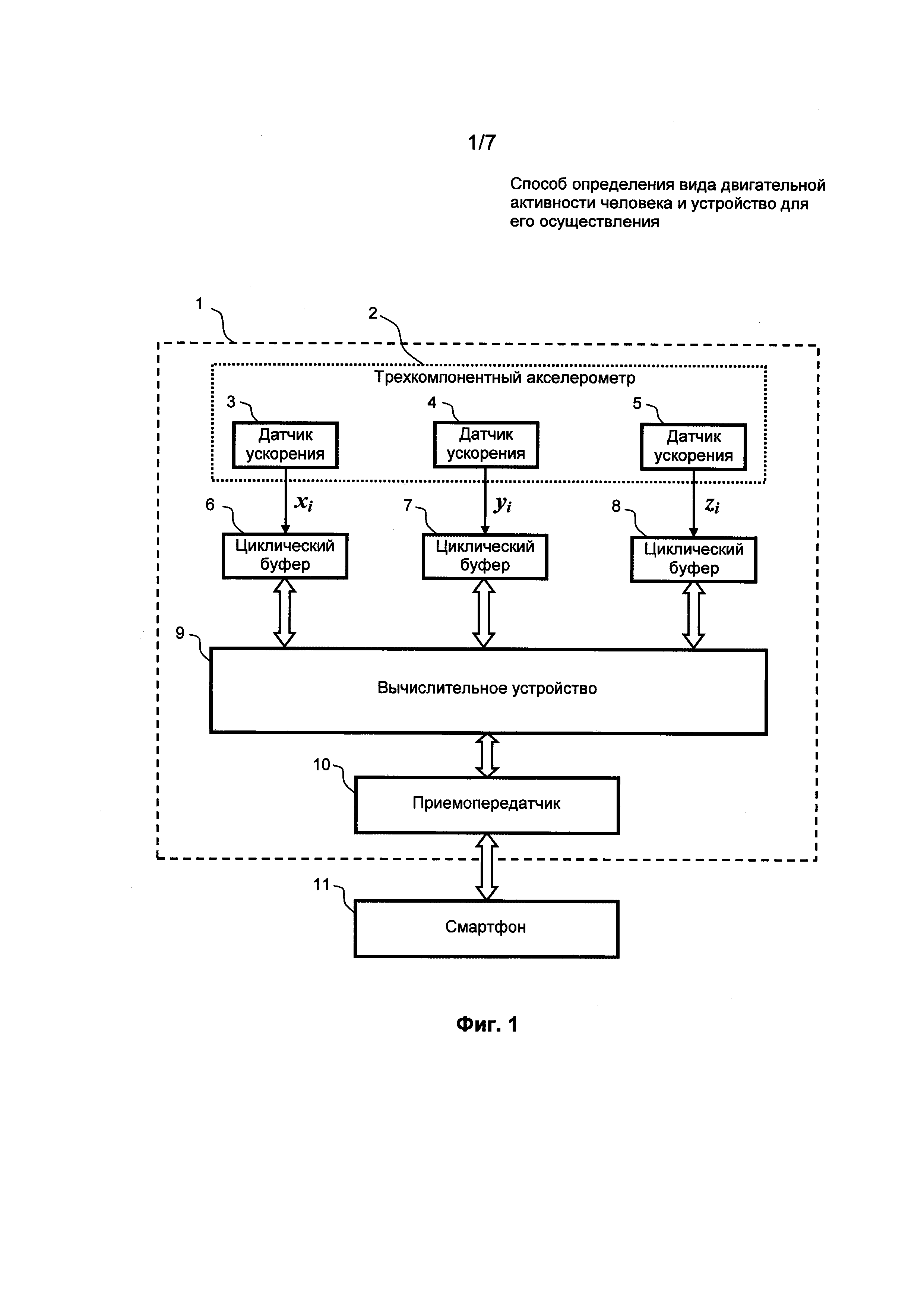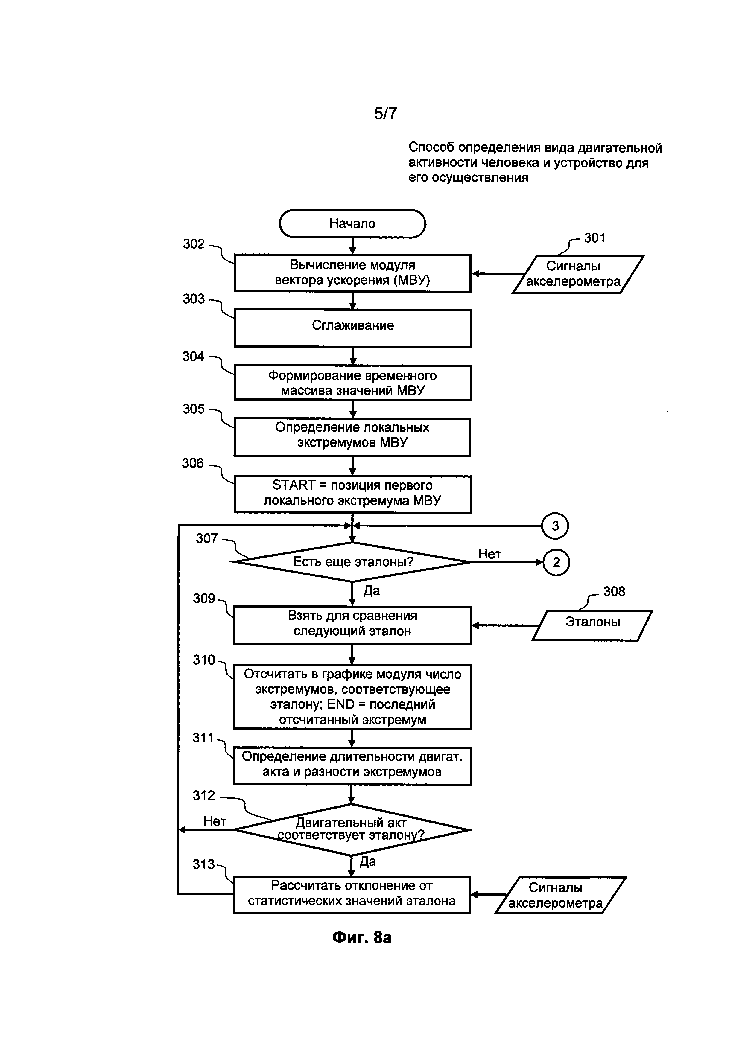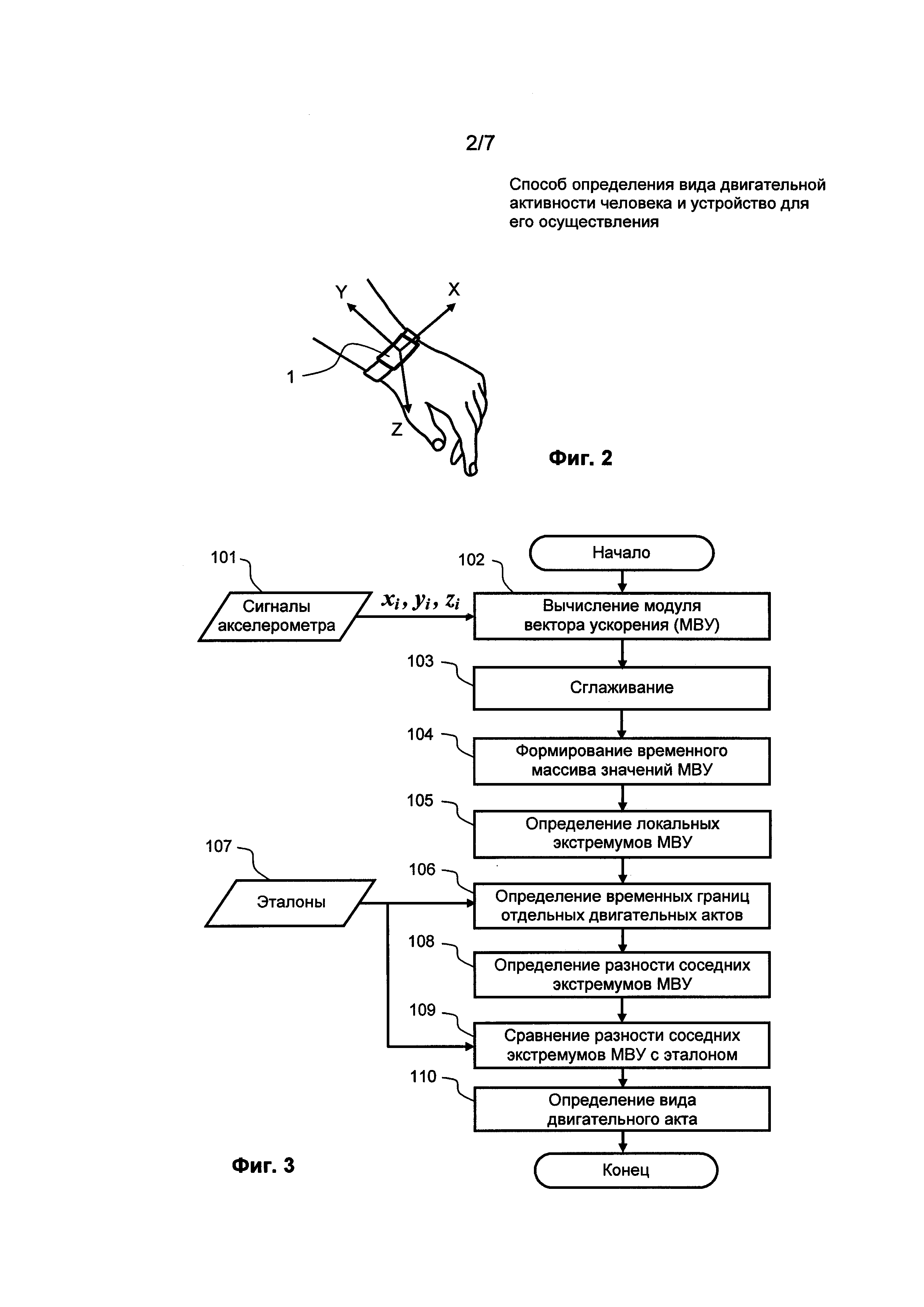 1. Способ определения вида двигательной активности человека, характеризующийся тем, что 2. Способ по п. 1, характеризующийся тем, что дополнительно решение о совершении двигательного акта определенного вида двигательной активности принимают с учетом дисперсии разности соседних экстремумов модуля вектора ускорения относительно соответствующих эталонных значений. 3. Способ по п. 1, характеризующийся тем, что трехкомпонентный акселерометр закреплен на руке человека. 4. Способ по п. 3, характеризующийся тем, что трехкомпонентный акселерометр закреплен на запястье. 5. Способ по п. 1, характеризующийся тем, что в качестве трехкомпонентного акселерометра используют три датчика ускорения, конструктивно соединенные между собой с образованием трех ортогональных осей измерения ускорения. 6. Способ по п. 1, характеризующийся тем, что дополнительно, до формирования временного массива значений модуля вектора ускорения, регистрируемые сигналы трехкомпонентного акселерометра или вычисляемый модуль вектора ускорения подвергают процедуре сглаживания. 7. Способ по п. 1, характеризующийся тем, что для формирования, по меньшей мере, одного используемого при осуществлении способа эталона 8. Способ по п. 7, характеризующийся тем, что в случае обнаружения двигательных актов, по меньшей мере, с иным повторяющимся числом экстремумов, формируют, по меньшей мере, один дополнительный эталон, при этом в качестве эталонных значений дополнительного эталона принимают повторяющееся число экстремумов, минимальное и максимальное значения длительности двигательных актов с этим числом экстремумов и минимальные и максимальные значения разности соседних экстремумов двигательных актов с этим числом экстремумов, при этом сформированные эталоны образуют подмножество эталонов одного вида двигательной активности. 9. Способ по п. 7, характеризующийся тем, что дополнительно, до формирования временного массива значений модуля вектора ускорения, регистрируемые сигналы трехкомпонентного акселерометра или вычисляемый модуль вектора ускорения подвергают процедуре сглаживания. 10. Способ по п. 7, характеризующийся тем, что при формировании эталонов трехкомпонентный акселерометр закрепляют на теле того же человека и так же, как он будет в последующем закреплен на теле человека при осуществлении способа. 11. Способ по п. 7, характеризующийся тем, что число двигательных актов в серии двигательных актов определенного вида, совершаемых человеком при формировании, по меньшей мере, одного используемого при осуществлении способа эталона, составляет от 50 до 300. 12. Устройство для определения вида двигательной активности, включающее трехкомпонентный акселерометр, выполненный с возможностью закрепления на теле человека и способный формировать сигналы, соответствующие проекциям вектора ускорения, которое испытывает акселерометр, по трем ортогональным осям в пространстве, и вычислительное устройство, подсоединенное к выходам акселерометра, при этом вычислительное устройство выполнено с возможностью 13. Устройство по п. 12, характеризующееся тем, что вычислительное устройство выполнено с возможностью принятия решения о совершении двигательного акта определенного вида двигательной активности дополнительно с учетом дисперсии разности соседних экстремумов модуля век
