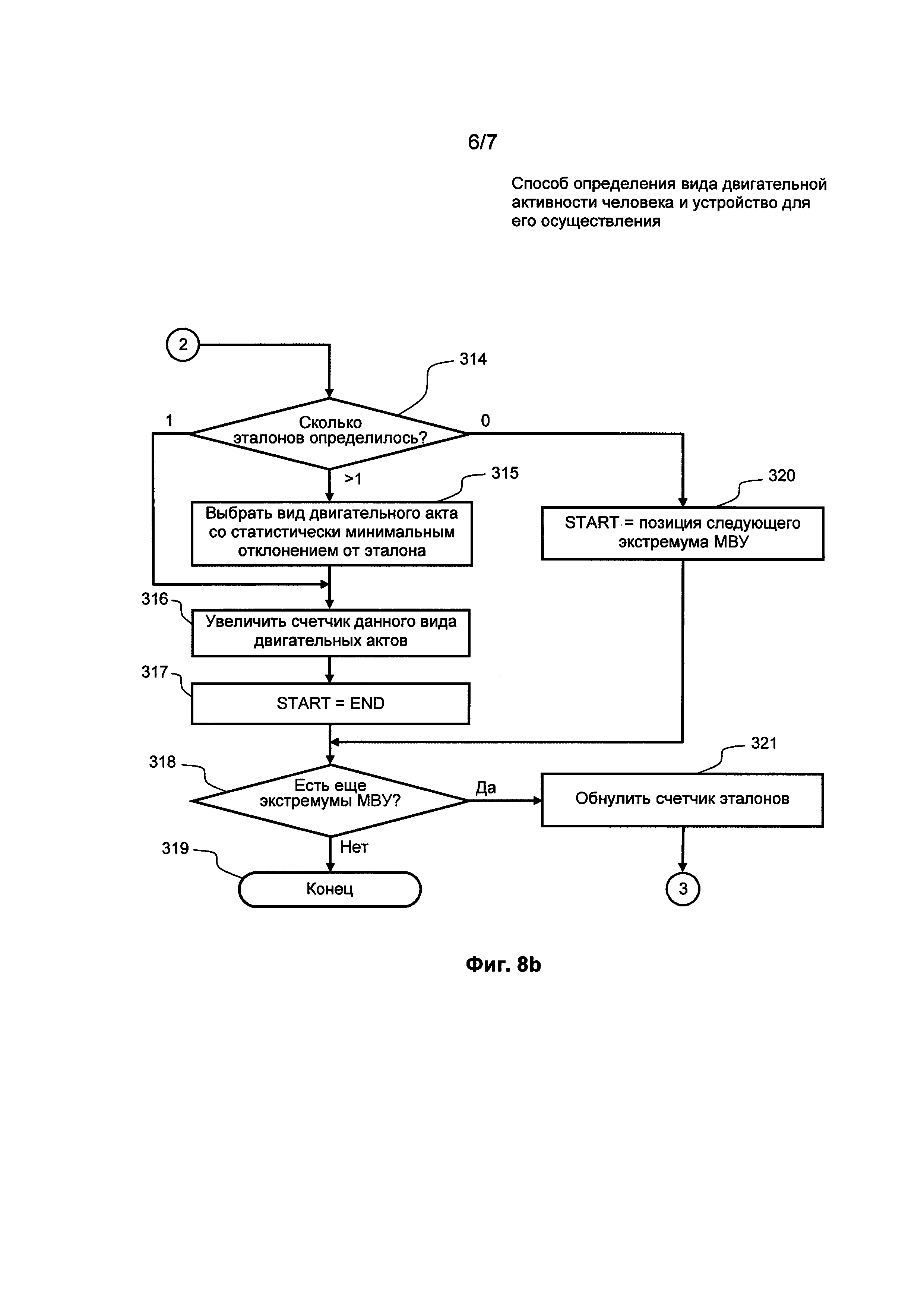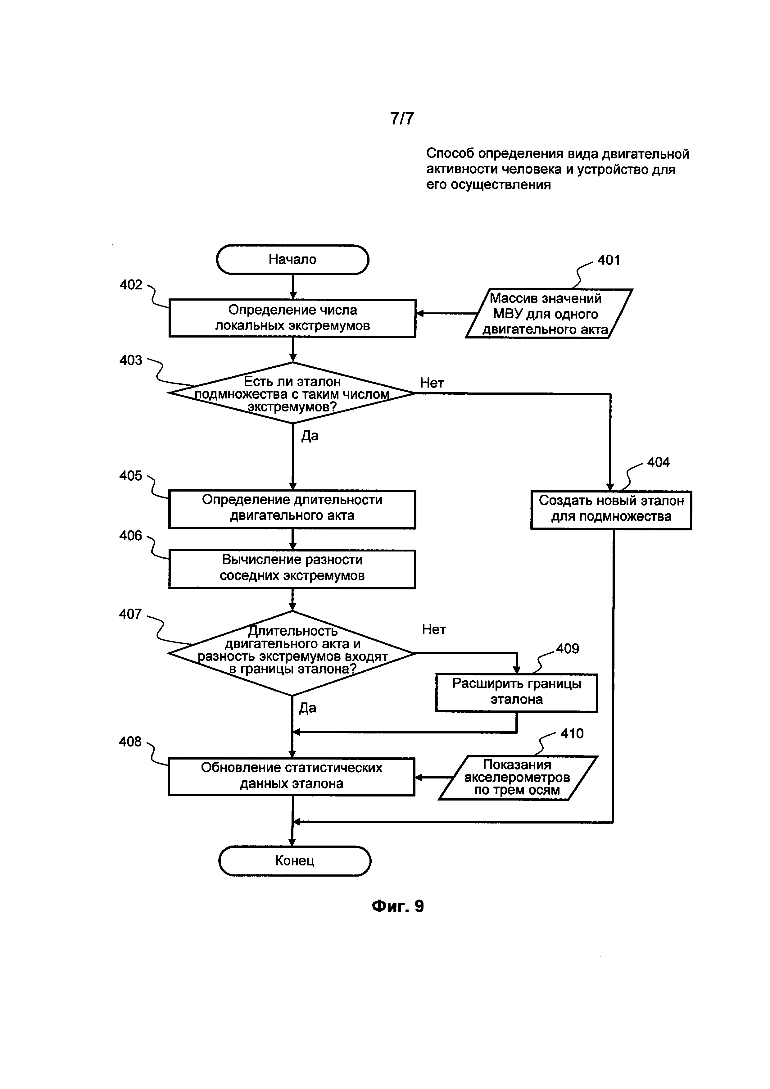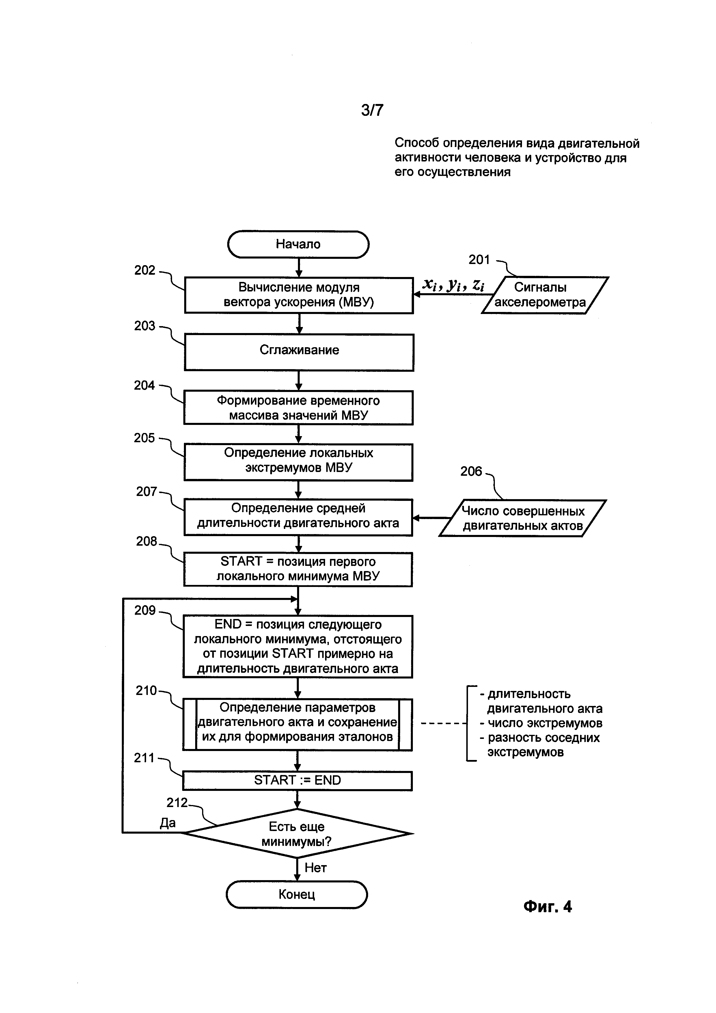 определения длительности отдельных двигательных актов, и в пределах каждого отдельного двигательного акта определения значения разности соседних экстремумов модуля вектора ускорения, при этом границы двигательных актов определяются последовательно от экстремума к экстремуму модуля вектора ускорения по числу экстремумов, равному эталонному значению числа экстремумов, по меньшей мере, одного эталона, сформированного предварительно для определенного вида двигательной активности и характеризуемого эталонным значением числа экстремумов модуля вектора ускорения, эталонным значением длительности двигательного акта и эталонными значениями разности соседних экстремумов модуля вектора ускорения,