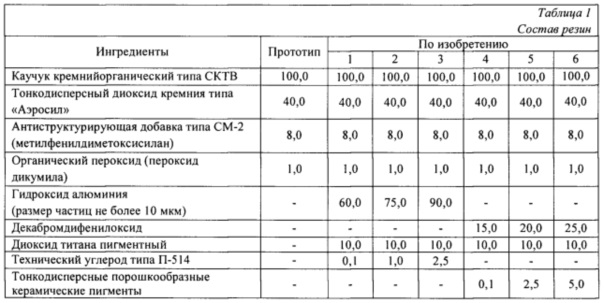 Резиновая смесь, содержащая кремнийорганический каучук, пероксид дикумила, антиструктурирующую добавку, тонкодисперсный диоксид кремния, отличающаяся тем, что дополнительно содержит гидроксид алюминия с размером частиц не более 10 мкм или декабромдифенилоксид, диоксид титана пигментный, а также технический углерод либо тонкодисперсные порошкообразные керамические пигменты при следующем соотношении компонентов, мас. ч.:кремнийорганический каучук 100 пероксид дикумила 1,0 антиструктурирующая добавка 8,0 тонкодисперсный диоксид кремния 40,0 диоксид титана пигментный 10,0 гидроксид алюминия 60,0-90,0 или декабромдифенилоксид 15,0-25,0 технический углерод 0,1-2,5 или тонкодисперсные порошкообразные керамические пигменты 0,1-5,0