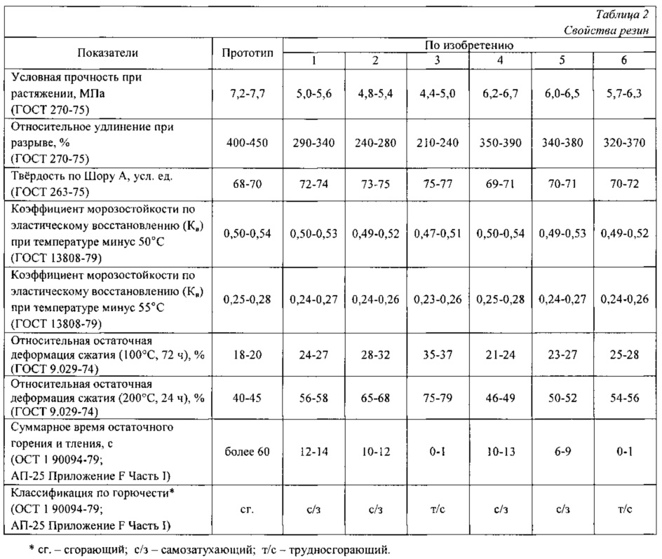 Изобретение относится к резиновой промышленности, в частности к разработке эластомерных материалов уплотнительного назначения с высоким уровнем морозостойкости, теплостойкости и пониженной горючестью. Разработанная резиновая смесь может быть использована для изготовления резиновых деталей, применяемых в различных видах уплотнительных узлов наружного и внутреннего контуров машин и механизмов, работающих в среде воздуха во всеклиматических условиях, в частности в условиях арктического климата. Наиболее перспективными эластомерными материалами для работы в арктических условиях являются резины на основе силоксановых каучуков, которые обладают высокими тепло-, озоно- и морозостойкостью. Однако существенным недостатком данных резин является их горючесть (Наумов И.С., Петрова А.П., Чайкун A.M. Резины уплотнительного назначения и снижение их горючести // Все материалы. Энциклопедический справочник. 2013. №5. С. 28-35; Наумов И.С., Петрова А.П., Барботько С.Л. Повышение пожарной безопасности резины на основе силоксанового каучука // Все материалы. Энциклопедический справочник. 2015. №3. С. 30-35). Известна резиновая смесь на основе силиконового каучука (заявка RU 94036289, C08L 83/06, опубл. 20.07.1996 г.), которая, согласно изобретению, содержит в качестве наполнителя смесь оксидов цинка и магния и окись кремния, в качестве вулканизующего агента дикумилпероксид, в качестве термостабилизатора смесь оксидов меди и железа и дополнительно диспергатор, например E-30, и стабилизатор, например метилфенилдиметоксисилан, при следующем соотношении компонентов, мас.ч.: Известна резиновая смесь (патент RU 2485147 C2, C08L 9/02, опубл. 20.06.2013 г.), содержащая бутадиен-нитрильный каучук, серу, технический углерод, стеаринсодержащий компонент, оксид цинка и минеральный наполнитель, согласно изобретению дополнительно содержащая технологические добавки: тиурам Д, нафтам-2, фактис, оксанол ЦС-100, воск ЗВП, цинколет BB 222 и пластификатор трихлорэтилфосфат, а в качестве бутадиен-нитрильного каучука содержит бутадиен-нитрильный каучук БНКС-18 АМН и бутадиен-нитрильный каучук СКН-18 ПВХ 30, в качестве технического углерода - технический углерод П-803, технический углерод Т-900, технический углерод Т-324; в качестве стеаринсодержащего компонента - стеарин и в качестве минерального наполнителя - карбосил, при следующих соотношениях компонентов, мас.ч.: В вышеприведенных источниках подтверждаются высокие эксплуатационные свойства резин, работоспособных при высоких и устойчиво низких температурах. Описанные резины не обладают пониженной горючестью, т.е. являются сгорающими материалами, поскольку из литературных источников известно, что изначально, без добавления антипиренов, негорючими являются только резины на основе галогенсодержащих каучуков (Горение, деструкция и стабилизация полимеров / Под ред. Г.Е. Заикова. СПб.: Научные основы и технологии. 2008. 422 с.). Известна морозостойкая резина на основе пропиленоксидного каучука и природных бентонитов (патент RU 2493183 C1, C08L 71/02, опубл. 20.09.2013 г.), включающая серу, стеариновую кислоту, оксид цинка, тиурамдисульфид, технический углерод П-803, отличающаяся тем, что она дополнительно содержит природные бентониты, пластификатор дибутоксиэтиладипинат, дибензотиазолдисульфид (альтакс), фенил-β-нафтиламин (неозон Д) при следующем соотношении компонентов, мас.ч.: 