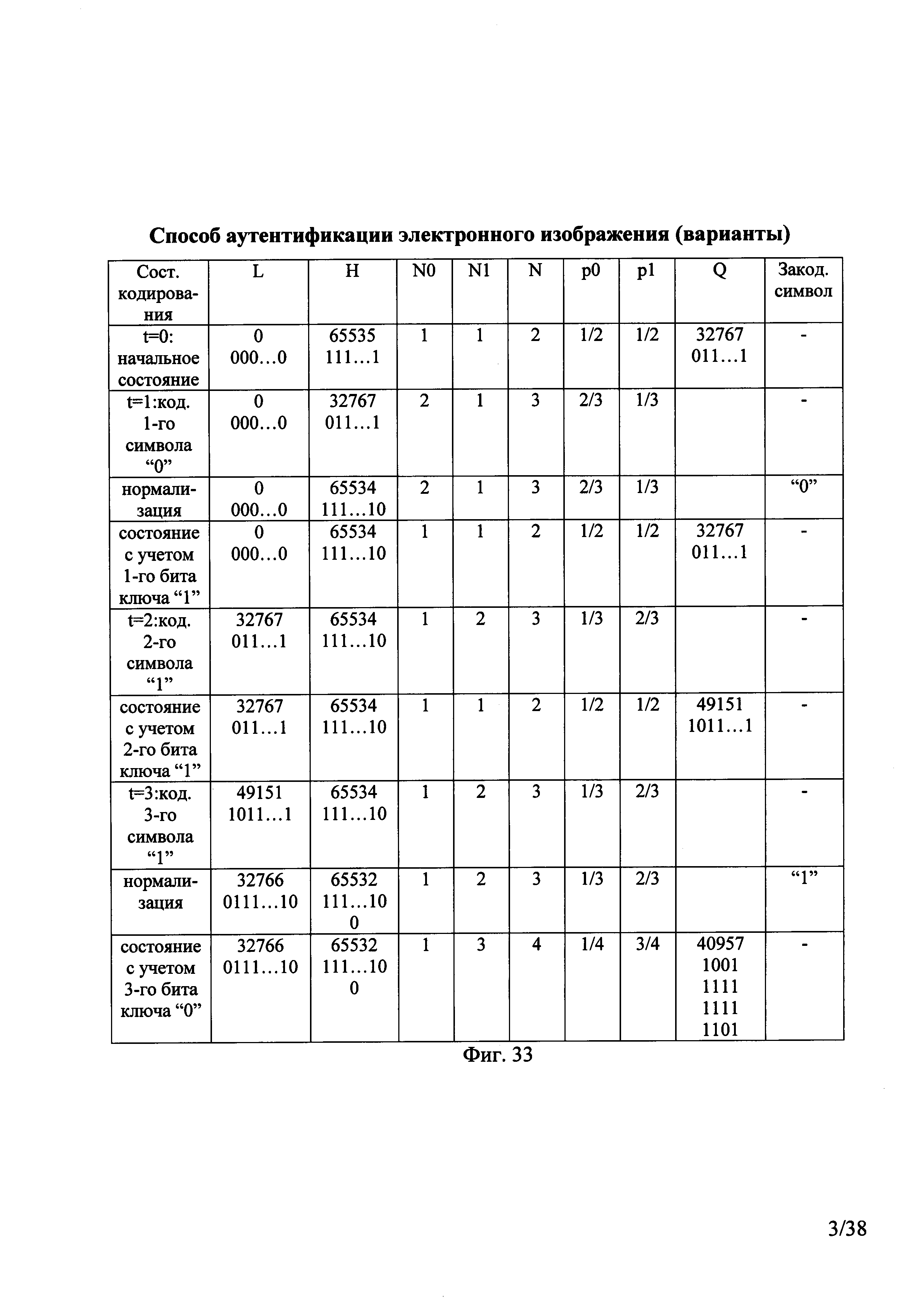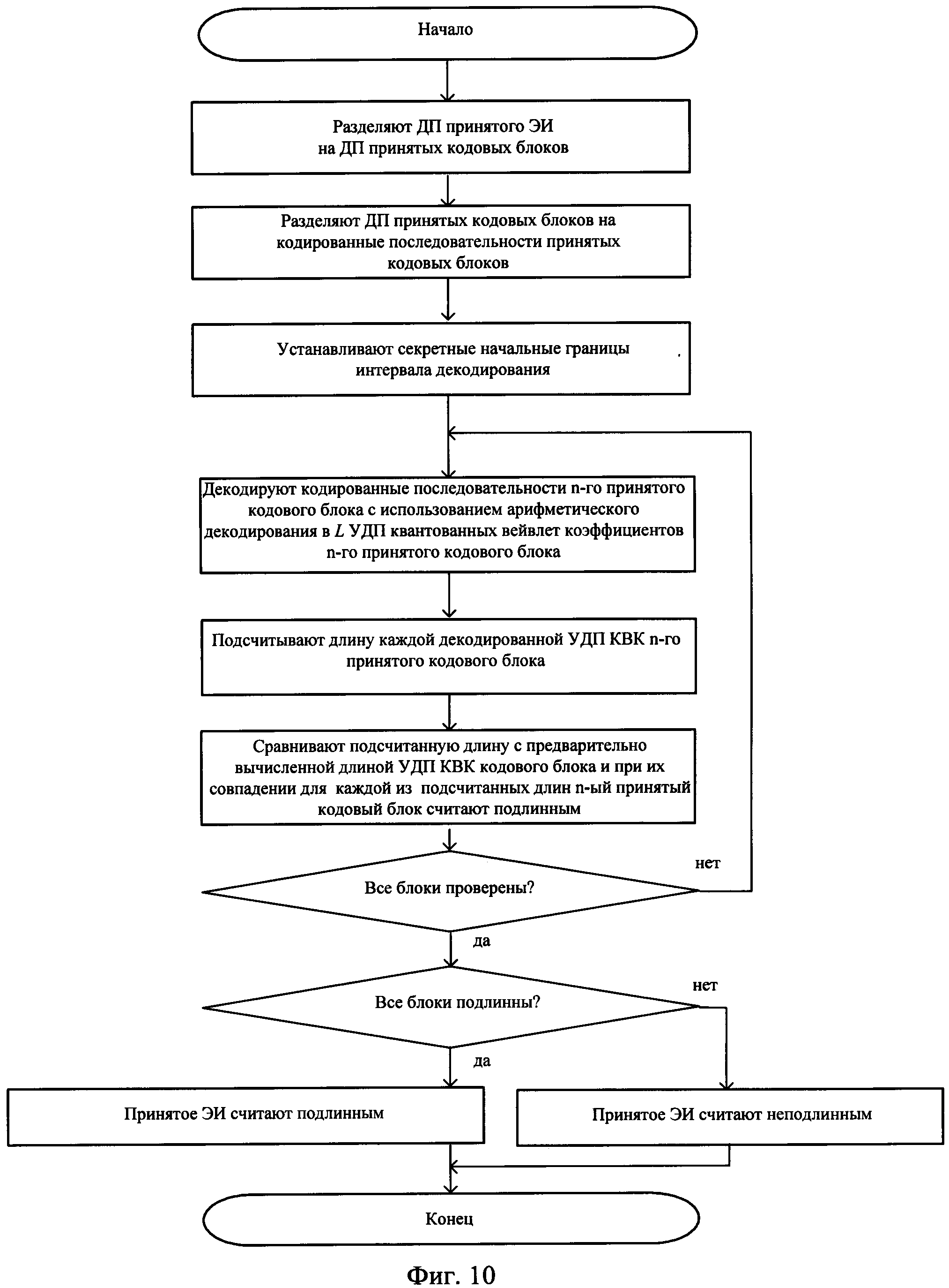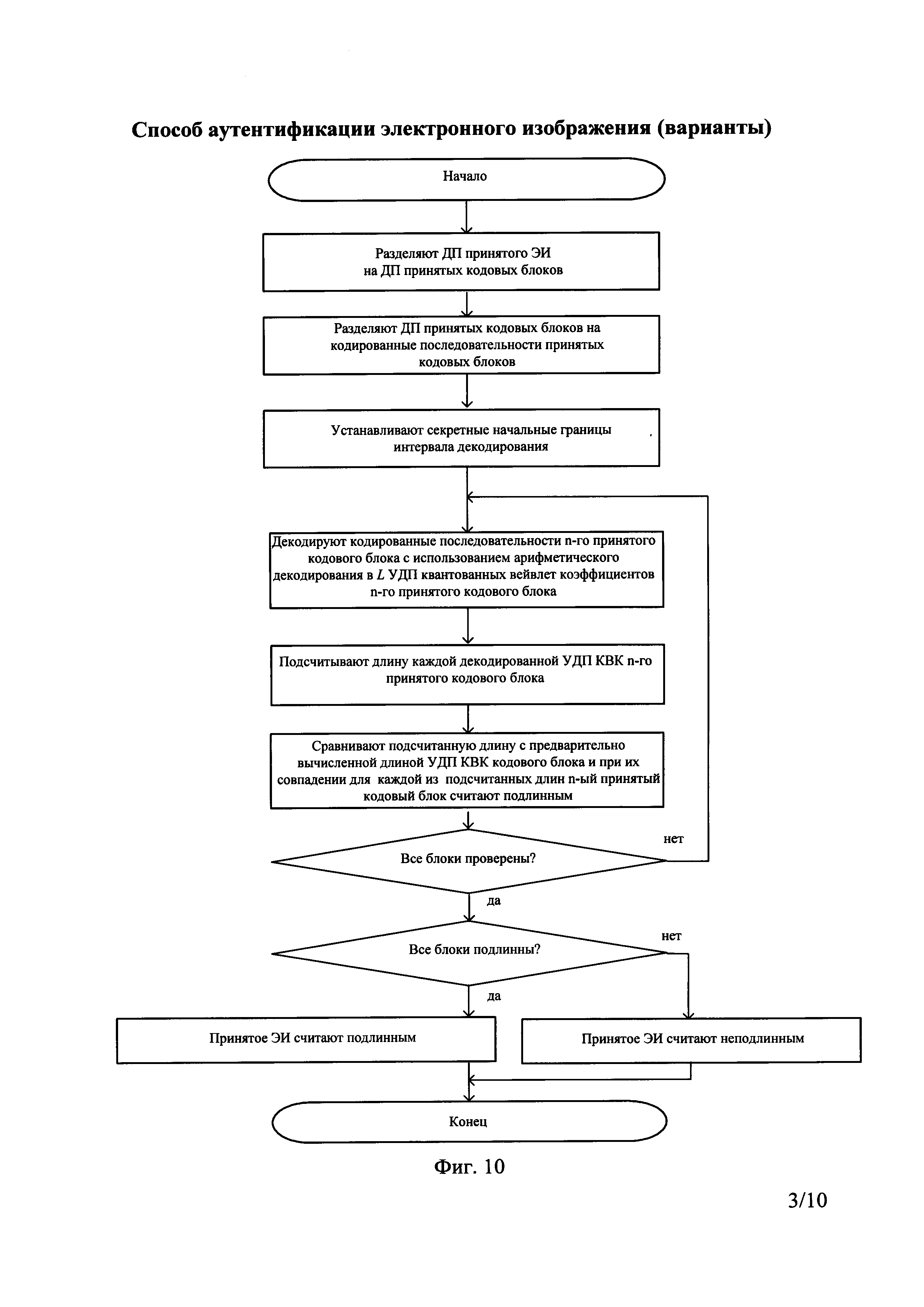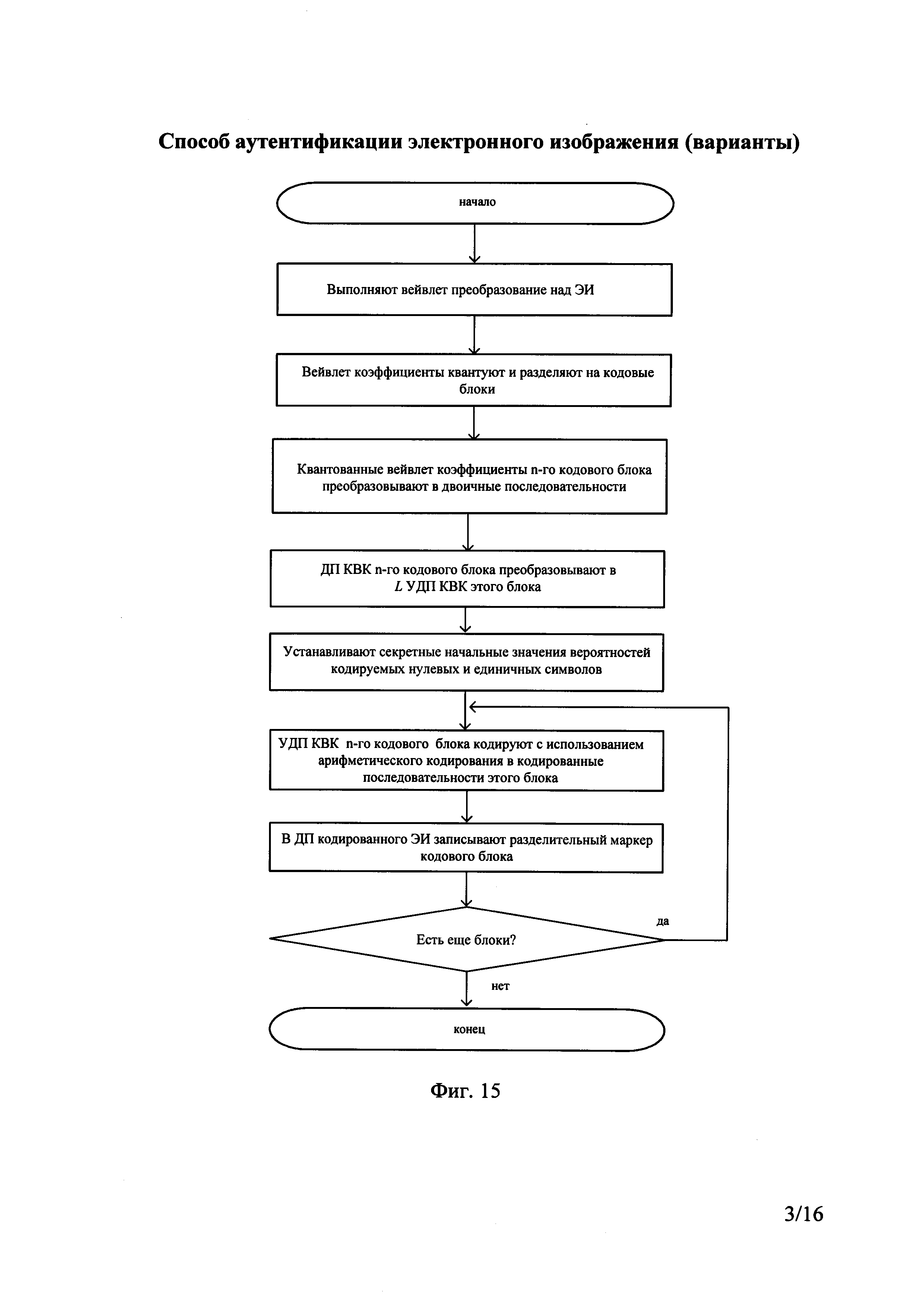 Изобретение относится к защите подлинности электронных изображений (ЭИ), сжимаемых алгоритмами сжатия ЭИ, передаваемых по общедоступным каналам передачи. Техническим результатом является уменьшение разницы длины кодированного с обеспечением аутентификации ЭИ по сравнению с длиной кодированного без обеспечения аутентификации ЭИ. У отправителя над ЭИ выполняют вейвлет преобразование, полученные вейвлет коэффициенты квантуют и разделяют на кодовые блоки, из которых формируют упорядоченные двоичные последовательности, которые кодируют в кодированные последовательности. Перед кодированием устанавливают секретные начальные границы интервала кодирования в соответствии с секретным ключом. Передают кодированное ЭИ получателю. Проверяют подлинность ЭИ: декодируют кодированные последовательности в упорядоченные двоичные последовательности, причем перед декодированием устанавливают секретные начальные границы интервала декодирования в соответствии с секретным ключом; повторяют действия по проверке подлинности принятых кодовых блоков до завершения их приема. Принятое ЭИ считают подлинным, если подлинными оказываются все принятые кодовые блоки. 4 н. и 4 з.п. ф-лы, 38 ил.