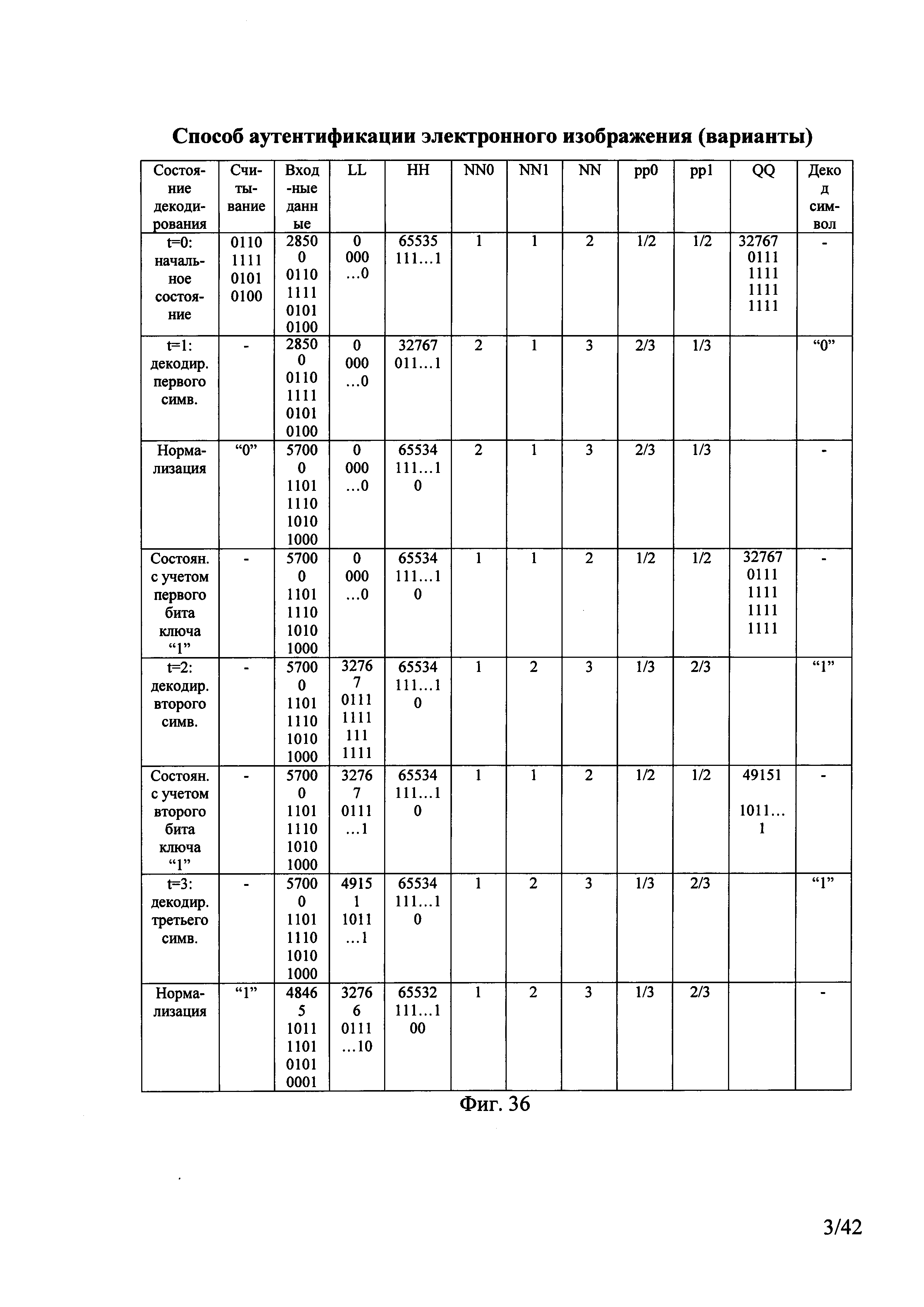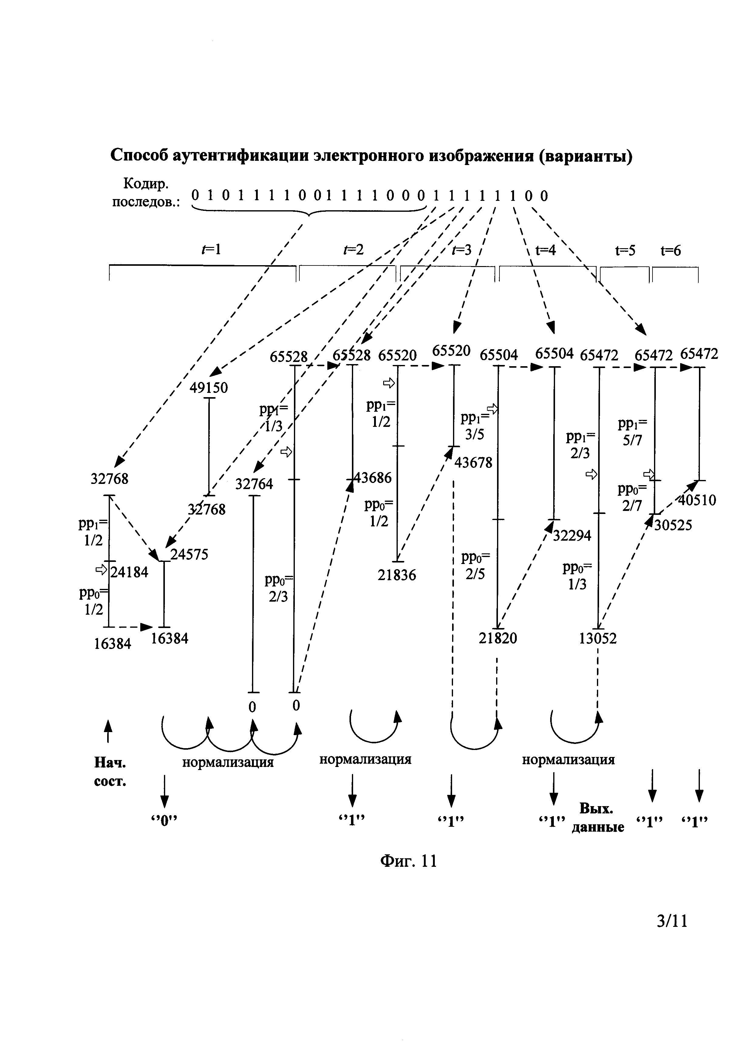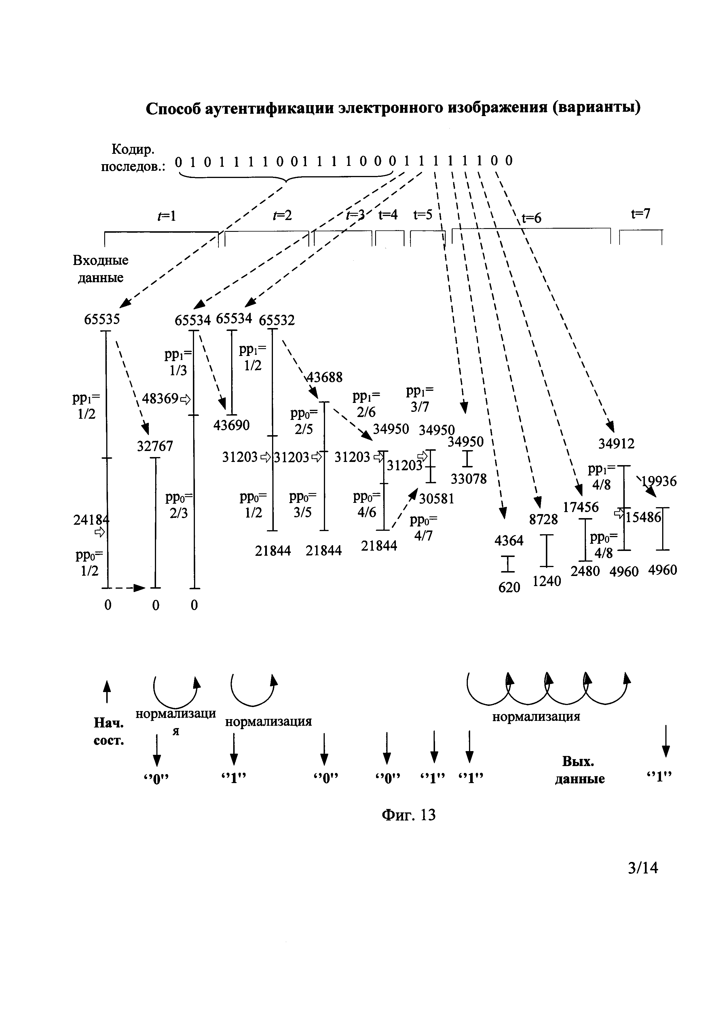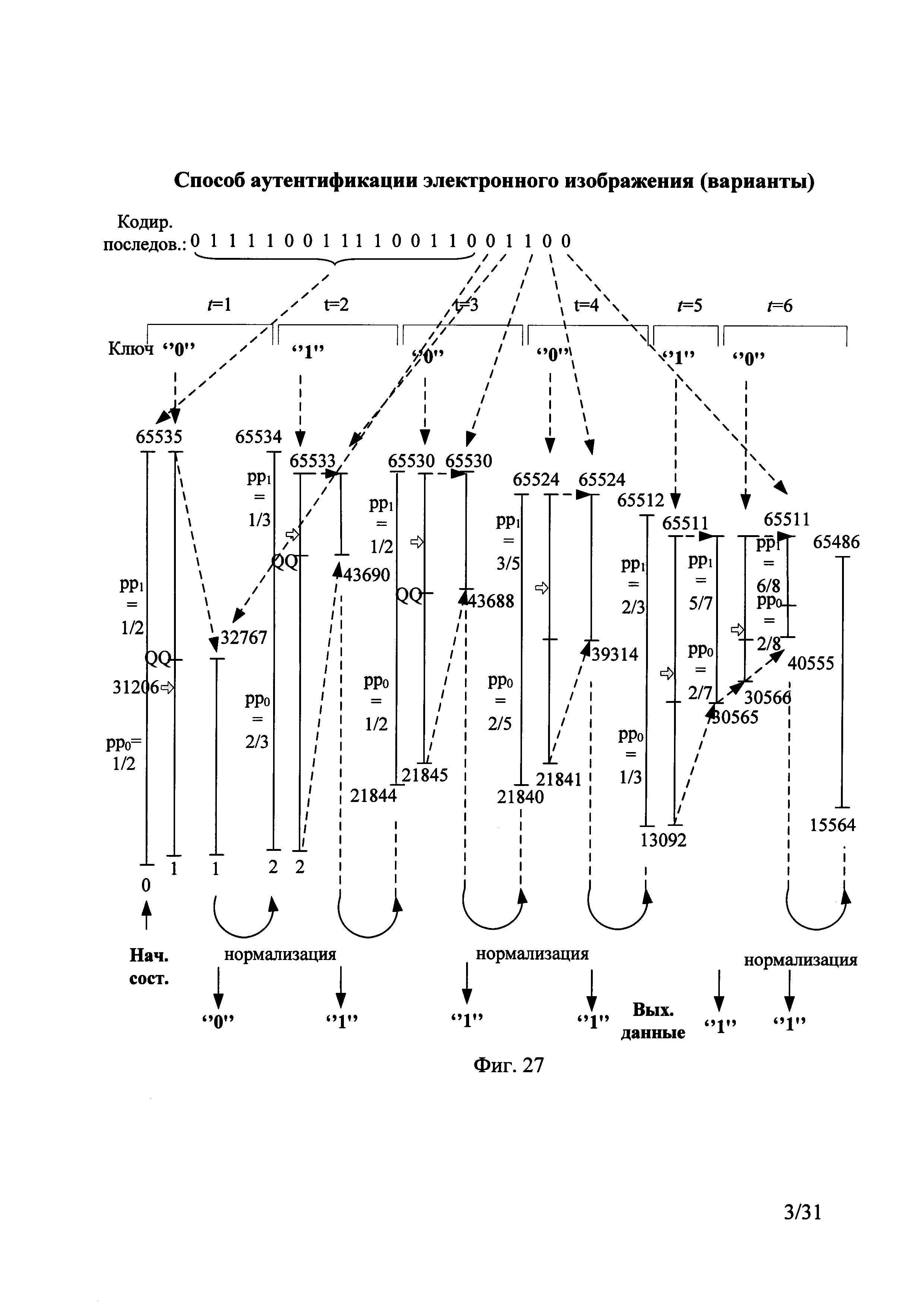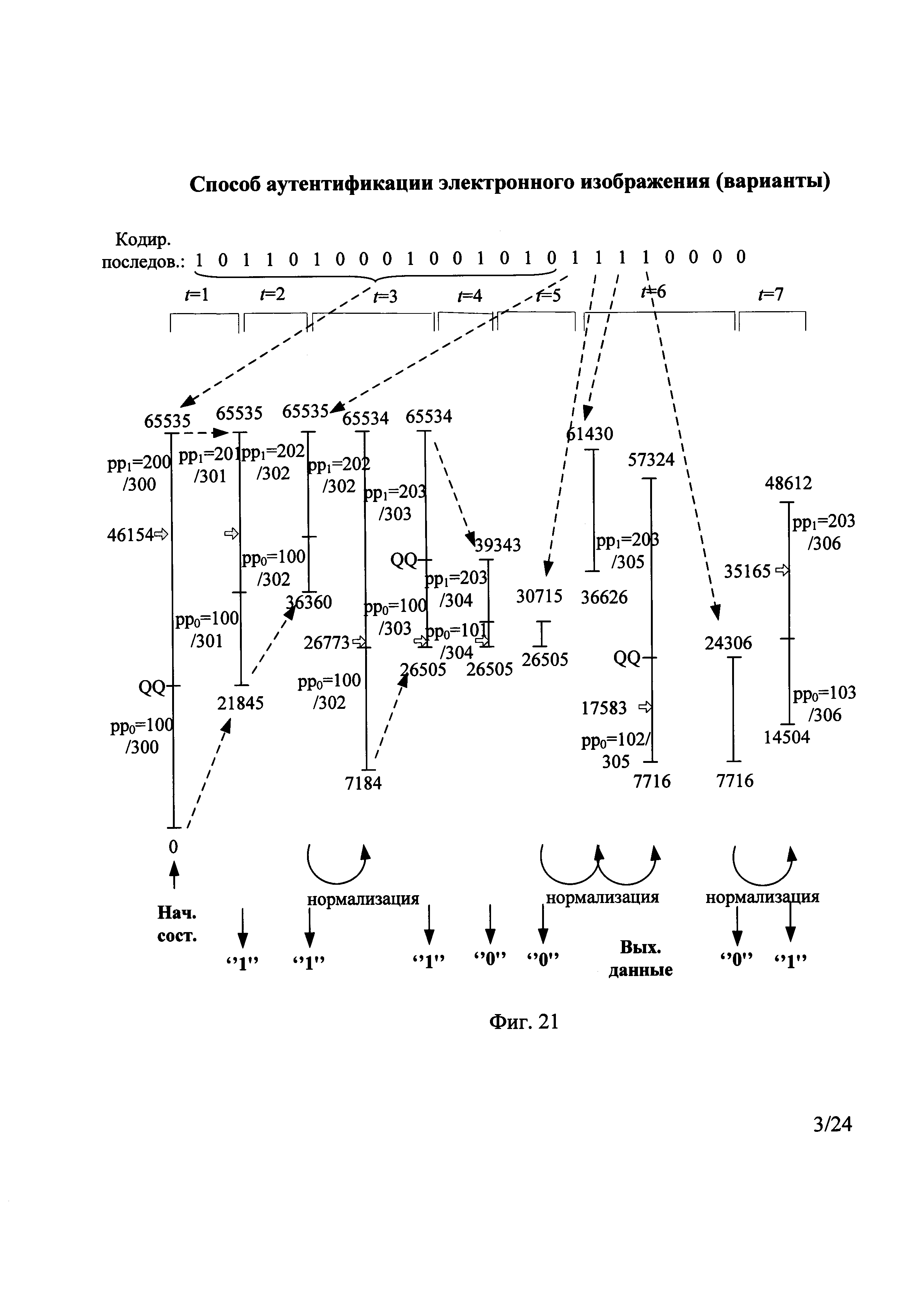 Изобретение относится к защите подлинности электронных изображений (ЭИ), сжимаемых алгоритмами сжатия ЭИ, передаваемых по общедоступным каналам передачи. Техническим результатом является уменьшение разницы длины кодированного с обеспечением аутентификации ЭИ по сравнению с длиной кодированного без обеспечения аутентификации ЭИ. У отправителя над ЭИ выполняют вейвлет преобразование, полученные вейвлет коэффициенты квантуют и разделяют на кодовые блоки, из которых формируют упорядоченные двоичные последовательности, которые кодируют в кодированные последовательности. Перед кодированием устанавливают секретные начальные границы интервала кодирования в соответствии с секретным ключом. Передают кодированное ЭИ получателю. Проверяют подлинность ЭИ: декодируют кодированные последовательности в упорядоченные двоичные последовательности, причем перед декодированием устанавливают секретные начальные границы интервала декодирования в соответствии с секретным ключом; повторяют действия по проверке подлинности принятых кодовых блоков до завершения их приема. Принятое ЭИ считают подлинным, если подлинными оказываются все принятые кодовые блоки. 4 н. и 4 з.п. ф-лы, 38 ил.