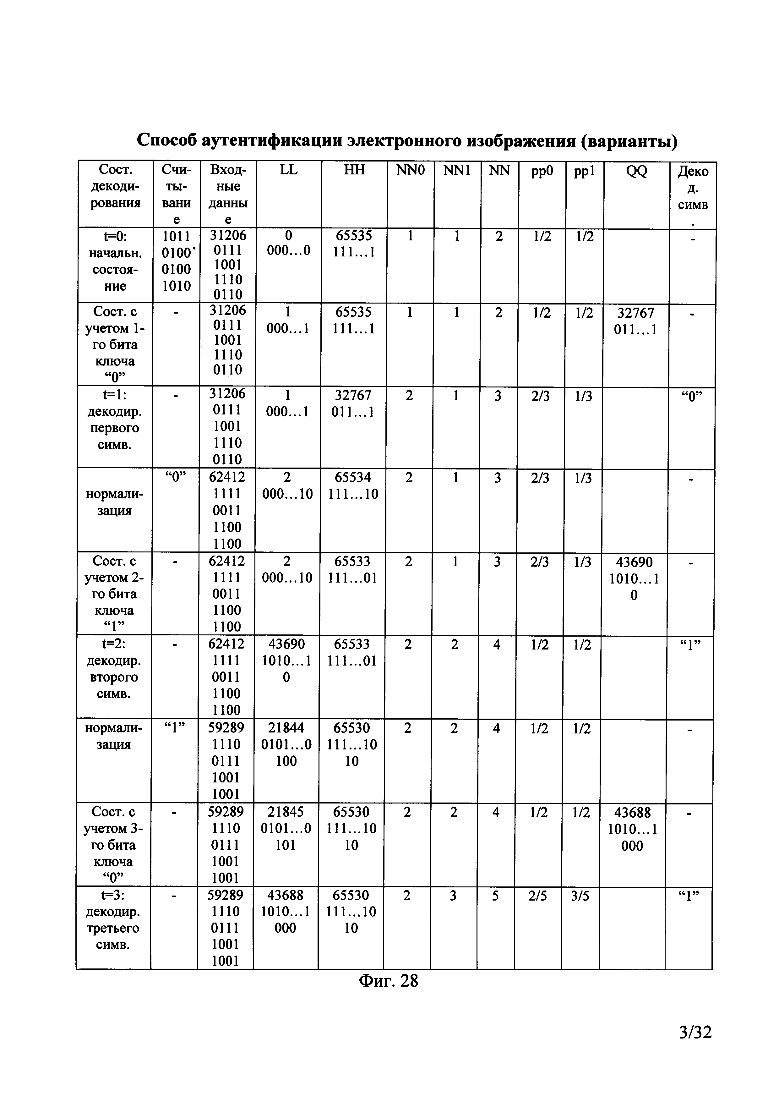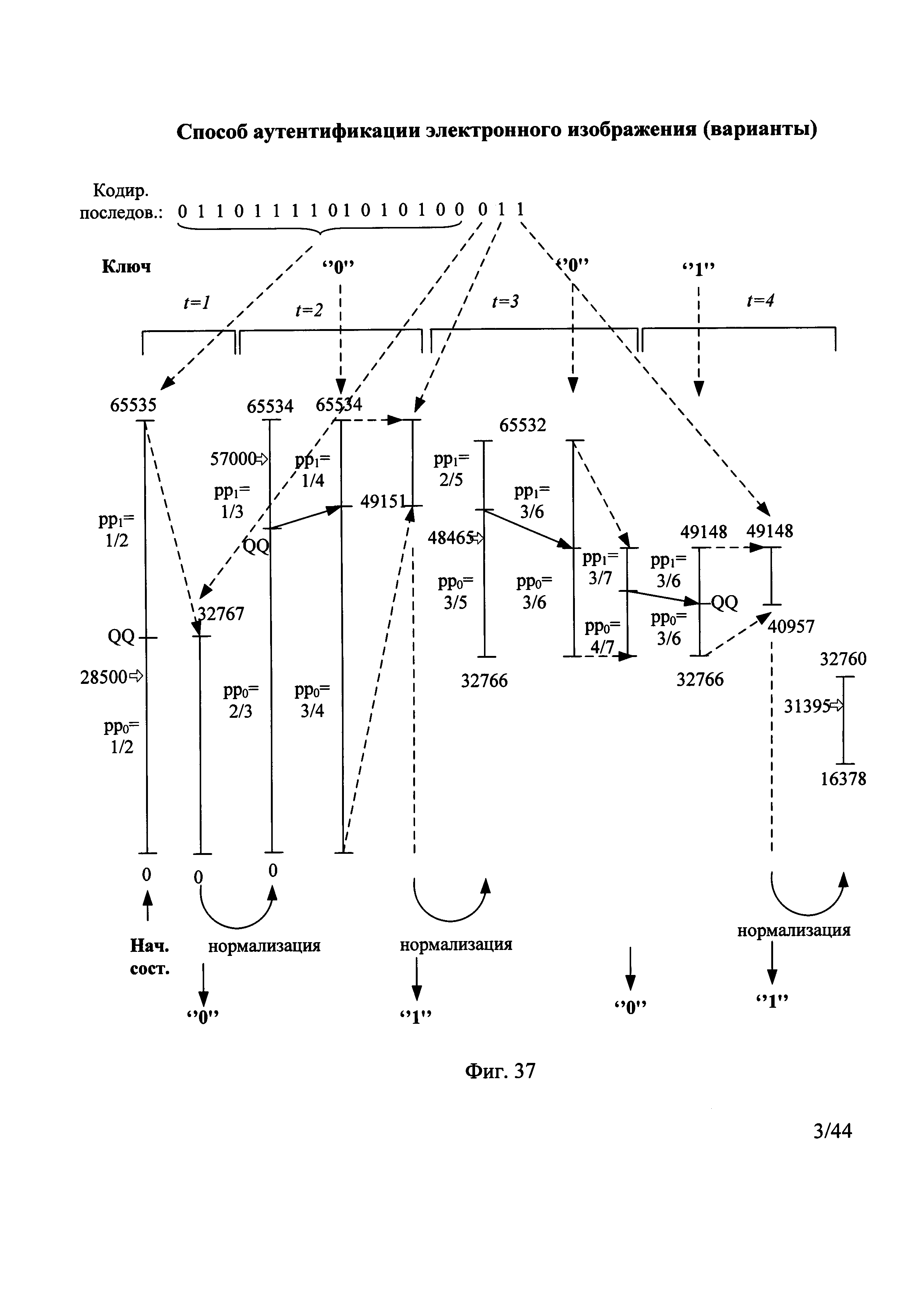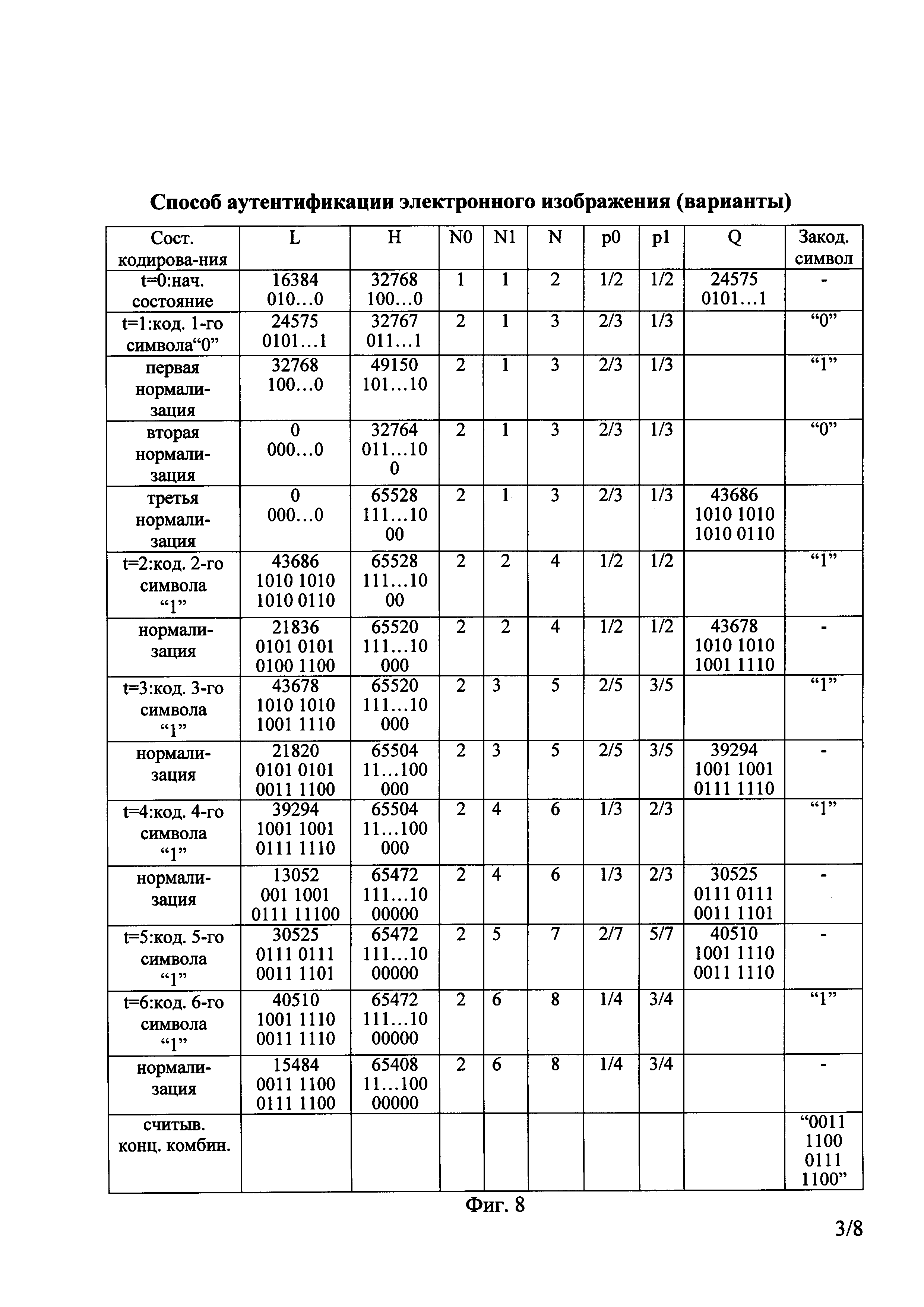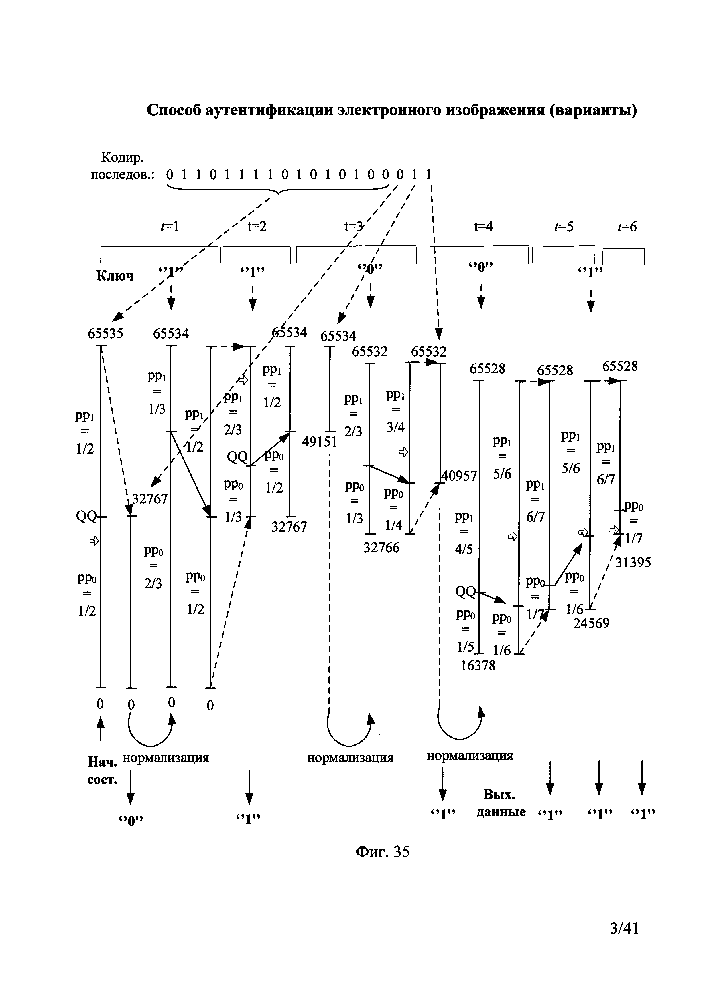 Изобретение относится к защите подлинности электронных изображений (ЭИ), сжимаемых алгоритмами сжатия ЭИ, передаваемых по общедоступным каналам передачи. Техническим результатом является уменьшение разницы длины кодированного с обеспечением аутентификации ЭИ по сравнению с длиной кодированного без обеспечения аутентификации ЭИ. У отправителя над ЭИ выполняют вейвлет преобразование, полученные вейвлет коэффициенты квантуют и разделяют на кодовые блоки, из которых формируют упорядоченные двоичные последовательности, которые кодируют в кодированные последовательности. Перед кодированием устанавливают секретные начальные границы интервала кодирования в соответствии с секретным ключом. Передают кодированное ЭИ получателю. Проверяют подлинность ЭИ: декодируют кодированные последовательности в упорядоченные двоичные последовательности, причем перед декодированием устанавливают секретные начальные границы интервала декодирования в соответствии с секретным ключом; повторяют действия по проверке подлинности принятых кодовых блоков до завершения их приема. Принятое ЭИ считают подлинным, если подлинными оказываются все принятые кодовые блоки. 4 н. и 4 з.п. ф-лы, 38 ил.