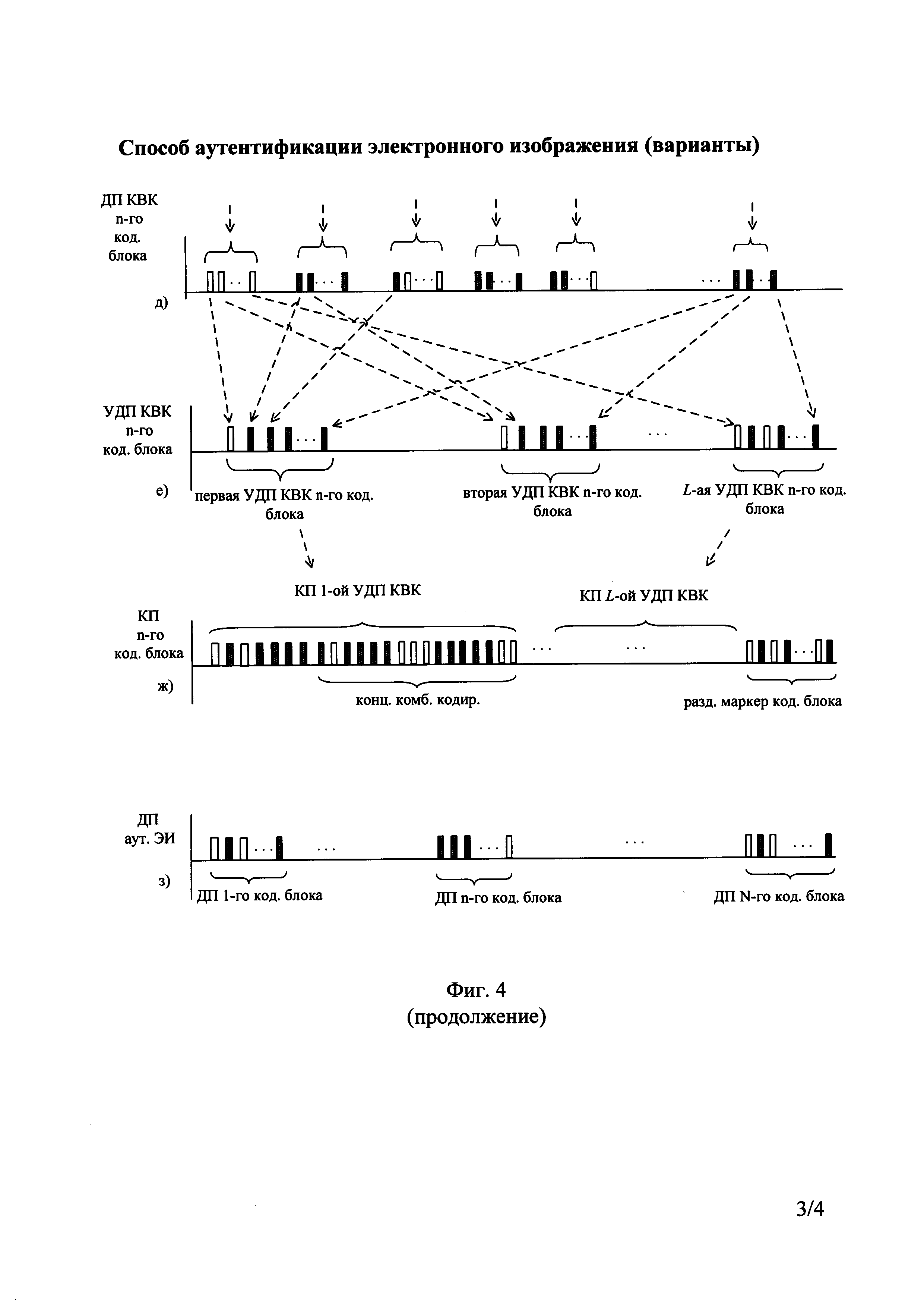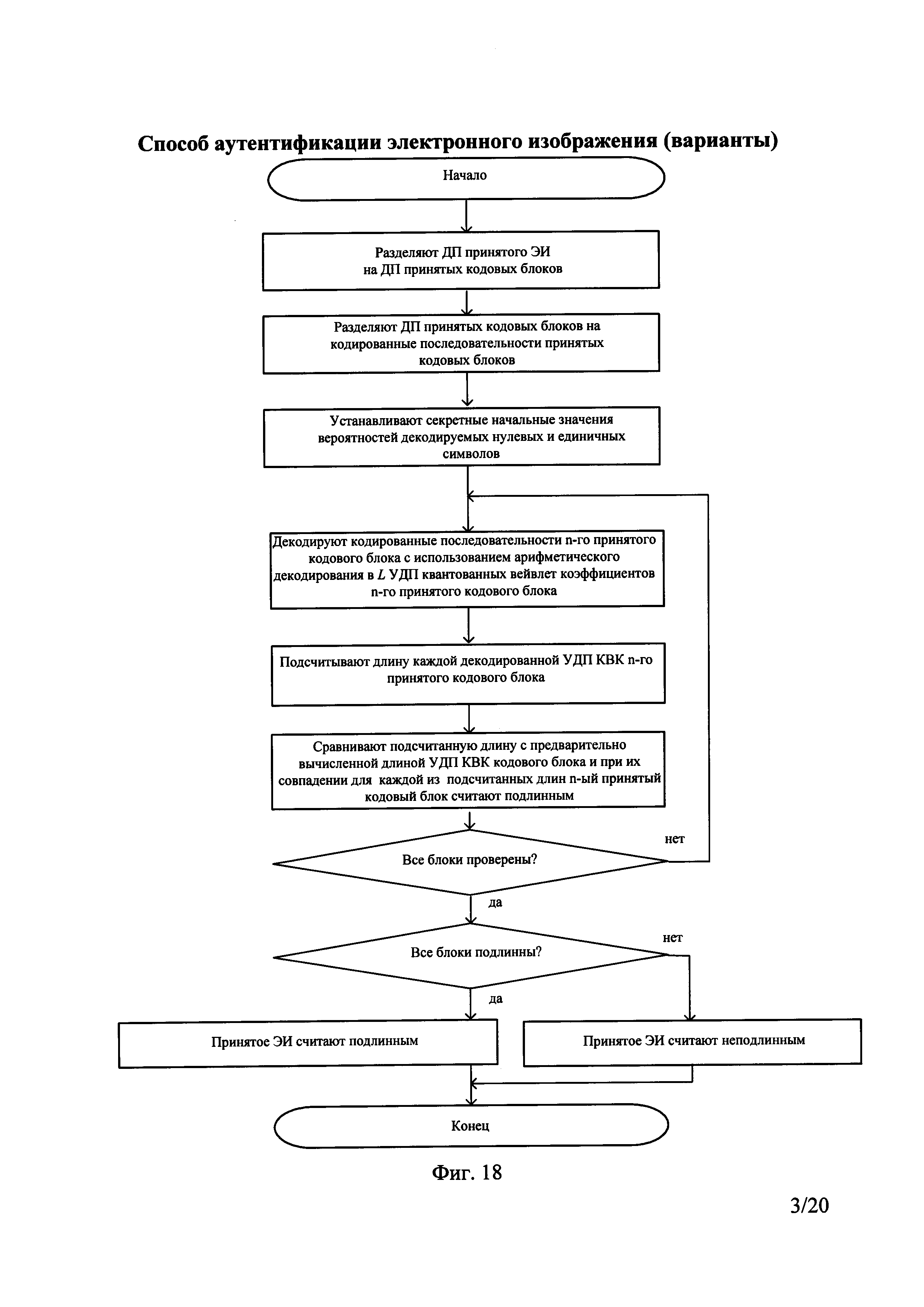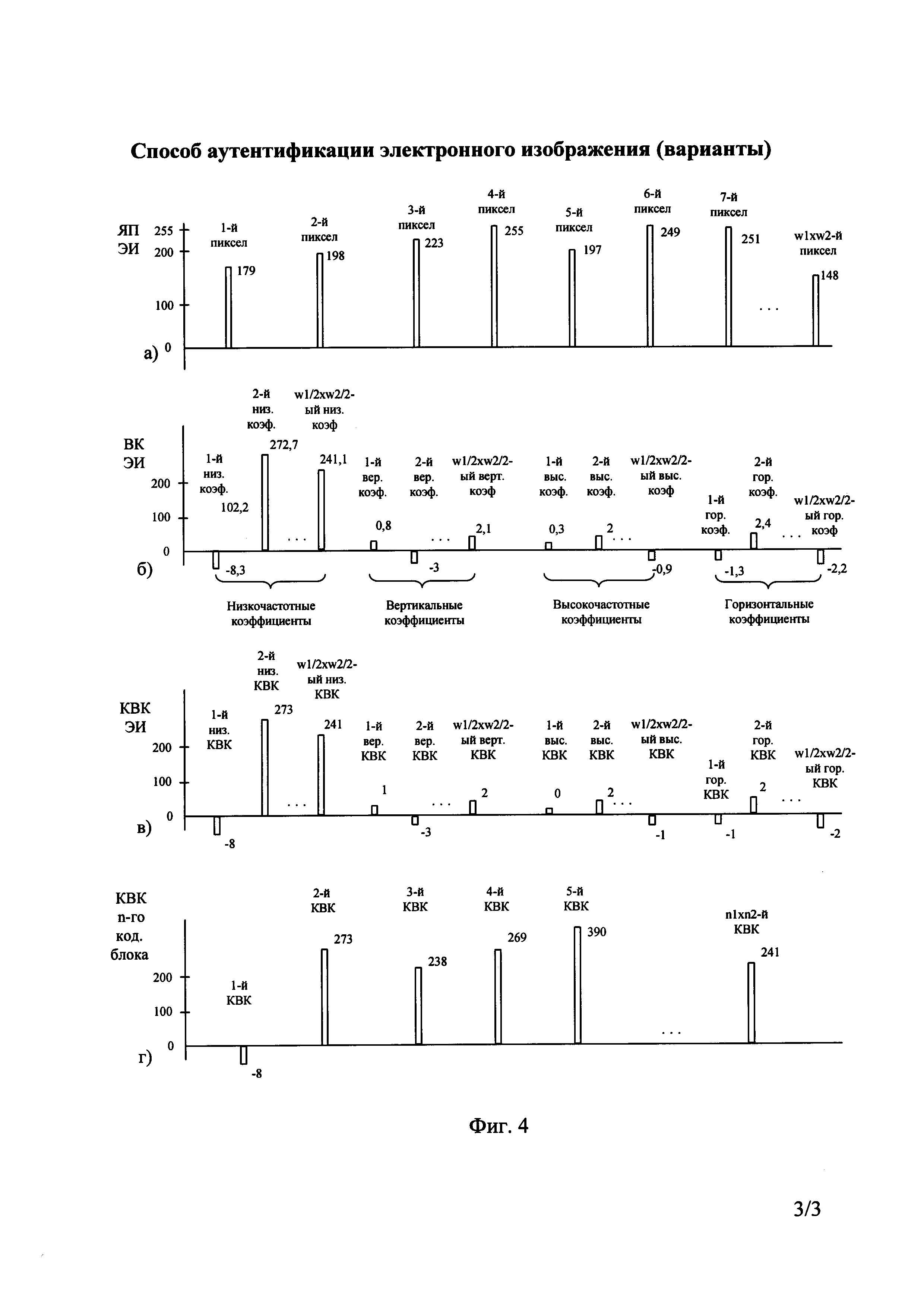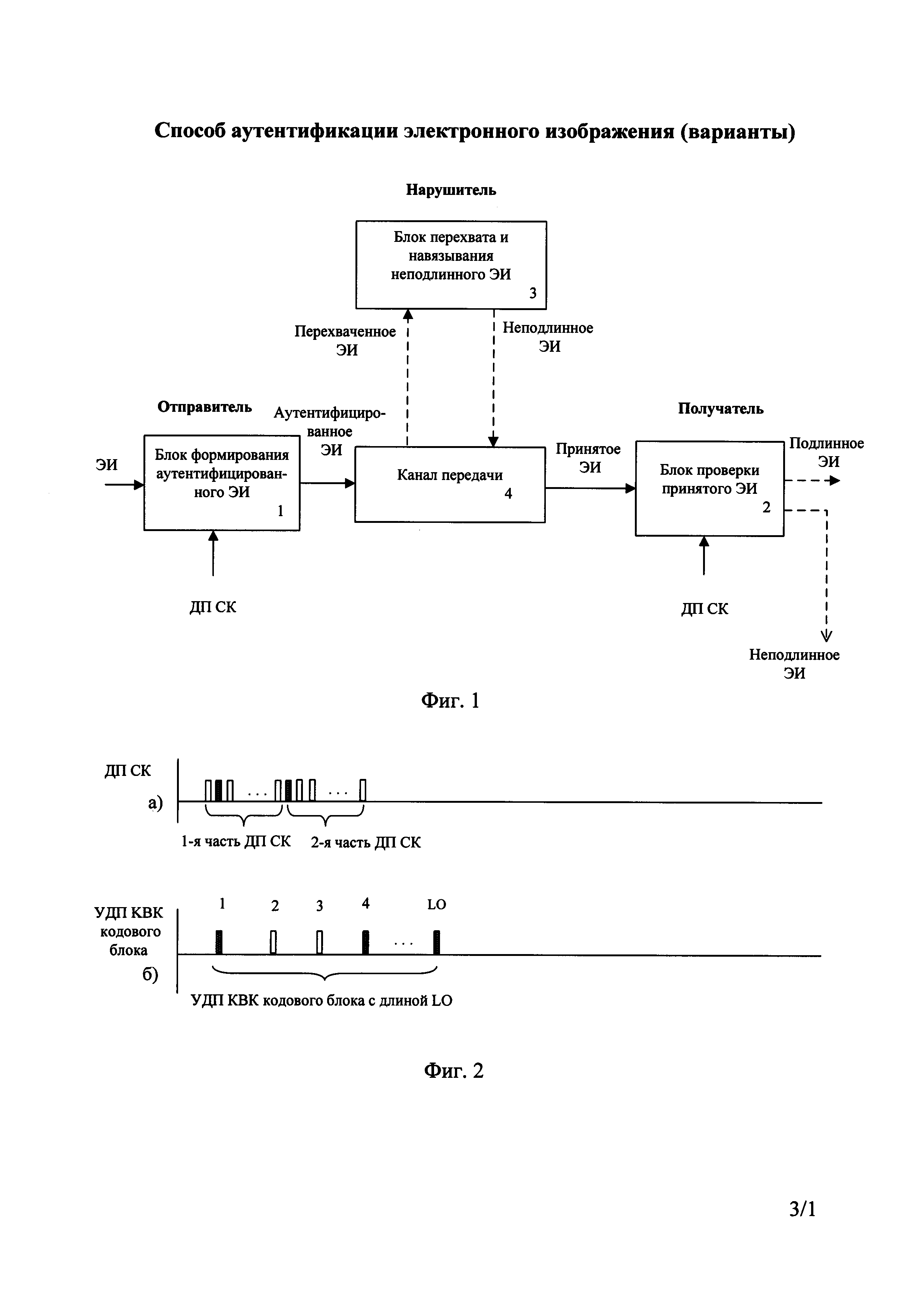 Заявленные технические решения объединены единым изобретательским замыслом и относятся к области электросвязи и информационных технологий, а именно к технике защиты подлинности электронных изображений (ЭИ), сжимаемых алгоритмами сжатия ЭИ, такими как JPEG2000, Н.264 и т.п., передаваемых отправителем получателю по общедоступным каналам передачи, в которых нарушитель может осуществлять действия по навязыванию получателю неподлинных ЭИ. Заявленные объекты изобретения могут быть использованы для обеспечения подлинности ЭИ, передаваемых в современных информационно-телекоммуникационных системах. Известны способы аутентификации ЭИ на основе вычисления отправителем и проверки получателем имитовставки двоичной последовательности (ДП) этого изображения. Эти способы относятся к криптографическим способам контроля подлинности ЭИ и описаны, например, в государственном стандарте 28147-89. Системы обработки информации. Защита криптографическая. Алгоритм криптографического преобразования. - М.: Госстандарт СССР. 1989, стр. 9-14. В данных способах ЭИ сжимают в соответствии с алгоритмом JPEG2000, предписанным международным стандартом ISO/IES 15444. Двоичную последовательность сжатого электронного изображения JPEG разделяют у отправителя на последовательные блоки длиной n бит, где обычно n=64. По криптографической функции формирования имитовставки с использованием заранее сформированной для отправителя и получателя двоичной последовательности (ДП) секретного ключа (СК) последовательно от каждого блока с учетом предыдущего зашифрованного блока формируют зашифрованный текущий блок до тех пор, пока поступает ДП ЭИ. Из последнего зашифрованного блока выделяют ДП имитовставки ЭИ длиной l<n бит.Затем ДП ЭИ и ДП имитовставки передают по каналу связи или записывают на электронные носители, например, CD или DVD диски. Принятое получателем ЭИ проверяют, для чего заново разделяют его ДП на последовательные принятые блоки длиной n бит, по криптографической функции формирования имитовставки с использованием ДПСК последовательно от каждого принятого блока с учетом предыдущего зашифрованного принятого блока формируют очередной зашифрованный принятый блок до тех пор, пока поступает ДП принятого ЭИ. Из последнего зашифрованного принятого блока выделяют длиной l<n бит ДП имитовставки принятого ЭИ и при полном совпадении заново сформированной и принятой имитовставок принятое ЭИ считают подлинным. Недостатками указанных аналогов являются: - невозможность проверки подлинности части аутентифицированного с использованием имитовставки ЭИ; - уменьшение пропускной способности каналов передачи или необходимость использования запоминающих устройств большой емкости из-за включения и последующей передачи по каналу связи имитовставки электронного изображения. Известны также способы аутентификации ЭИ на основе вычисления и встраивания цифровых водяных знаков (ЦВЗ) в электронное изображение. Эти способы относятся к стеганографическим способам контроля подлинности ЭИ и описаны, например, в способе аутентификации ЭИ по патенту США 7313696 МПК H04L 9/00 (2006.01) от 25.12.07. Данный способ аутентификации ЭИ заключается в предварительном формировании для отправителя и получателя ДП СК, криптографической функции хэширования и криптографической функции шифрования. У отправител