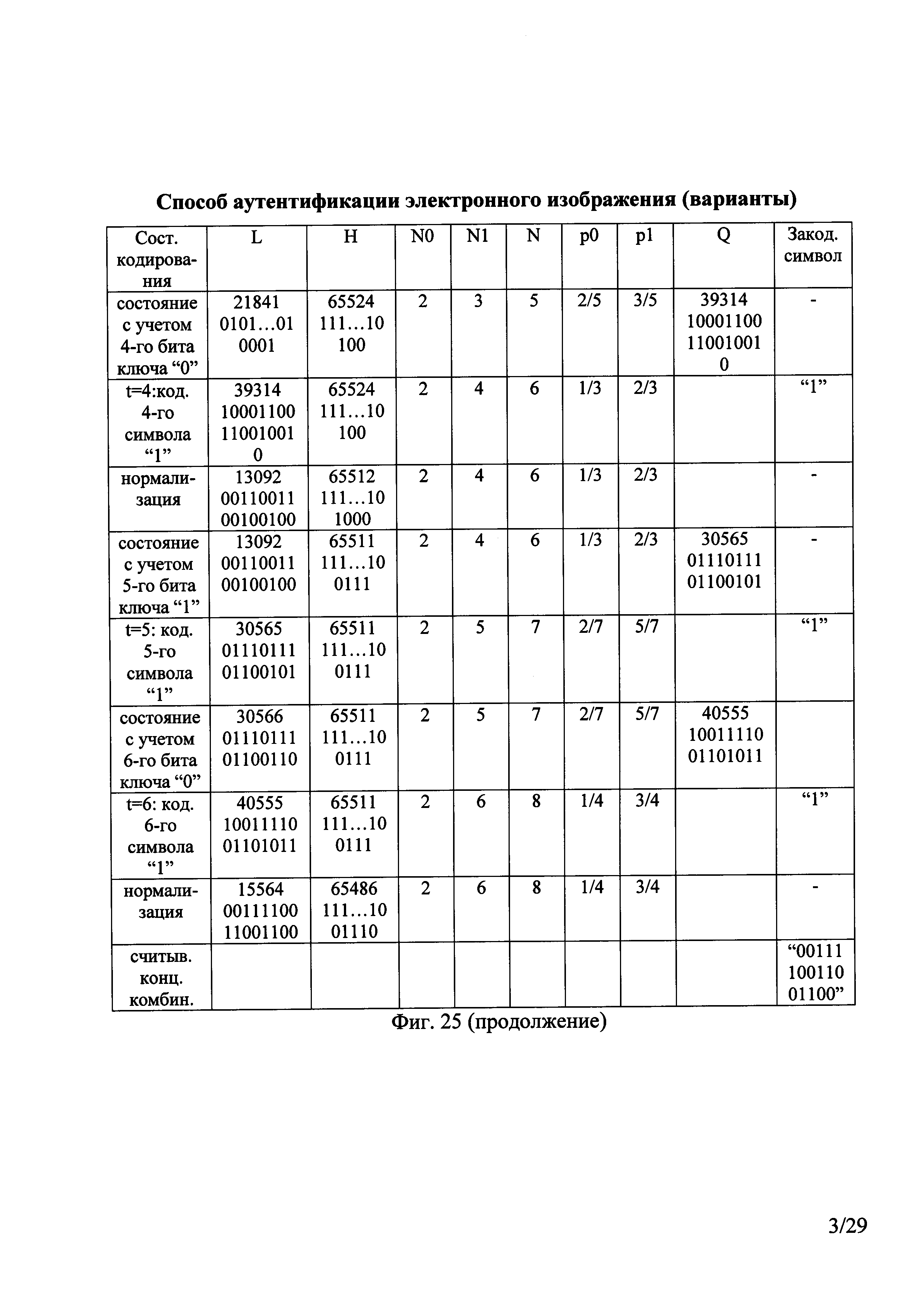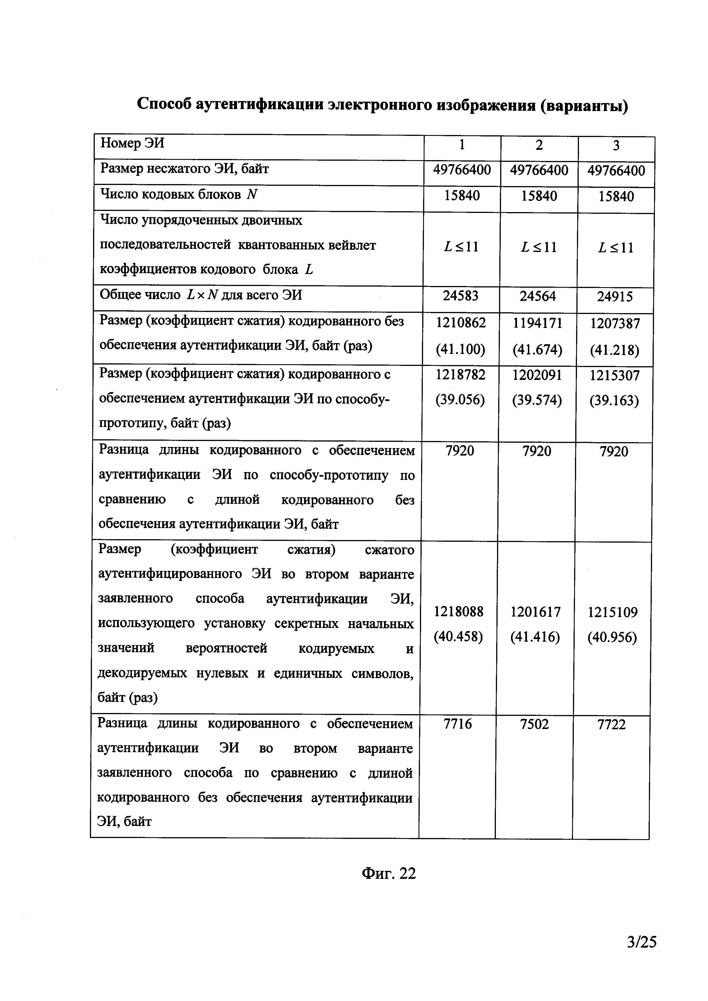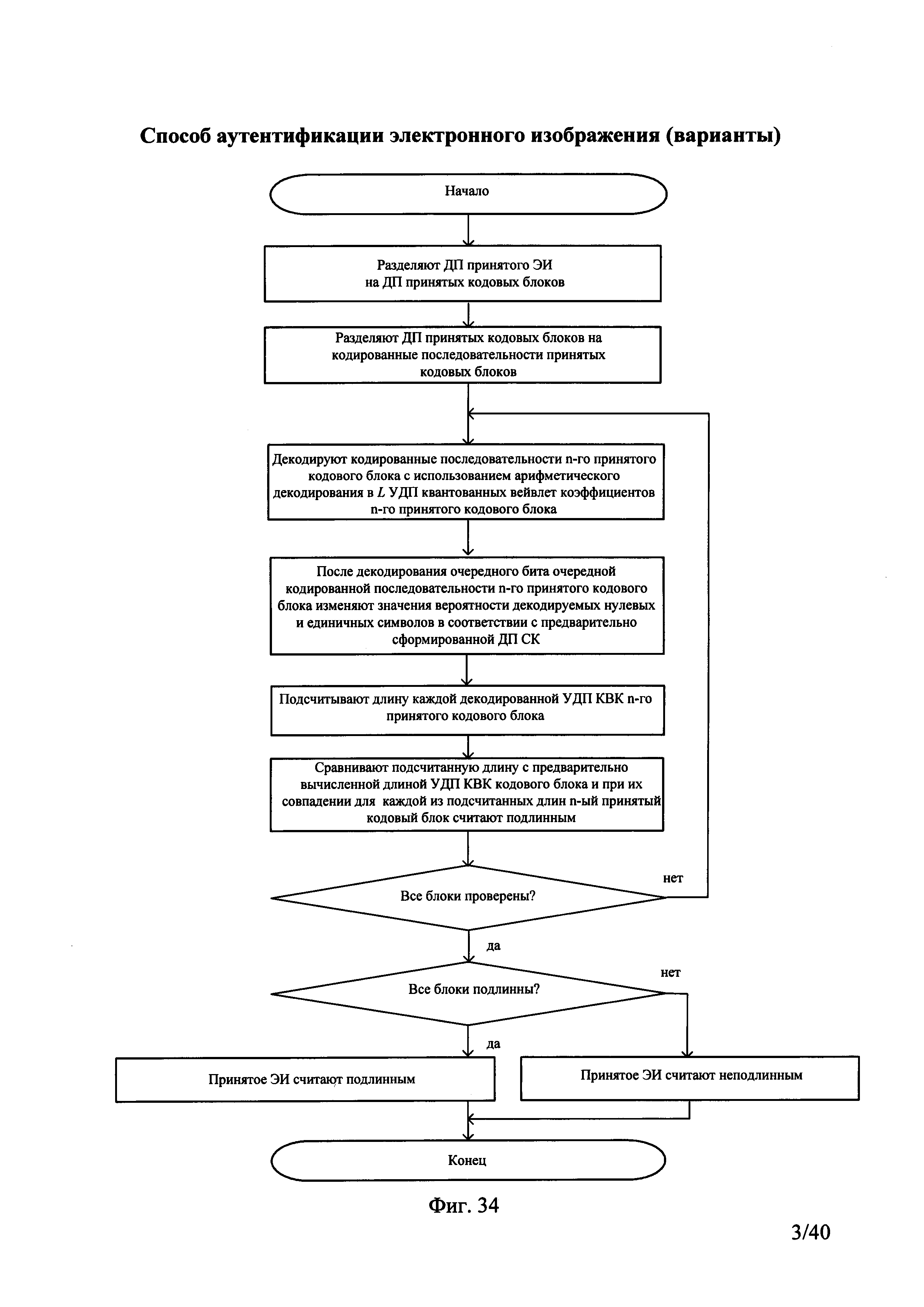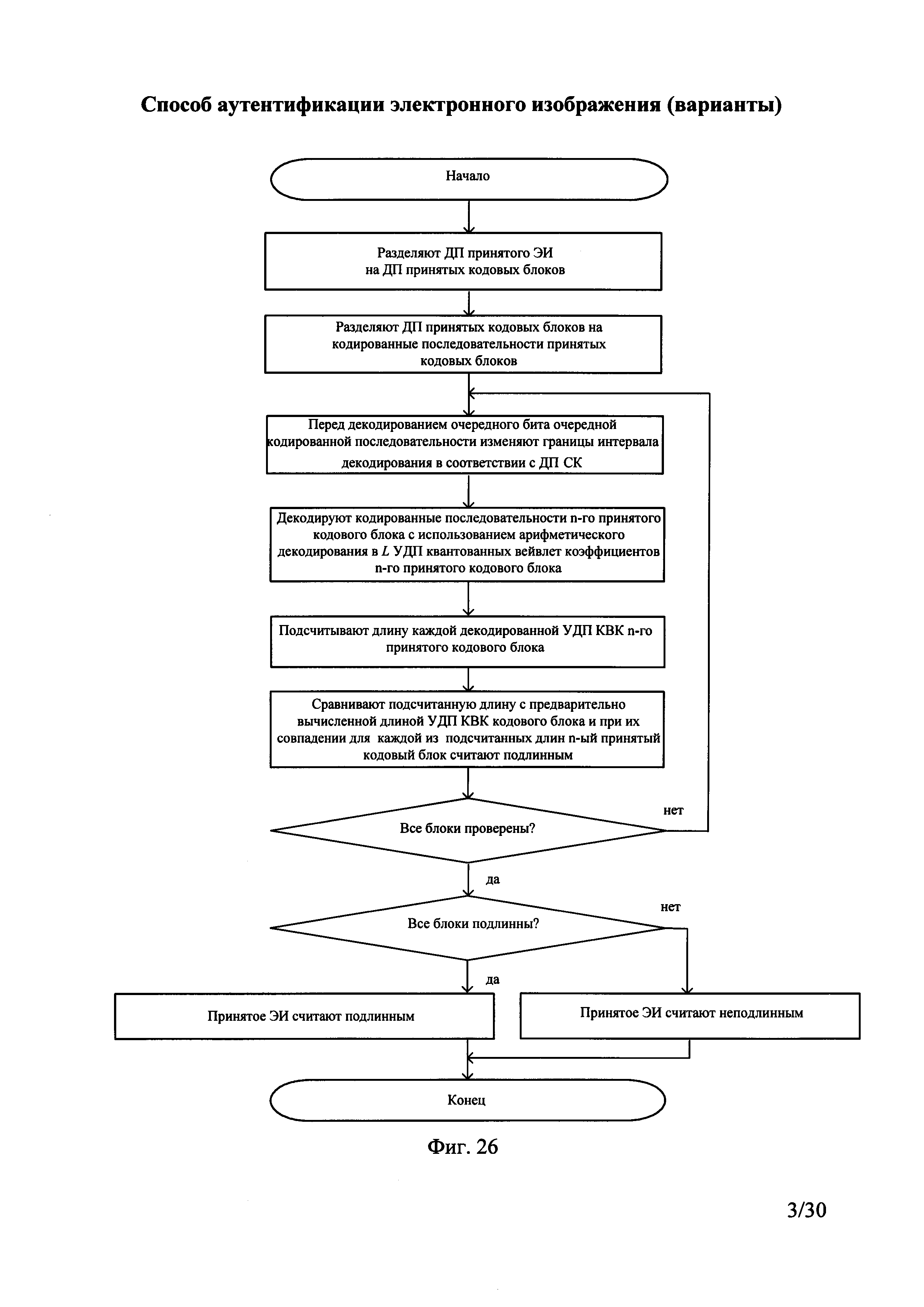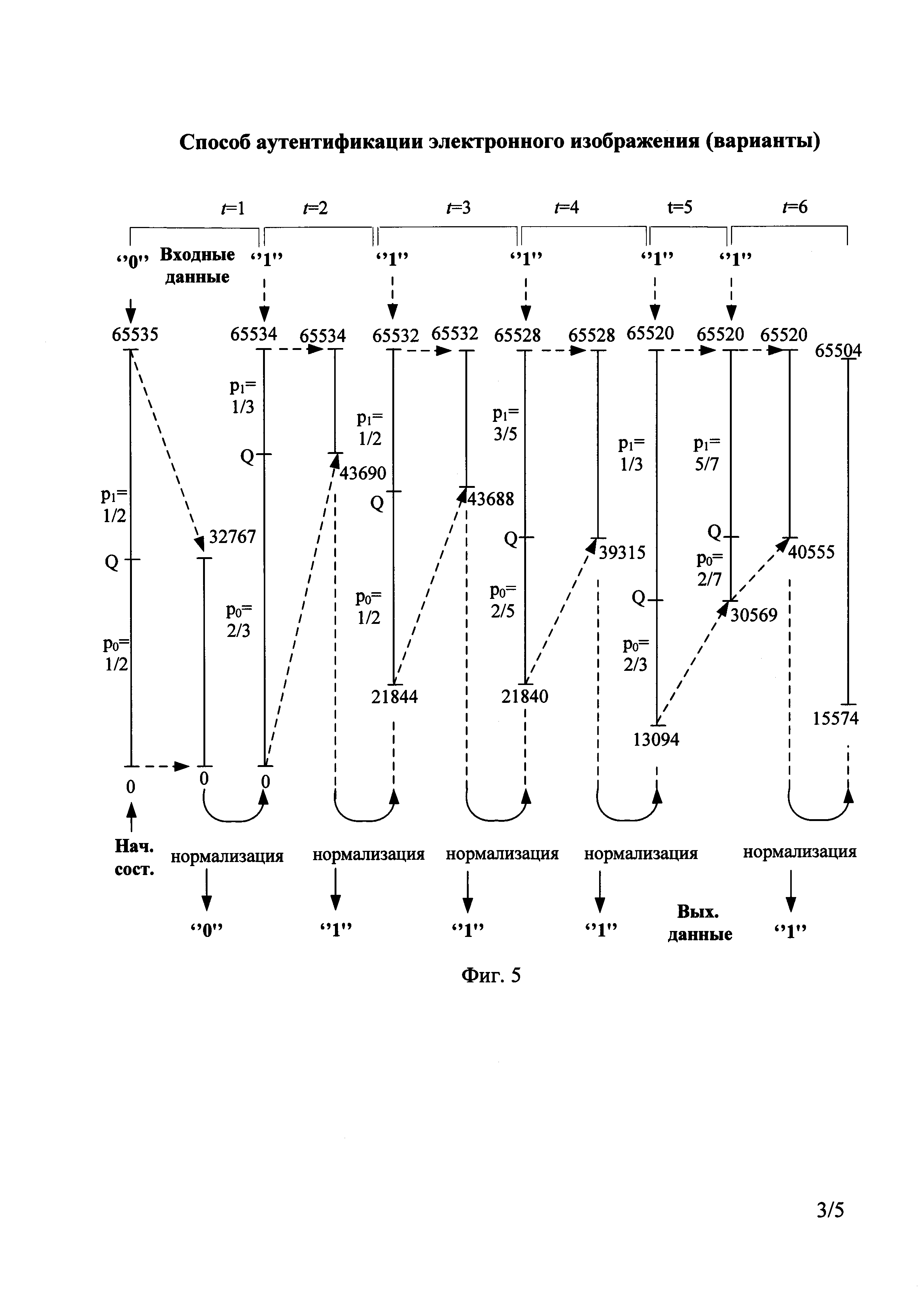 Заявленные технические решения объединены единым изобретательским замыслом и относятся к области электросвязи и информационных технологий, а именно к технике защиты подлинности электронных изображений (ЭИ), сжимаемых алгоритмами сжатия ЭИ, такими как JPEG2000, Н.264 и т.п., передаваемых отправителем получателю по общедоступным каналам передачи, в которых нарушитель может осуществлять действия по навязыванию получателю неподлинных ЭИ. Заявленные объекты изобретения могут быть использованы для обеспечения подлинности ЭИ, передаваемых в современных информационно-телекоммуникационных системах. Известны способы аутентификации ЭИ на основе вычисления отправителем и проверки получателем имитовставки двоичной последовательности (ДП) этого изображения. Эти способы относятся к криптографическим способам контроля подлинности ЭИ и описаны, например, в государственном стандарте 28147-89. Системы обработки информации. Защита криптографическая. Алгоритм криптографического преобразования. - М.: Госстандарт СССР. 1989, стр. 9-14. В данных способах ЭИ сжимают в соответствии с алгоритмом JPEG2000, предписанным международным стандартом ISO/IES 15444. Двоичную последовательность сжатого электронного изображения JPEG разделяют у отправителя на последовательные блоки длиной n бит, где обычно n=64. По криптографической функции формирования имитовставки с использованием заранее сформированной для отправителя и получателя двоичной последовательности (ДП) секретного ключа (СК) последовательно от каждого блока с учетом предыдущего зашифрованного блока формируют зашифрованный текущий блок до тех пор, пока поступает ДП ЭИ. Из последнего зашифрованного блока выделяют ДП имитовставки ЭИ длиной l<n бит.Затем ДП ЭИ и ДП имитовставки передают по каналу связи или записывают на электронные носители, например, CD или DVD диски. Принятое получателем ЭИ проверяют, для чего заново разделяют его ДП на последовательные принятые блоки длиной n бит, по криптографической функции формирования имитовставки с использованием ДПСК последовательно от каждого принятого блока с учетом предыдущего зашифрованного принятого блока формируют очередной зашифрованный принятый блок до тех пор, пока поступает ДП принятого ЭИ. Из последнего зашифрованного принятого блока выделяют длиной l<n бит ДП имитовставки принятого ЭИ и при полном совпадении заново сформированной и принятой имитовставок принятое ЭИ считают подлинным. Недостатками указанных аналогов являются: - невозможность проверки подлинности части аутентифицированного с использованием имитовставки ЭИ; - уменьшение пропускной способности каналов передачи или необходимость использования запоминающих устройств большой емкости из-за включения и последующей передачи по каналу связи имитовставки электронного изображения. Известны также способы аутентификации ЭИ на основе вычисления и встраивания цифровых водяных знаков (ЦВЗ) в электронное изображение. Эти способы относятся к стеганографическим способам контроля подлинности ЭИ и описаны, например, в способе аутентификации ЭИ по патенту США 7313696 МПК H04L 9/00 (2006.01) от 25.12.07. Данный способ аутентификации ЭИ заключается в предварительном формировании для отправителя и получателя ДП СК, криптографической функции хэширования и криптографической функции шифрования. У отправител