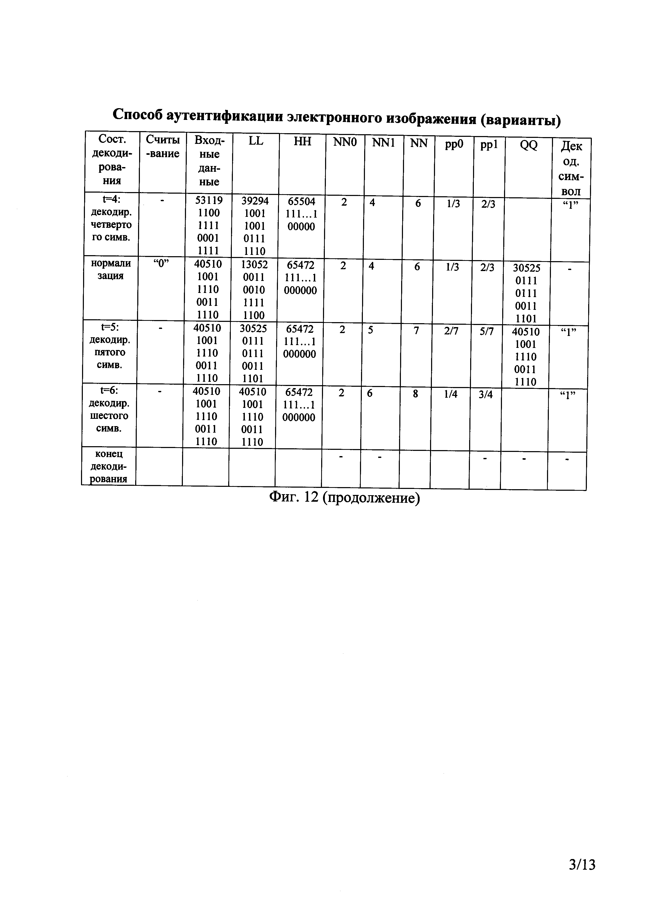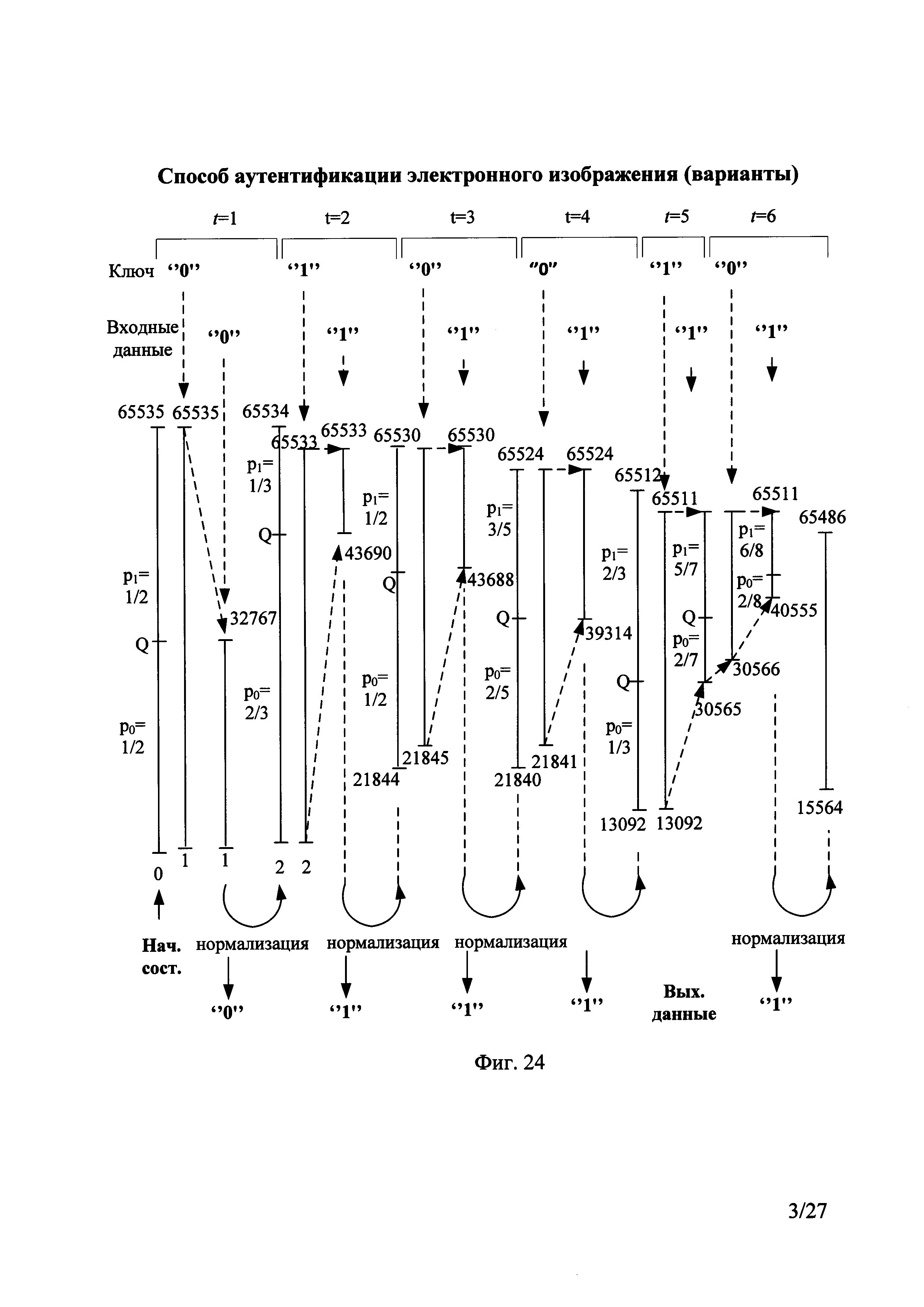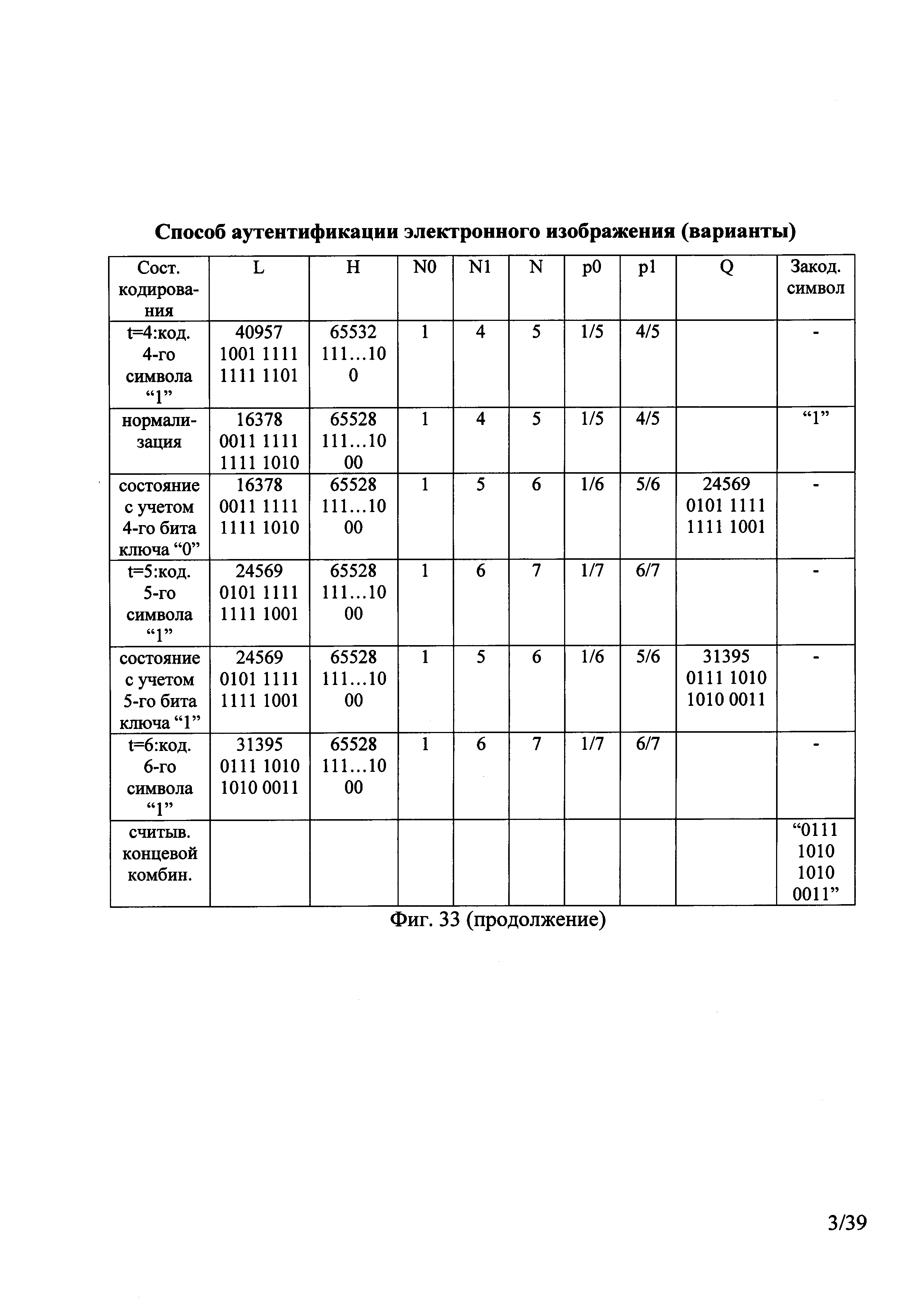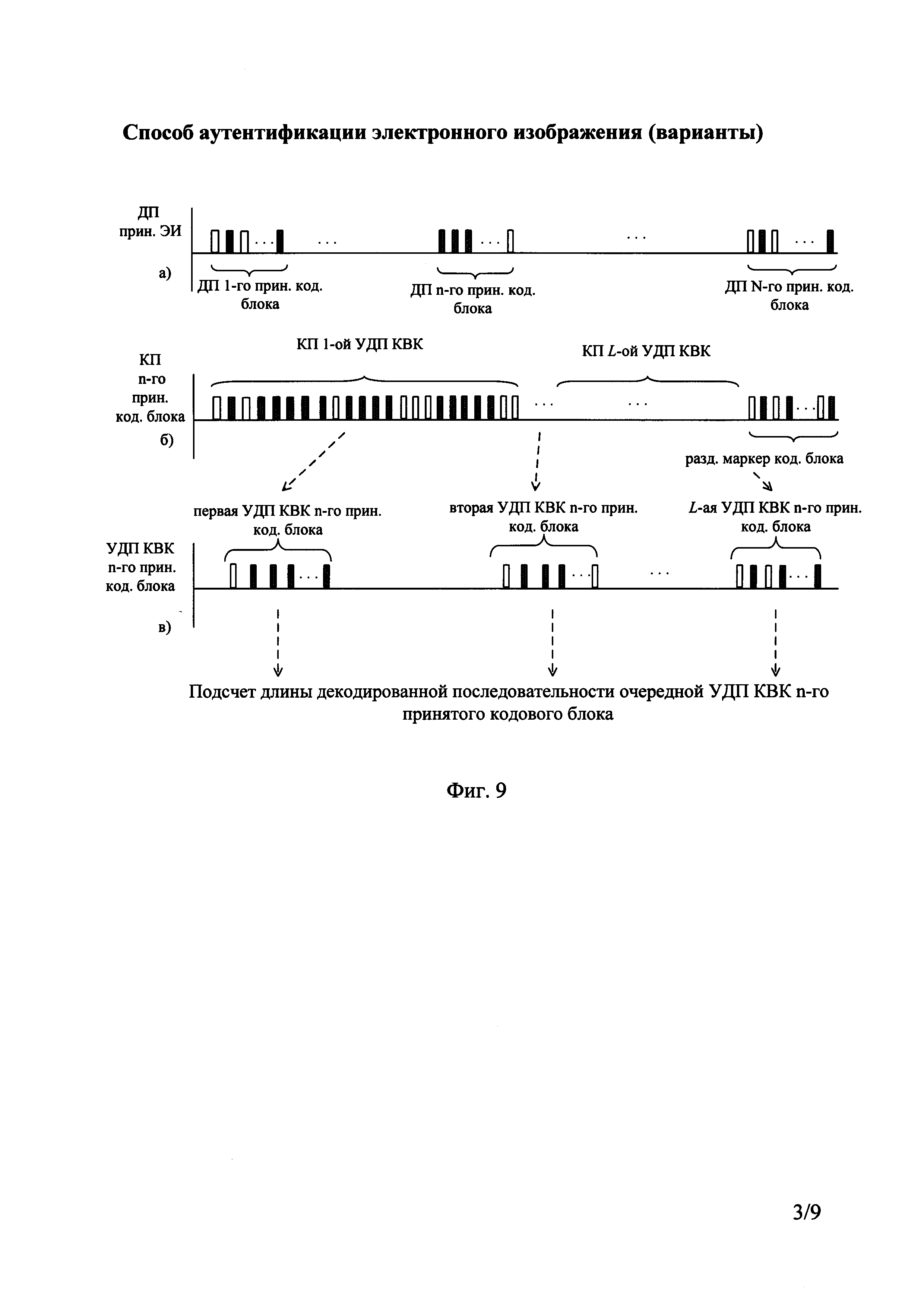 Заявленные технические решения объединены единым изобретательским замыслом и относятся к области электросвязи и информационных технологий, а именно к технике защиты подлинности электронных изображений (ЭИ), сжимаемых алгоритмами сжатия ЭИ, такими как JPEG2000, Н.264 и т.п., передаваемых отправителем получателю по общедоступным каналам передачи, в которых нарушитель может осуществлять действия по навязыванию получателю неподлинных ЭИ. Заявленные объекты изобретения могут быть использованы для обеспечения подлинности ЭИ, передаваемых в современных информационно-телекоммуникационных системах. Известны способы аутентификации ЭИ на основе вычисления отправителем и проверки получателем имитовставки двоичной последовательности (ДП) этого изображения. Эти способы относятся к криптографическим способам контроля подлинности ЭИ и описаны, например, в государственном стандарте 28147-89. Системы обработки информации. Защита криптографическая. Алгоритм криптографического преобразования. - М.: Госстандарт СССР. 1989, стр. 9-14. В данных способах ЭИ сжимают в соответствии с алгоритмом JPEG2000, предписанным международным стандартом ISO/IES 15444. Двоичную последовательность сжатого электронного изображения JPEG разделяют у отправителя на последовательные блоки длиной n бит, где обычно n=64. По криптографической функции формирования имитовставки с использованием заранее сформированной для отправителя и получателя двоичной последовательности (ДП) секретного ключа (СК) последовательно от каждого блока с учетом предыдущего зашифрованного блока формируют зашифрованный текущий блок до тех пор, пока поступает ДП ЭИ. Из последнего зашифрованного блока выделяют ДП имитовставки ЭИ длиной l<n бит.Затем ДП ЭИ и ДП имитовставки передают по каналу связи или записывают на электронные носители, например, CD или DVD диски. Принятое получателем ЭИ проверяют, для чего заново разделяют его ДП на последовательные принятые блоки длиной n бит, по криптографической функции формирования имитовставки с использованием ДПСК последовательно от каждого принятого блока с учетом предыдущего зашифрованного принятого блока формируют очередной зашифрованный принятый блок до тех пор, пока поступает ДП принятого ЭИ. Из последнего зашифрованного принятого блока выделяют длиной l<n бит ДП имитовставки принятого ЭИ и при полном совпадении заново сформированной и принятой имитовставок принятое ЭИ считают подлинным. Недостатками указанных аналогов являются: - невозможность проверки подлинности части аутентифицированного с использованием имитовставки ЭИ; - уменьшение пропускной способности каналов передачи или необходимость использования запоминающих устройств большой емкости из-за включения и последующей передачи по каналу связи имитовставки электронного изображения. Известны также способы аутентификации ЭИ на основе вычисления и встраивания цифровых водяных знаков (ЦВЗ) в электронное изображение. Эти способы относятся к стеганографическим способам контроля подлинности ЭИ и описаны, например, в способе аутентификации ЭИ по патенту США 7313696 МПК H04L 9/00 (2006.01) от 25.12.07. Данный способ аутентификации ЭИ заключается в предварительном формировании для отправителя и получателя ДП СК, криптографической функции хэширования и криптографической функции шифрования. У отправител