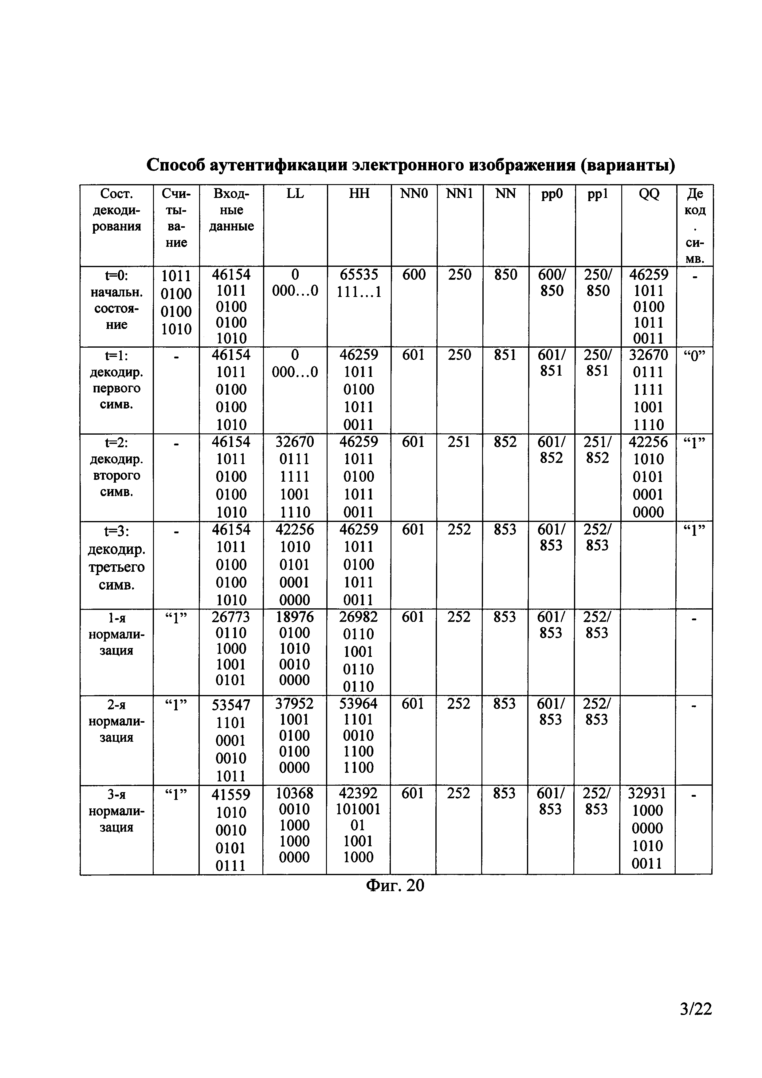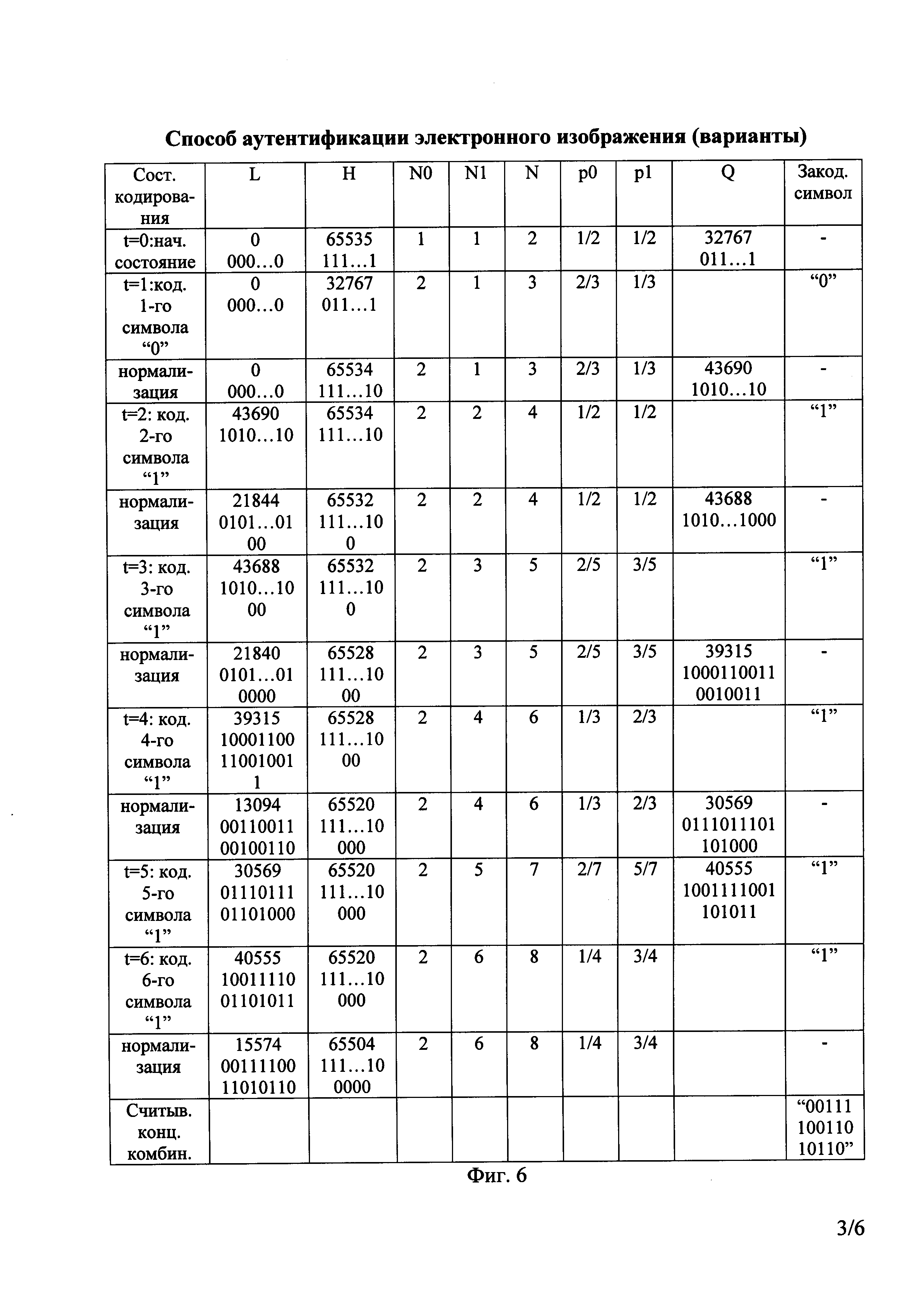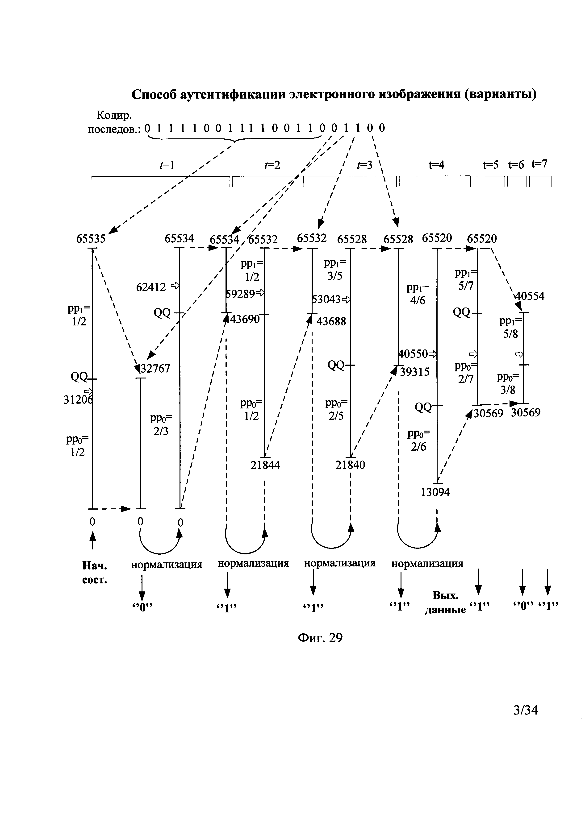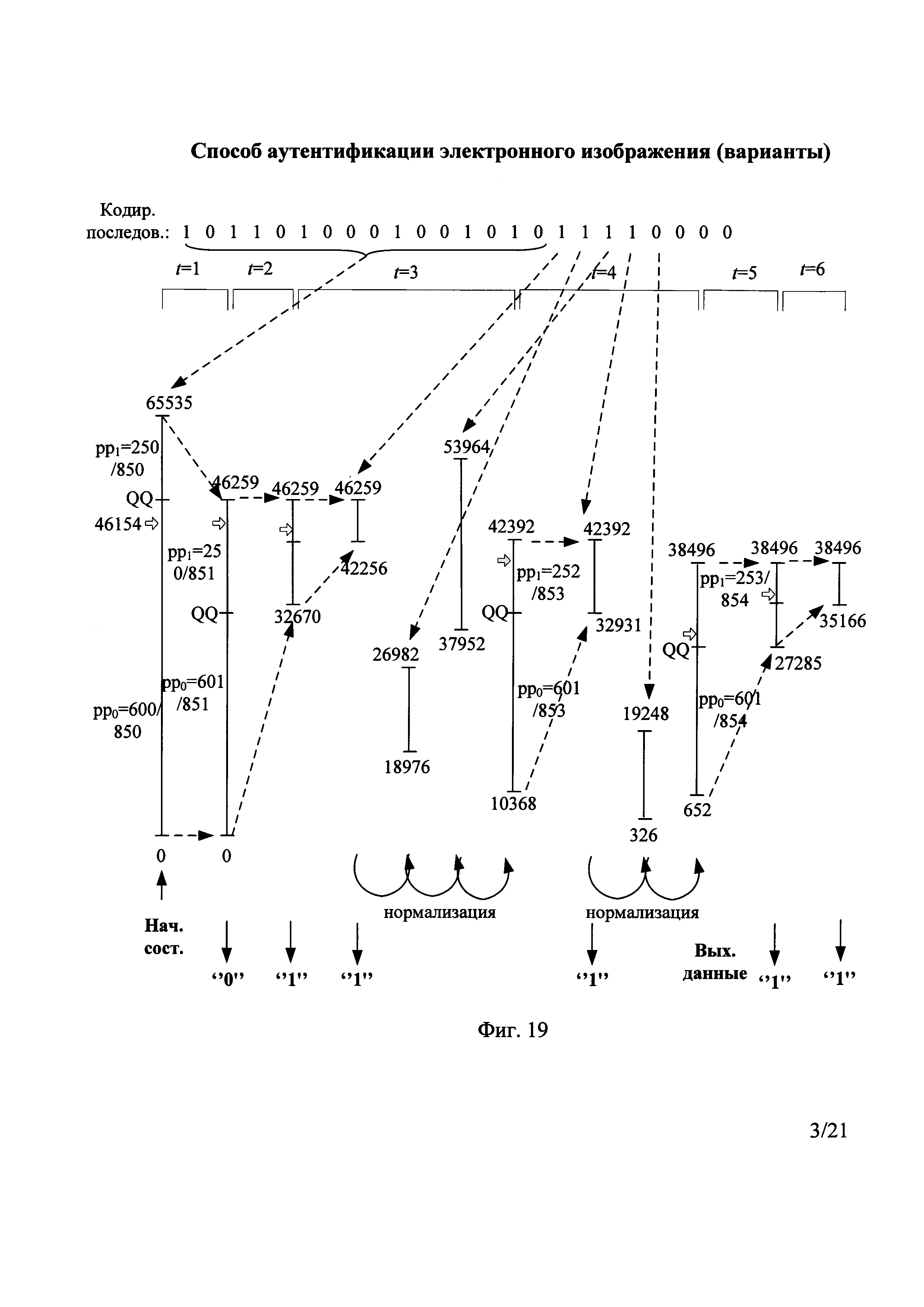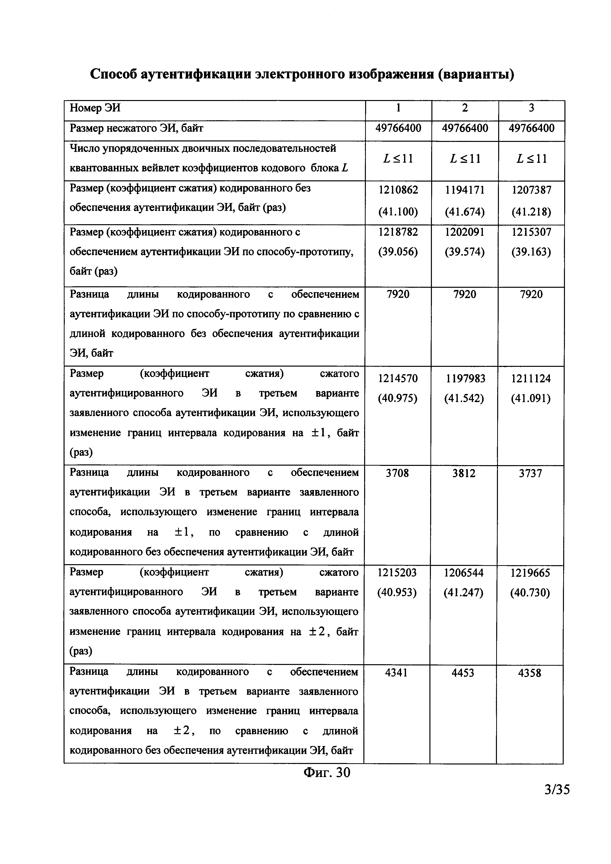Заявленные технические решения объединены единым изобретательским замыслом и относятся к области электросвязи и информационных технологий, а именно к технике защиты подлинности электронных изображений (ЭИ), сжимаемых алгоритмами сжатия ЭИ, такими как JPEG2000, Н.264 и т.п., передаваемых отправителем получателю по общедоступным каналам передачи, в которых нарушитель может осуществлять действия по навязыванию получателю неподлинных ЭИ. Заявленные объекты изобретения могут быть использованы для обеспечения подлинности ЭИ, передаваемых в современных информационно-телекоммуникационных системах. Известны способы аутентификации ЭИ на основе вычисления отправителем и проверки получателем имитовставки двоичной последовательности (ДП) этого изображения. Эти способы относятся к криптографическим способам контроля подлинности ЭИ и описаны, например, в государственном стандарте 28147-89. Системы обработки информации. Защита криптографическая. Алгоритм криптографического преобразования. - М.: Госстандарт СССР. 1989, стр. 9-14. В данных способах ЭИ сжимают в соответствии с алгоритмом JPEG2000, предписанным международным стандартом ISO/IES 15444. Двоичную последовательность сжатого электронного изображения JPEG разделяют у отправителя на последовательные блоки длиной n бит, где обычно n=64. По криптографической функции формирования имитовставки с использованием заранее сформированной для отправителя и получателя двоичной последовательности (ДП) секретного ключа (СК) последовательно от каждого блока с учетом предыдущего зашифрованного блока формируют зашифрованный текущий блок до тех пор, пока поступает ДП ЭИ. Из последнего зашифрованного блока выделяют ДП имитовставки ЭИ длиной l<n бит.Затем ДП ЭИ и ДП имитовставки передают по каналу связи или записывают на электронные носители, например, CD или DVD диски. Принятое получателем ЭИ проверяют, для чего заново разделяют его ДП на последовательные принятые блоки длиной n бит, по криптографической функции формирования имитовставки с использованием ДПСК последовательно от каждого принятого блока с учетом предыдущего зашифрованного принятого блока формируют очередной зашифрованный принятый блок до тех пор, пока поступает ДП принятого ЭИ. Из последнего зашифрованного принятого блока выделяют длиной l<n бит ДП имитовставки принятого ЭИ и при полном совпадении заново сформированной и принятой имитовставок принятое ЭИ считают подлинным. Недостатками указанных аналогов являются: - невозможность проверки подлинности части аутентифицированного с использованием имитовставки ЭИ; - уменьшение пропускной способности каналов передачи или необходимость использования запоминающих устройств большой емкости из-за включения и последующей передачи по каналу связи имитовставки электронного изображения. Известны также способы аутентификации ЭИ на основе вычисления и встраивания цифровых водяных знаков (ЦВЗ) в электронное изображение. Эти способы относятся к стеганографическим способам контроля подлинности ЭИ и описаны, например, в способе аутентификации ЭИ по патенту США 7313696 МПК H04L 9/00 (2006.01) от 25.12.07. Данный способ аутентификации ЭИ заключается в предварительном формировании для отправителя и получателя ДП СК, криптографической функции хэширования и криптографической функции шифрования. У отправител